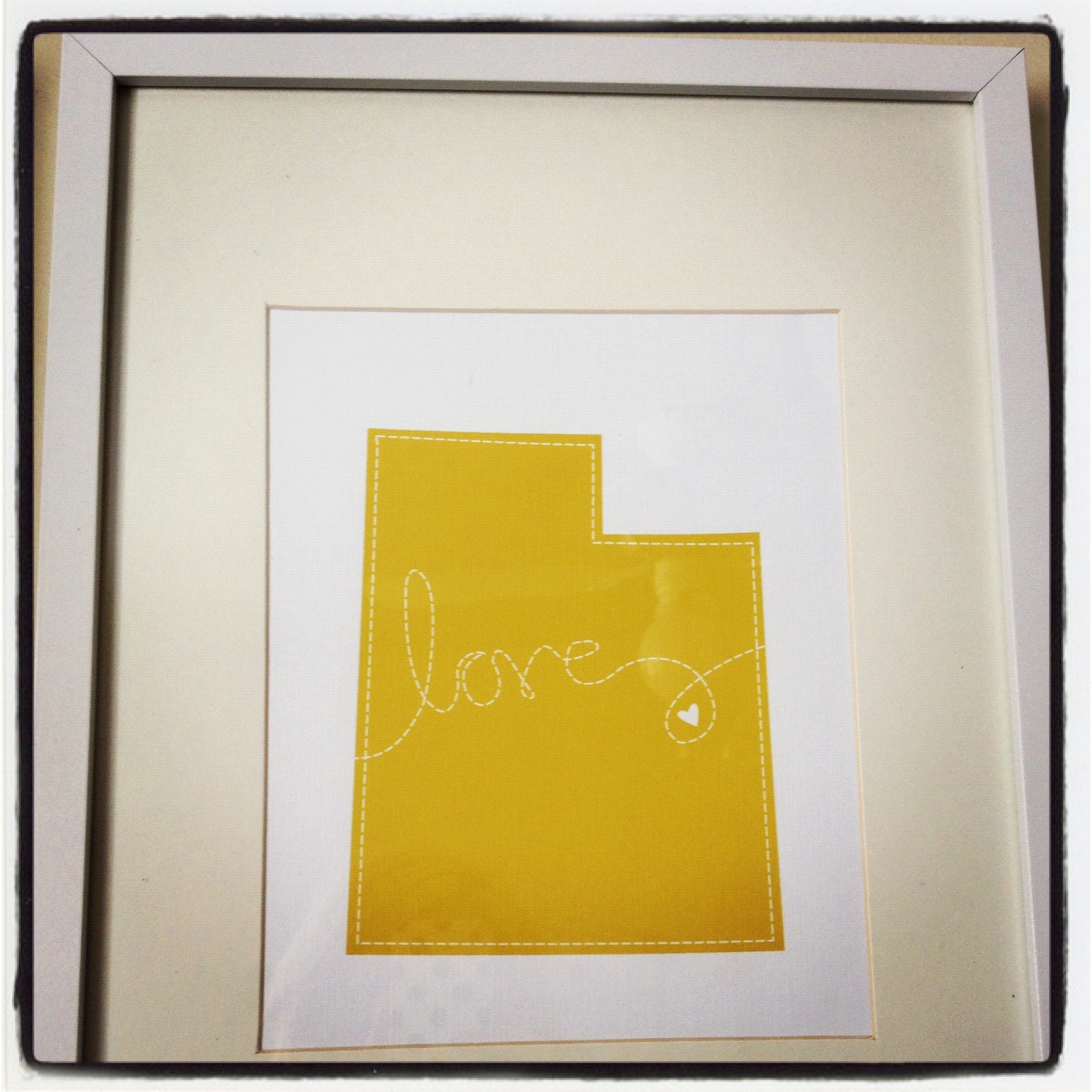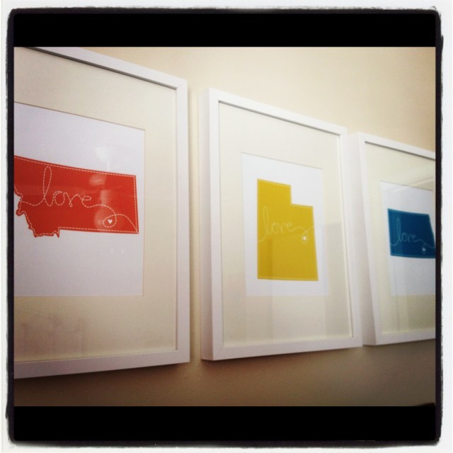 Late in the summer, a friend of mine gave me a darling print of the state of Utah with a little heart around Salt Lake that she had gotten from a cute Etsy shop. I knew it needed the perfect place in our home, and while I was deciding what I wanted to do with it, it dawned on me that it would be a fun idea to contact the Etsy seller (she has SO many cute things you can see here) and see if she would be willing to make me another print of Montana (my home state) and North Dakota (my hubby’s home state) so I could have a little memento of the three places that mean the most to our family to display in our home in the SLC. Fortunately, she obliged and I was able to select the colors that I wanted and ultimately decided to hang them in our colorful guest bedroom, which you can catch a glimpse of here and here.