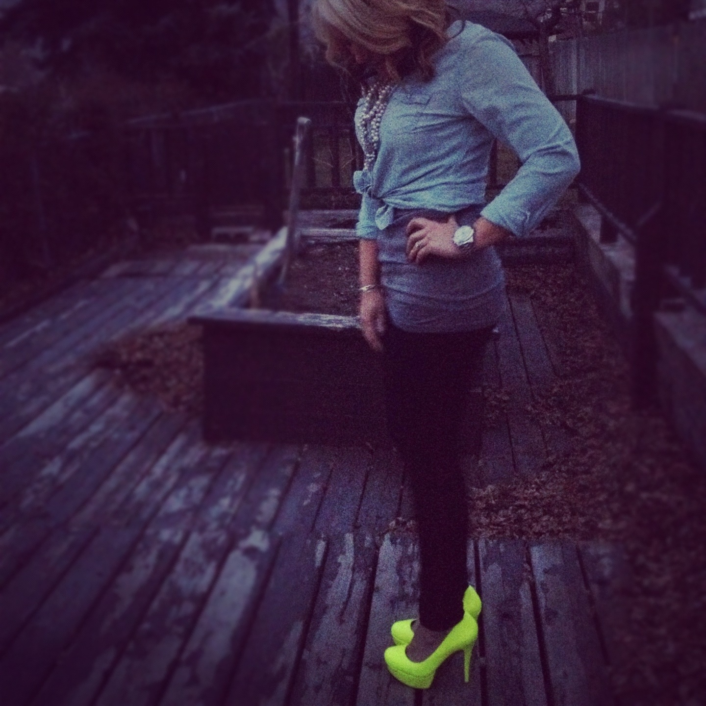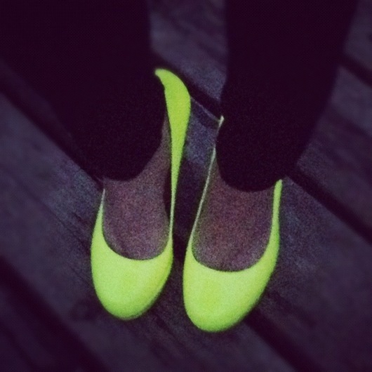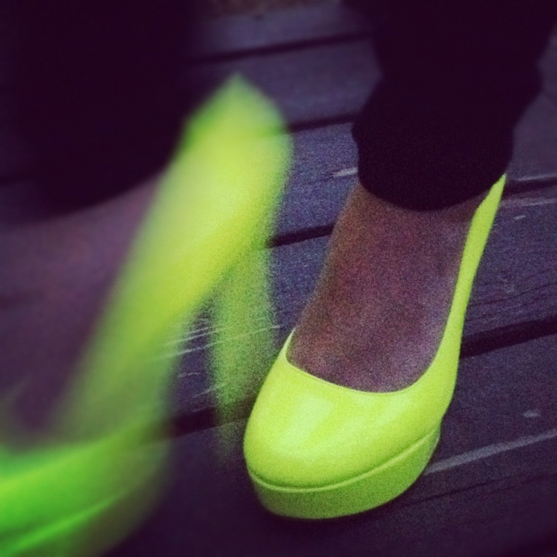 And so, as luck would have it, before I even began my quest for the perfect neon pumps, I had my radio tuned to Wake Up with Taylor on Sirius Cosmo Radio to keep me entertained on my commute to work, and miss Taylor (who I ADORE) was going absolutely crazy for a pair of neon pumps she purchased from Aldo that everyone was mistaking for Manolo Blahniks. Ding! Ding! Ding! JACKPOT!!!! Pretty sure I made a trip to Aldo on my way home that night. 🙂 However, Aldo didn’t have the pumps I was looking for in my size, which led me to discover that Nordstrom is now carrying a line exclusively made for them by Aldo. And guess what they happened to have??? A pair of incredible neon yellow pumps in my size-which also happened to be the absolute last pair they had in stock. So apparently not only was it meant to be, but I am not the only one around here totally enamored with the thought of day-glow tootsies.