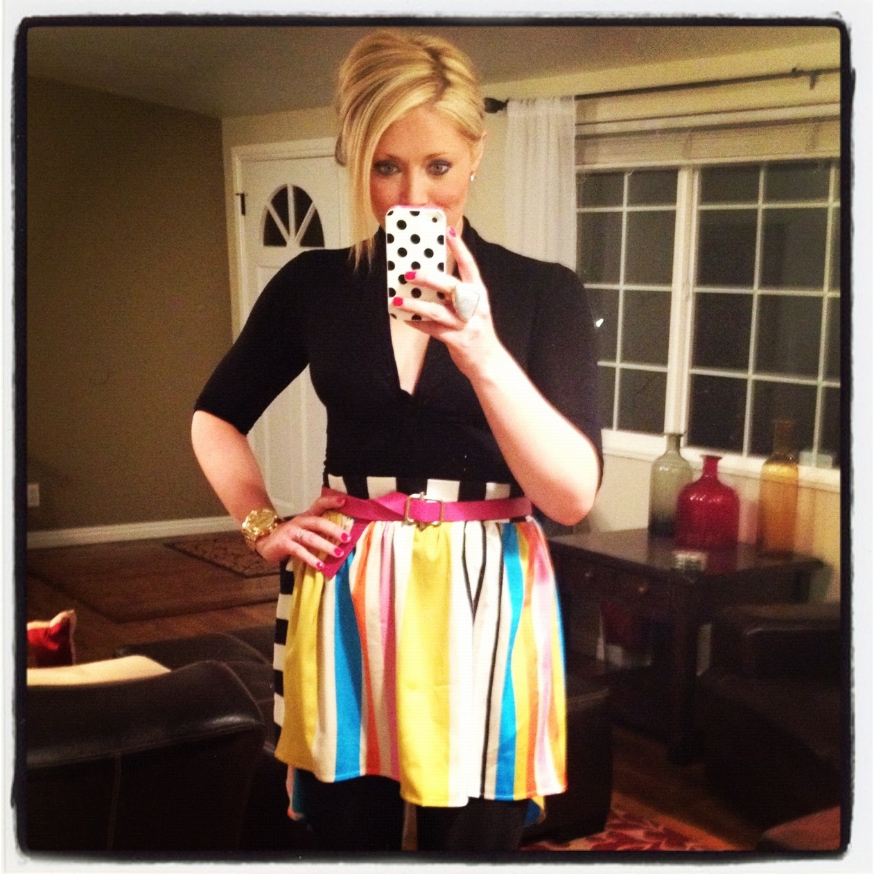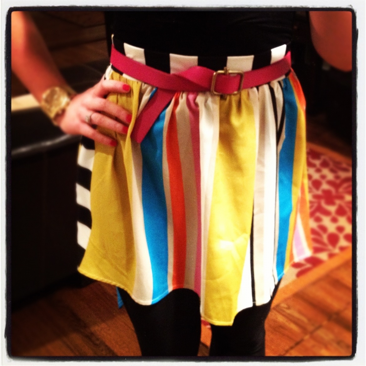 So not only have I found my perfect mullet skirt, but my version is a super fun and flattering silky fabric with a unique striped pattern that I am just in love with. Plus, with all of the colors, it makes for an easy piece to wear a lot of different ways. But this is how I styled it for a date night with my hubby to celebrate his 30th birthday over the weekend. I also gave him the night off and took my own photos so he could put his feet up and relax! Happy, happy birthday to my love!!!