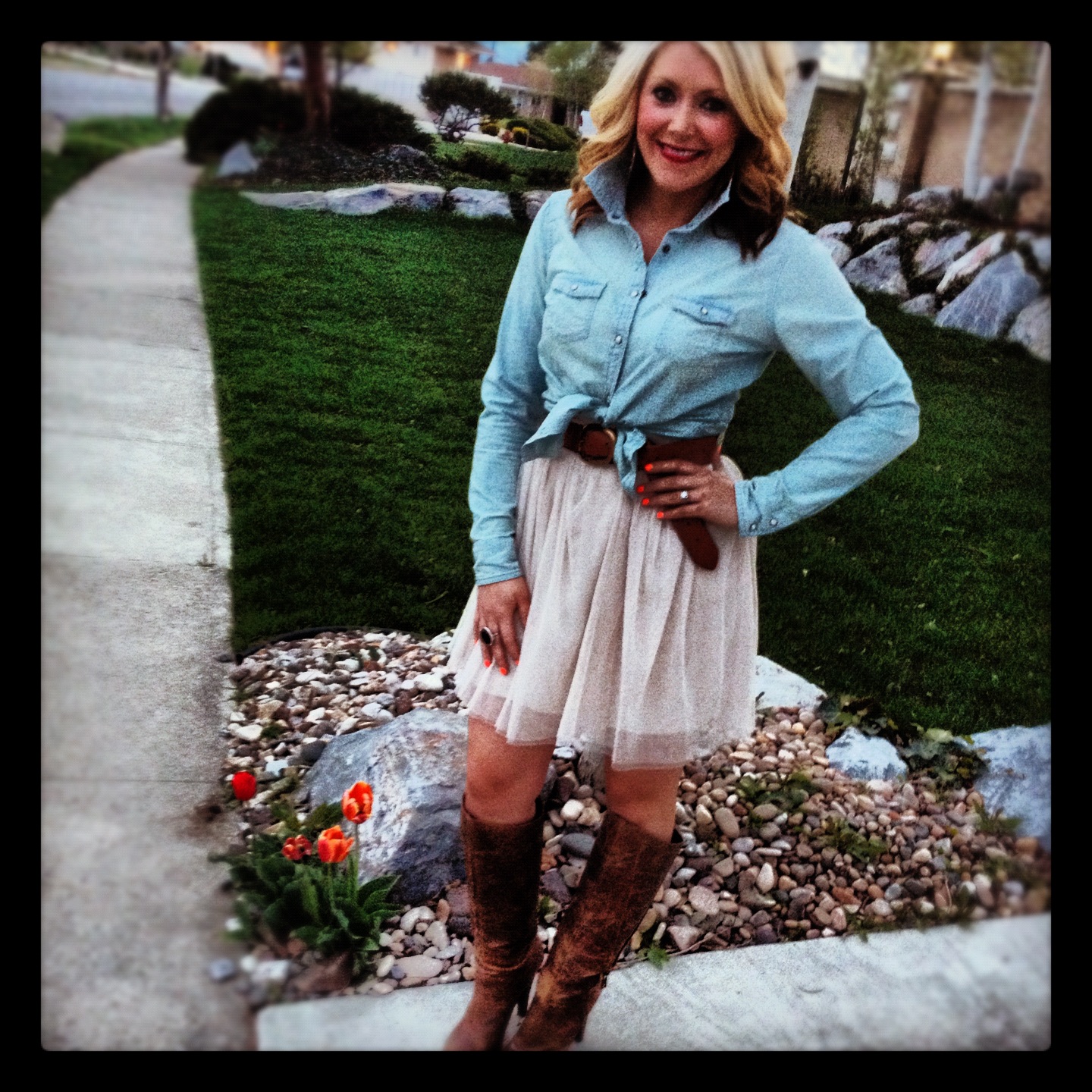 So, who could possibly be more excited that western shirts are making a comeback this year? You guessed it, this girl! I love a great chambray shirt with snap buttons down the front and have for as long as I can remember-so of course have been quick to add a couple to my collection this year. But lucky for all of you city slickers out there, this year’s chambray shirts stretch far beyond country. They are stylish, easy, and fun. And when I was purusing Pinterest a couple of weeks ago patiently waiting for a flight, I spotted a gorgeous image of a gal wearing a chambray shirt with a big tulle skirt and I knew that it was the perfect look for this country girl…