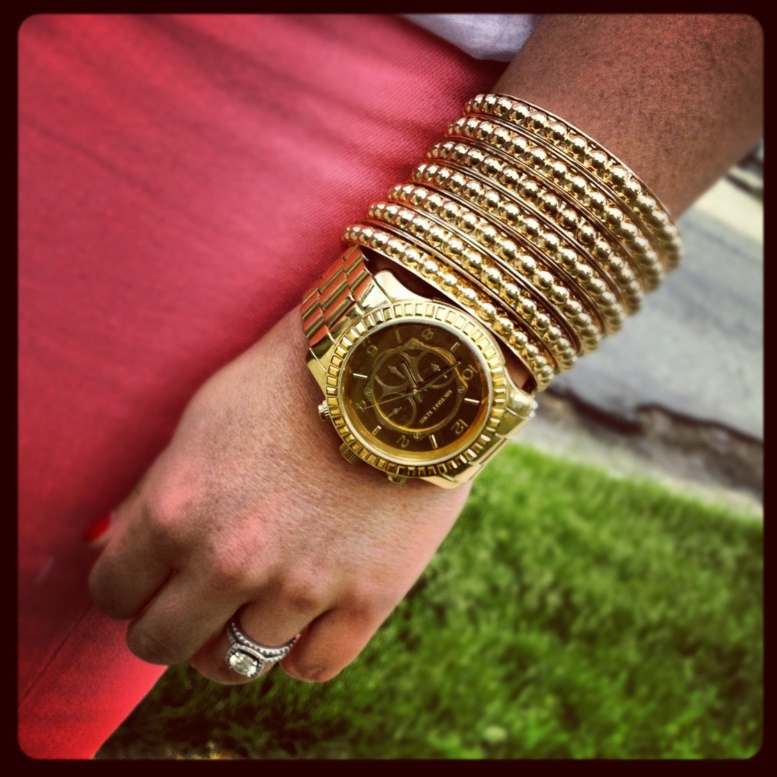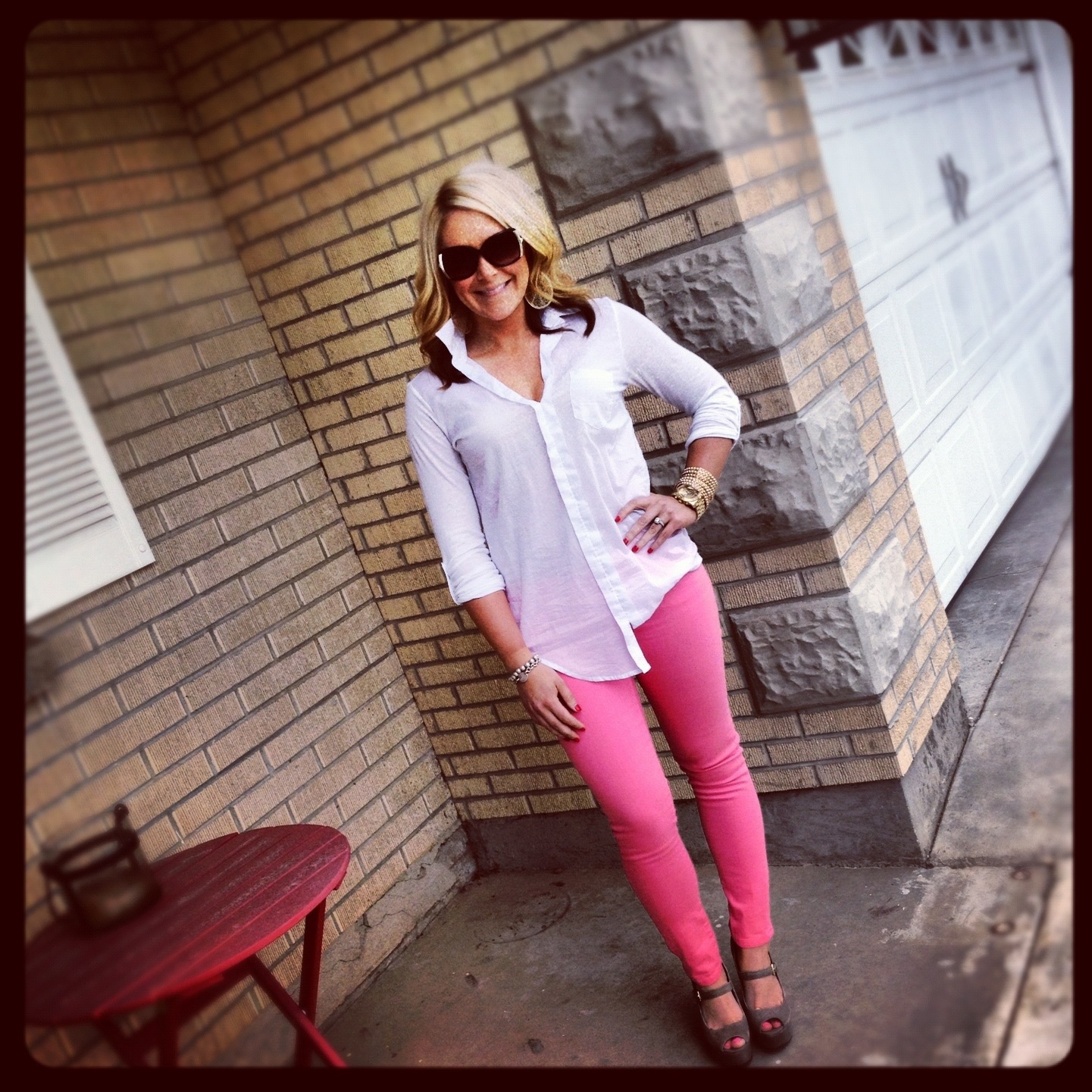 Remember that old acronym from school? Keep it simple stupid (or silly, as I prefer to say)? My very favorite teacher ever (Mr. Armstrong) used to always say that to our class. He also used to say that “pressure makes diamonds” which is a saying I like a lot-and still sometimes use, particularly when I find myself in a stressful situation. But it was K.I.S.S. that popped into my head the other night when I was trying to figure out what to wear with my new pink jeans. As much as I love colored jeans, sometimes it can be easy to over think what exactly to wear with them. I tried on a multitude of options (all of which I like and will eventually share), but I was really drawn to the simplicity of a plain white henley, sky high platforms, and some simple gold earrings and bangles to complete the look.