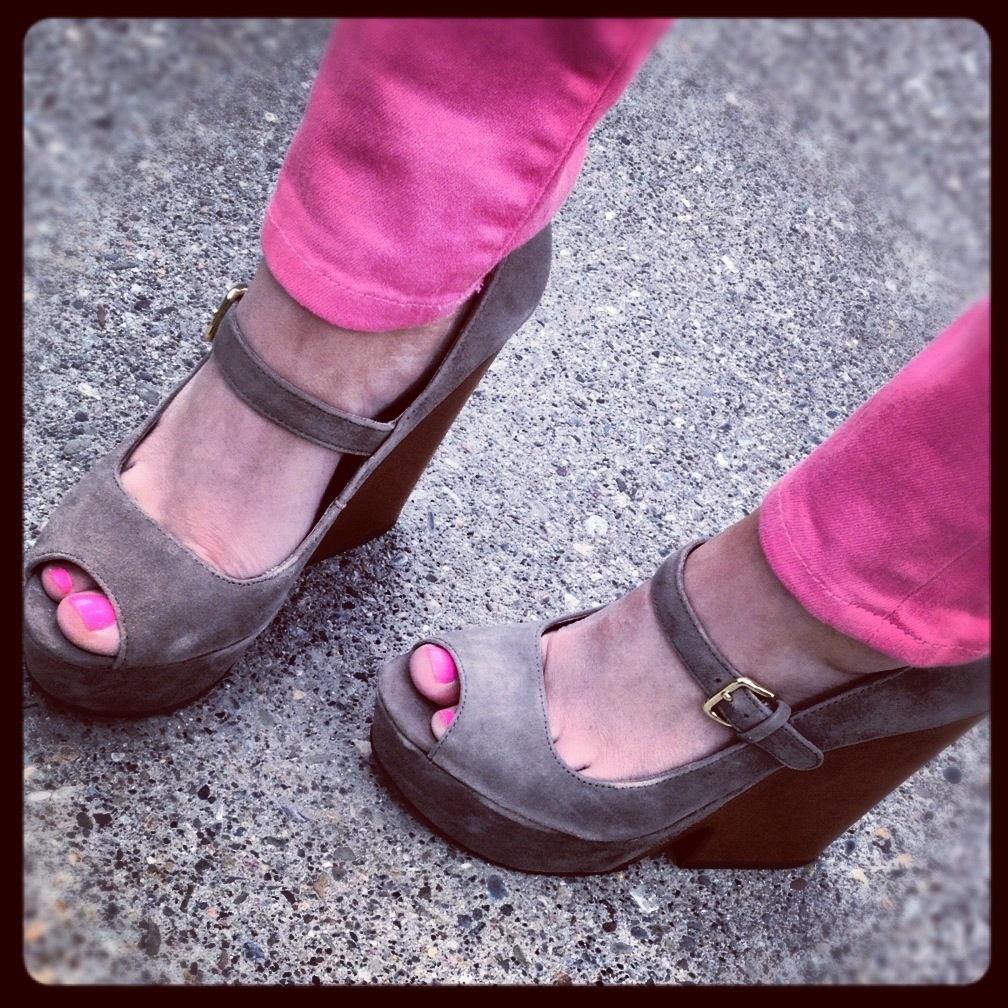 So I have a funny story, or rather a confession, about these shoes. But first of all I should give credit and say that I discovered them only because one of my friends had them first (you can check out her cute blog here) and they looked so fantastic on her, I just couldn’t help myself!! So while these shoes are really, really tall, they are also really, really comfortable. And because I am never one to shy away from high heels, I wore them to work-knowing it was a day I would be on my feet a lot. And it also happened to be a day that my district team decided to walk to a nearby restaurant to grab some lunch on a break between meetings-all of which would have been perfectly fine had I not been talking up a storm and not paying attention which made me miss the big rock lying on the sidewalk that I, of course, stepped directly on. And let me tell you, in shoes this high, there is no chance for recovery. Not only did I fall FLAT ON MY FACE in front of 12 of my co-workers, but there were also about 10 other people in the very nearby vicinity who also witnessed my totally embarrassing debacle. Now I am a clumsy person by nature and have been known to take some rather public tumbles, but this one was particularly humiliating. Fortunately, my injuries were slight and only my knee and my pride were bruised. But despite my “incident” and the lingering embarrassment, they are still one of my favorite pairs of shoes-I just make sure to tread a little more cautiously when I wear them. 🙂