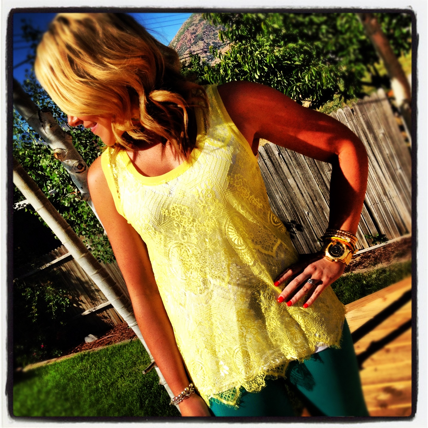 And with so many options and price points to choose from, I have been on the hunt for a perfect lace top for a while and finally found a beautiful cream lace cropped tank at Macy’s a few weeks ago (post to come). So I was surprised when I was recently in Forever21 and found another lace tank that was not only longer, but the color of sunshine and about 1/3 of the price. And I knew instantly that even though it was lace (and yellow), it was a great basic that could work back to skirts, shorts, denim, and even colored denim.