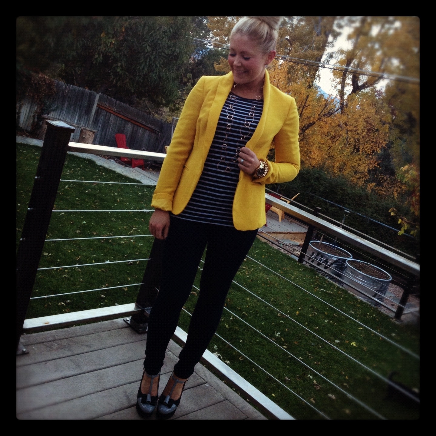 It’s no secret that I love mustard and navy together.  A perfect combination, if you will (which you can read about here and here).   And on top of a great color combination, nothing makes me feel better when getting dressed in the morning than putting a few of my favorite things together-which of the moment are a great blazer, anything striped, and as always, a fantastic pair of shoes.  Because shoes, at least for me, make everything that much better.