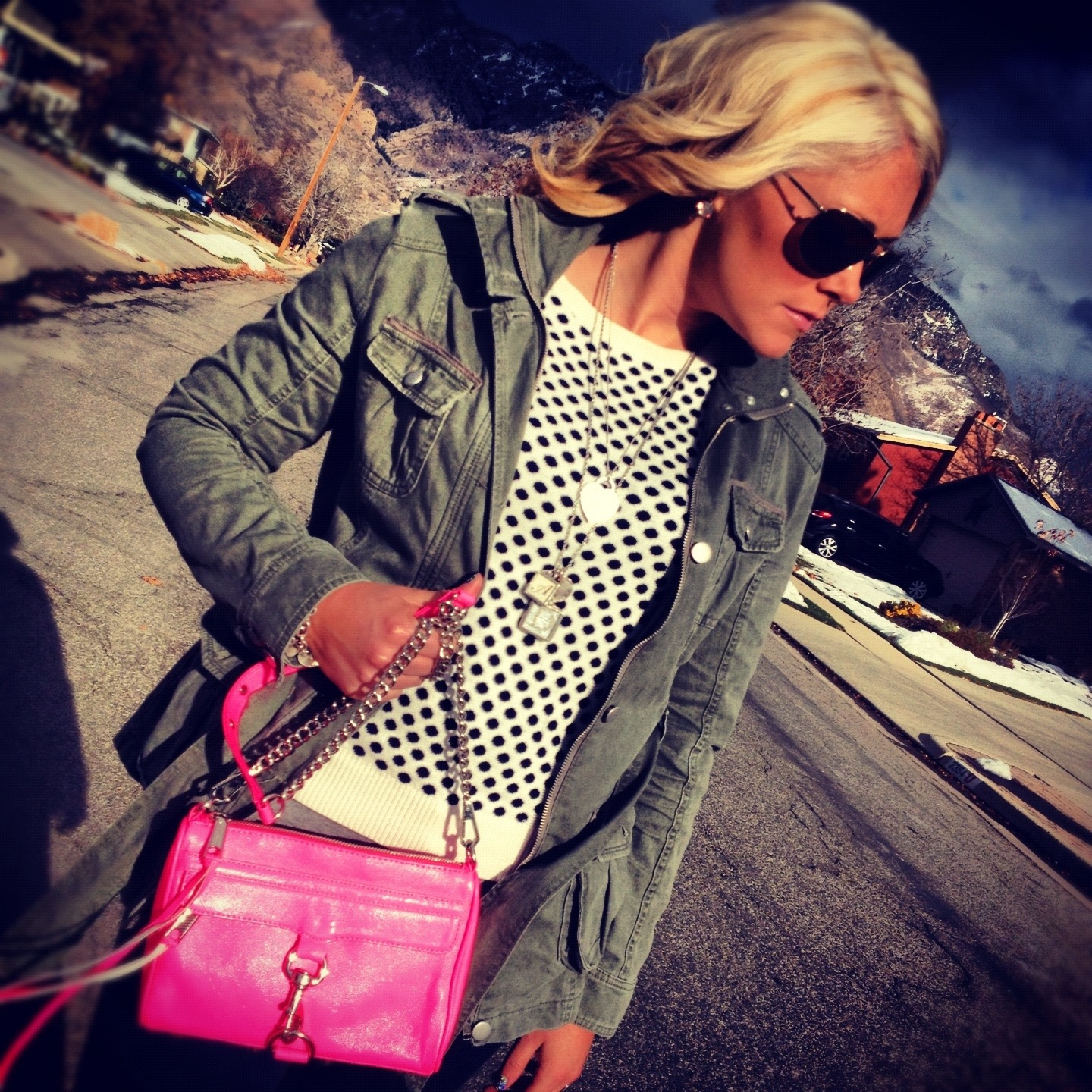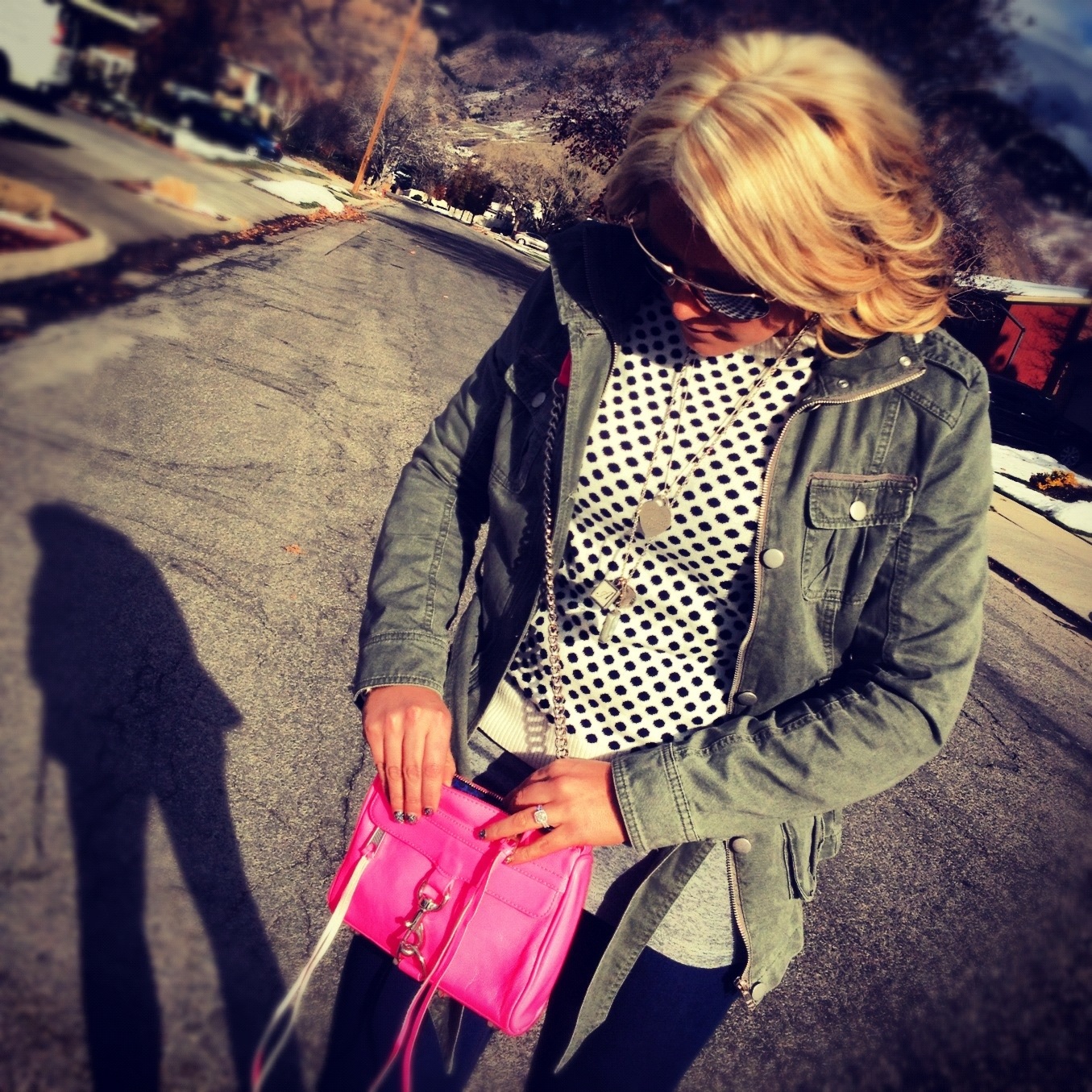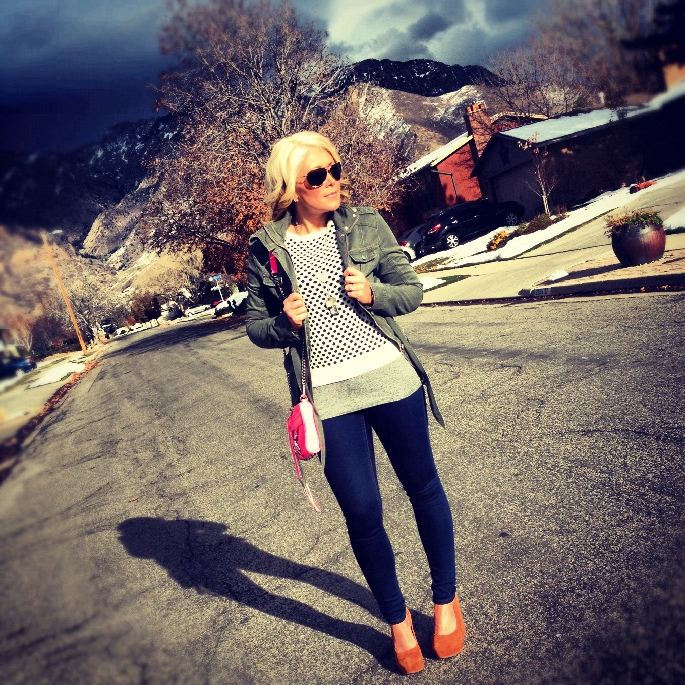 Styling one piece multiple ways can sometimes seem daunting-but it doesn’t have to be that way. To come up with the look in today’s post, I only changed out three items from yesterday’s outfit resulting in a totally revamped look. By trading my gingham shirt for a gray tank, adding my favorite army surplus jacket, and changing my shoes from a patent to a cognac suede wedge, my little polka dot sweater went from dressed up and sweet, to laid back and casual. Easy as one, two, three!