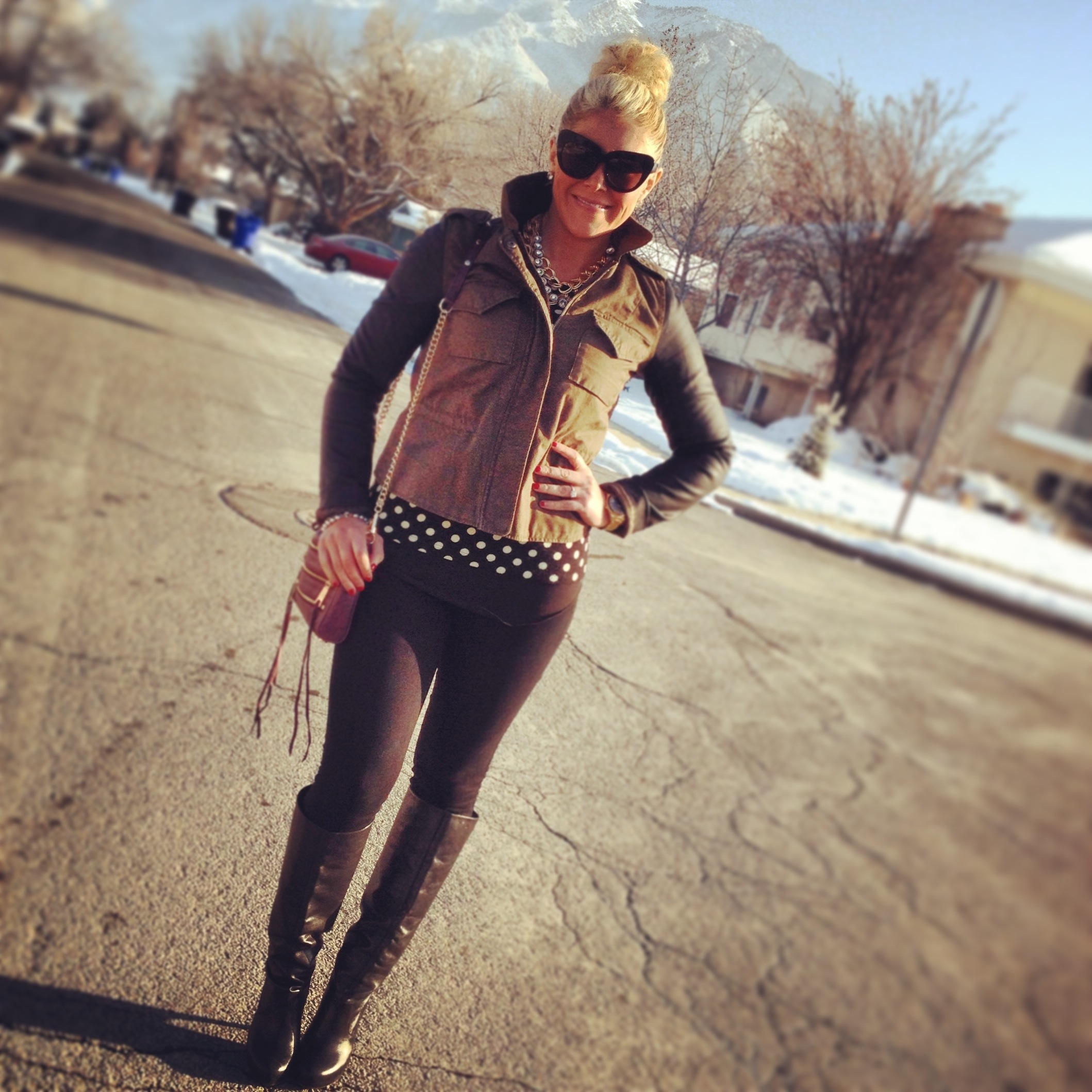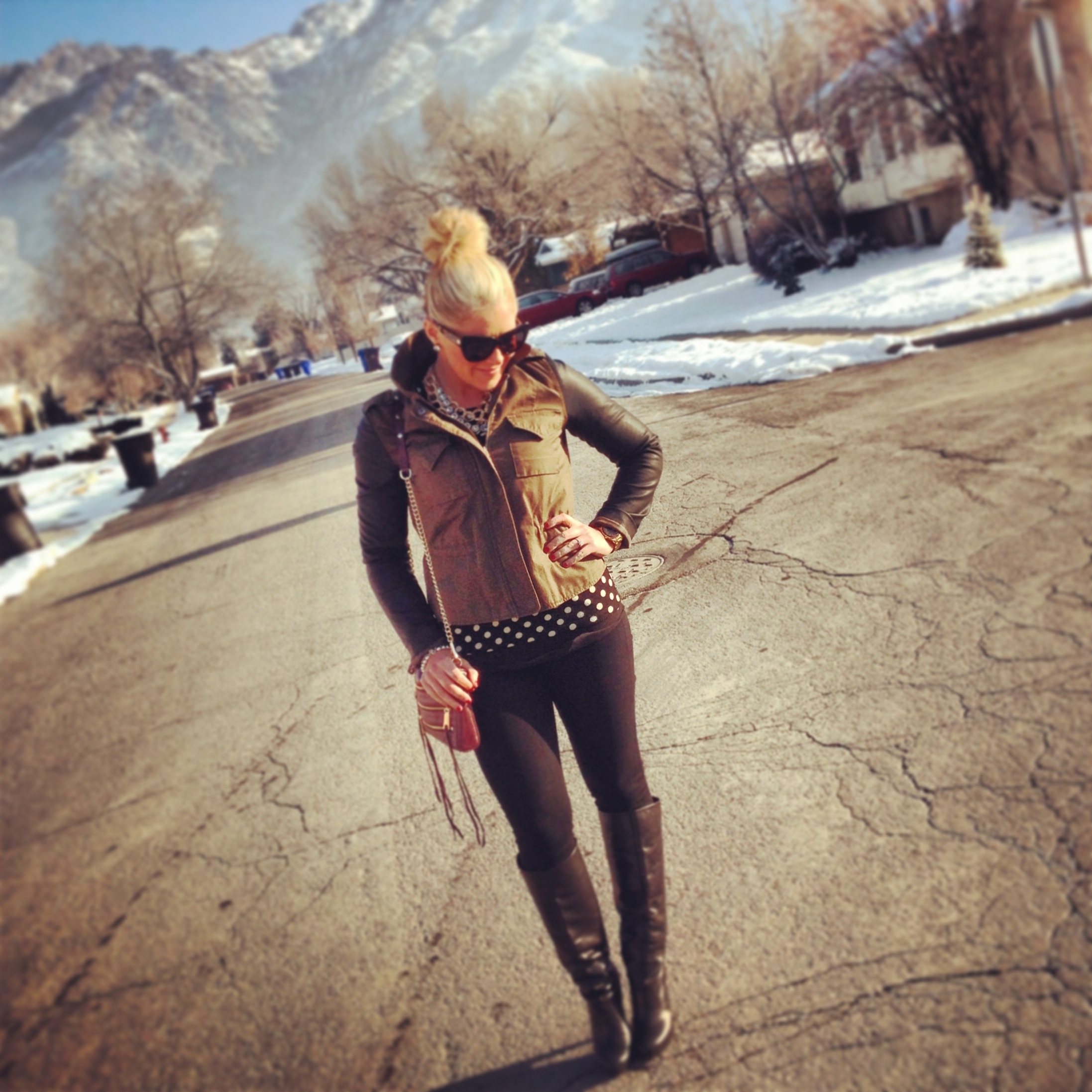 Mixed Media Jacket: American Eagle (sold out) similar, similar | Polka Dot Sweater: Forever21 | Black Skinnies: Else by Joe’s Jeans | Sunnies: House of Harlow Chelsea | Gold Chain Necklace: INC | Rhinestone Necklace: JCrew Factory | Gold Watch: Michael Kors | Silver Bracelets: Tiffany and Co. | Bag: Rebecca Minkoff 5-Zip Bag | Boots: BCBG (old) similar