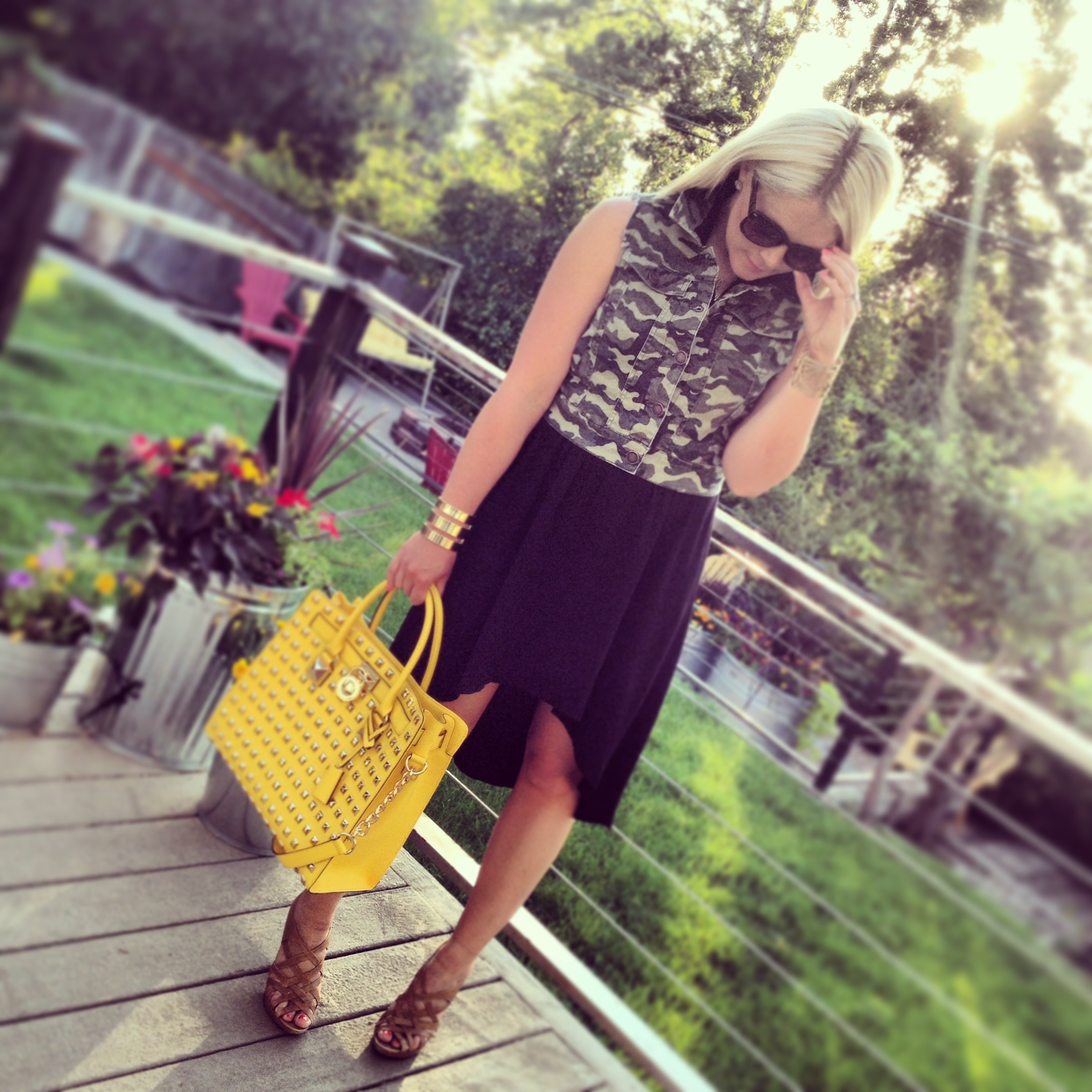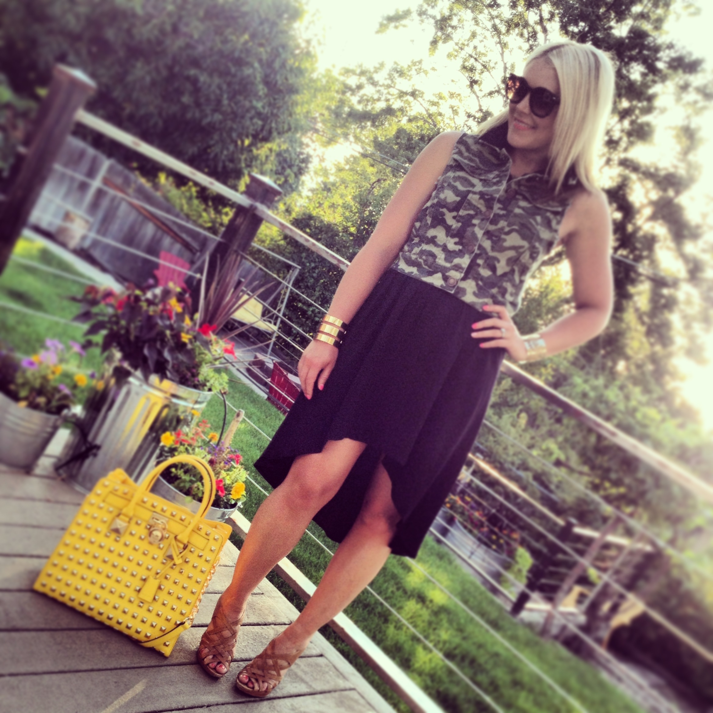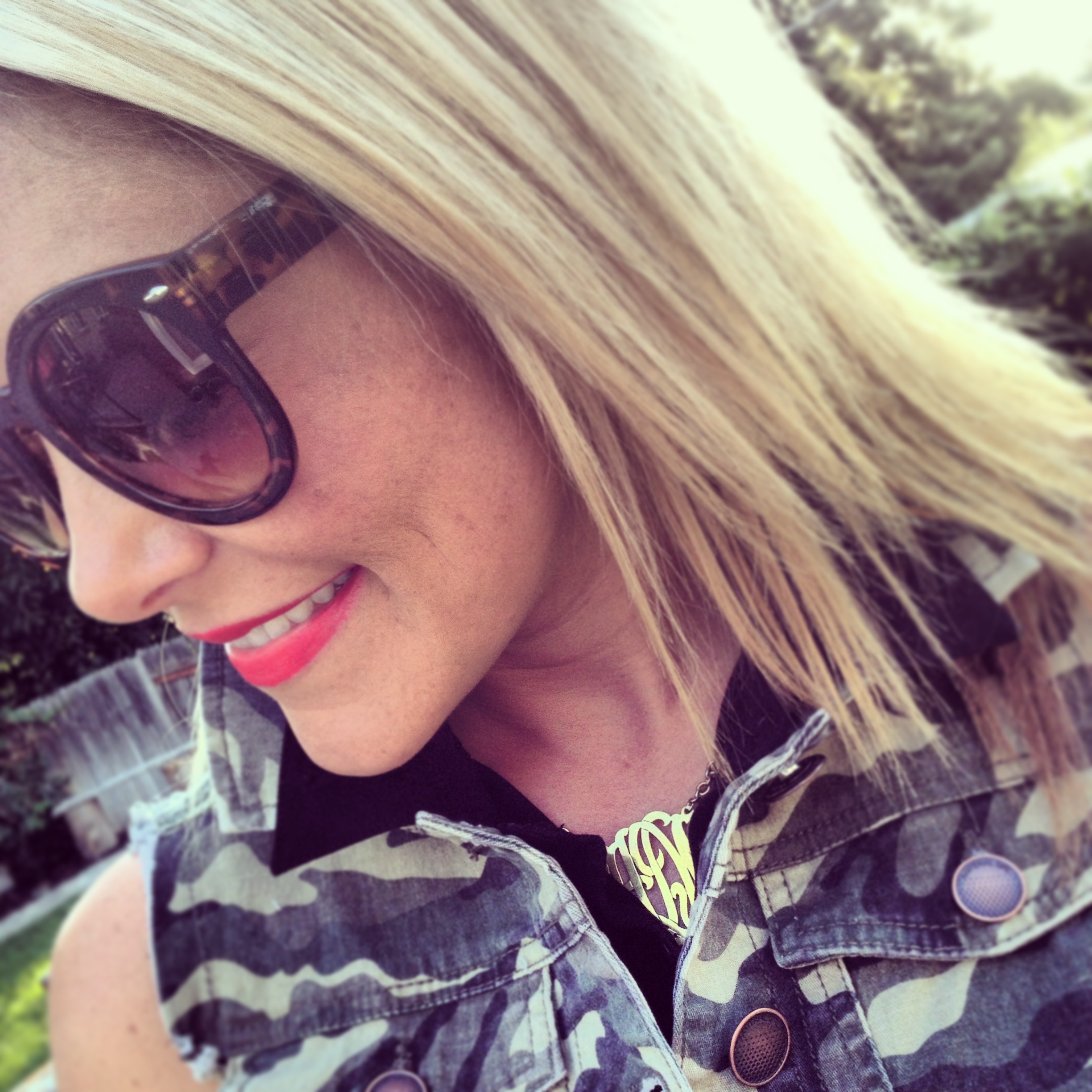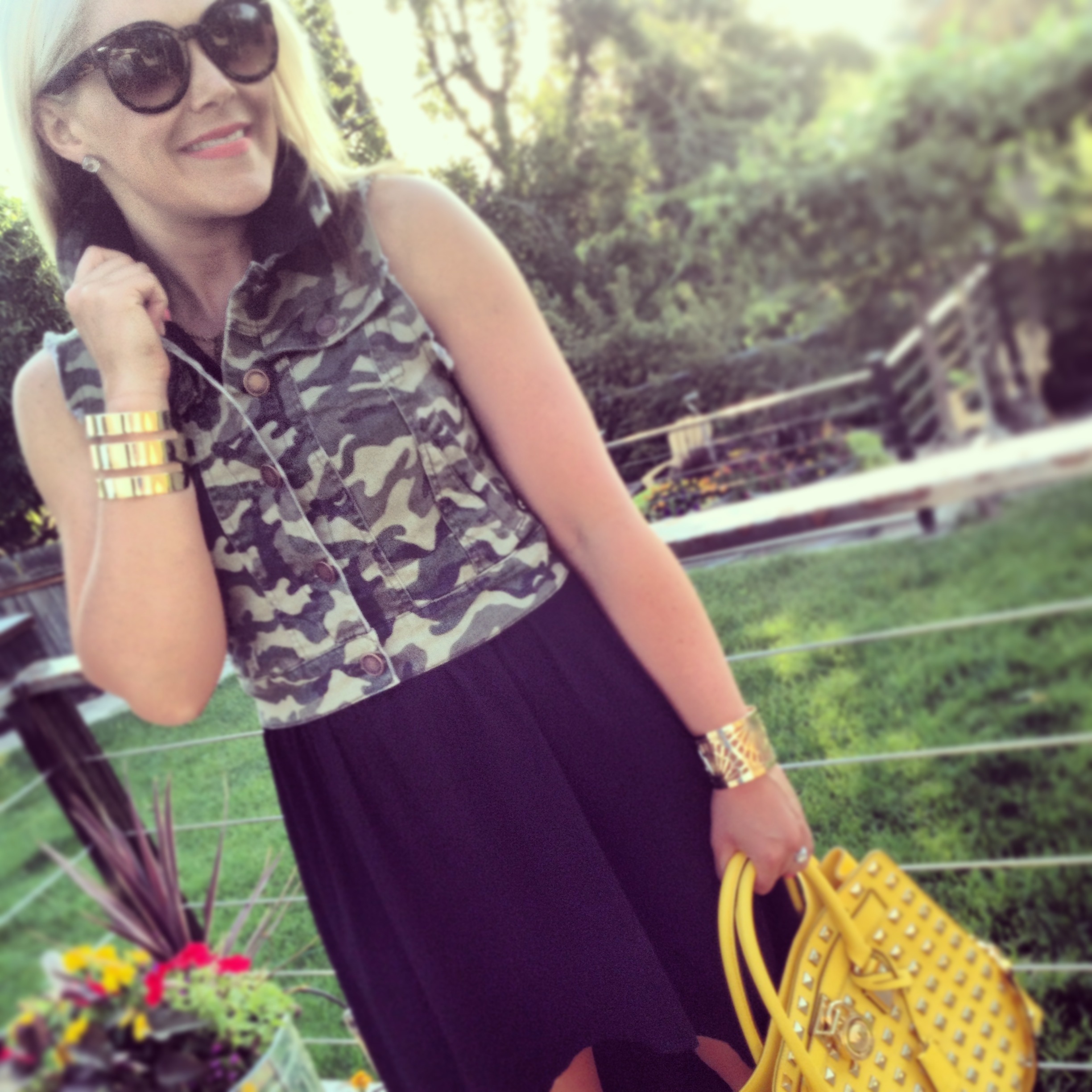 Camo Vest: Macy’s, similar, similar | Dress: Forever21 | Monogram Necklace: Keti Sorely Designs | Bracelets: H&M (old), similar | Sunnies: Amazon | Bag: Michael Kors (sold out) | Sandals: Chinese Laundry Love Me (old), similar