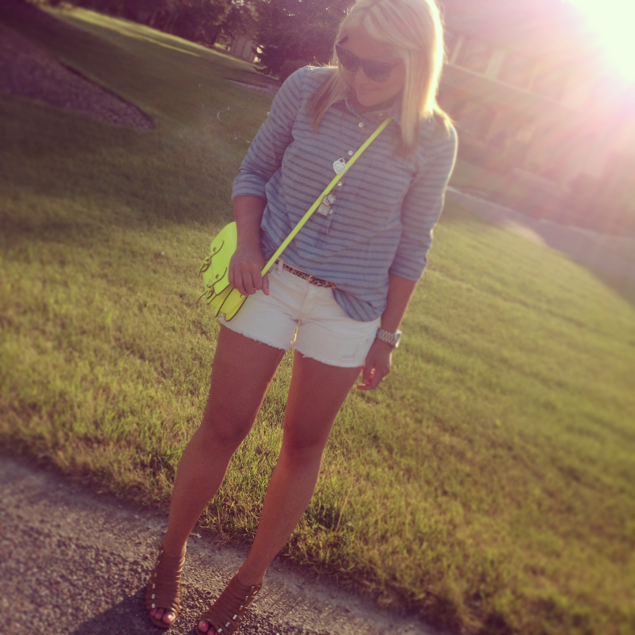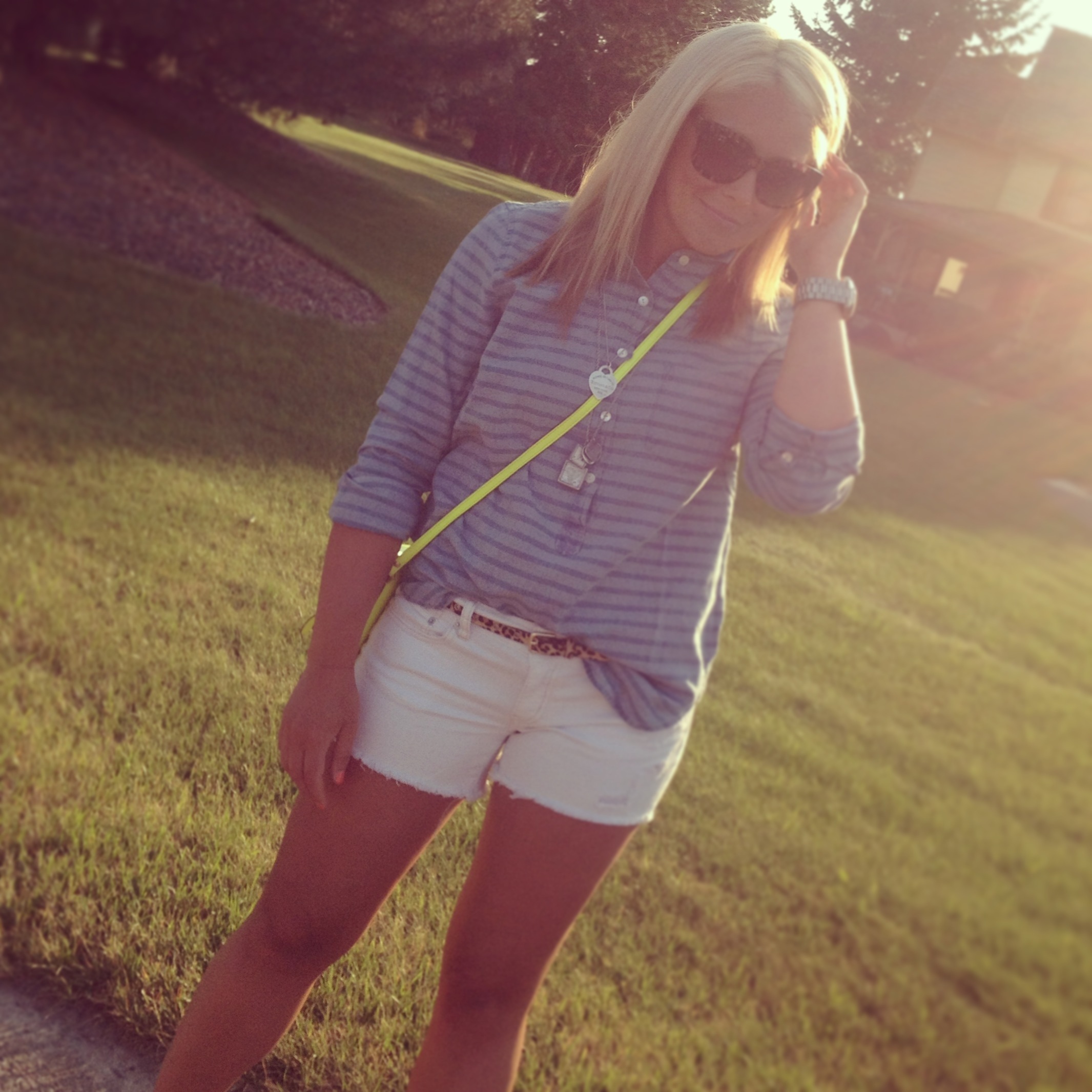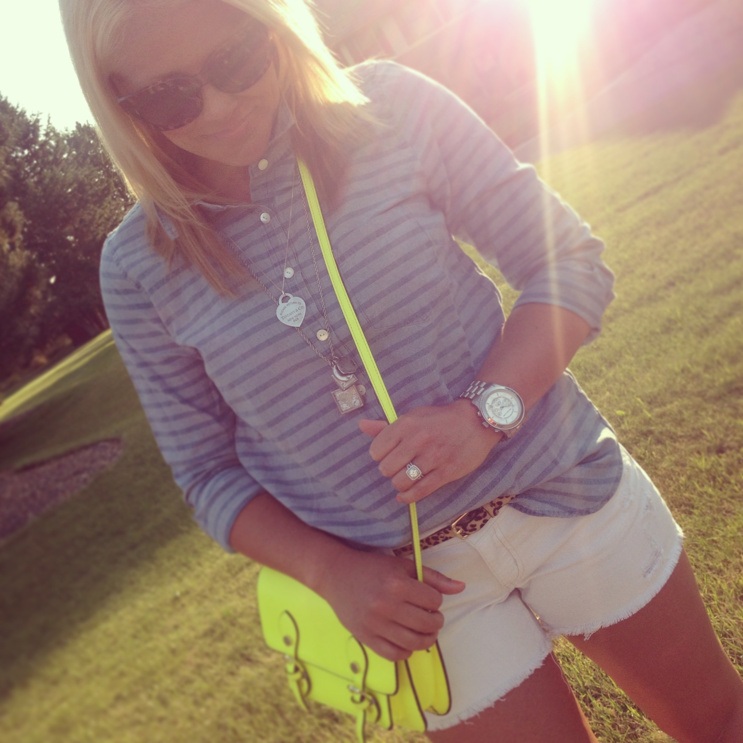 Striped Chambay: JCrew (on sale!) | Shorts: American Eagle (old), similar | Necklaces: Personal Collection of Charms, Tiffany and Co. | Watch: Michael Kors | Sunnies: Gap | Wedges: INC