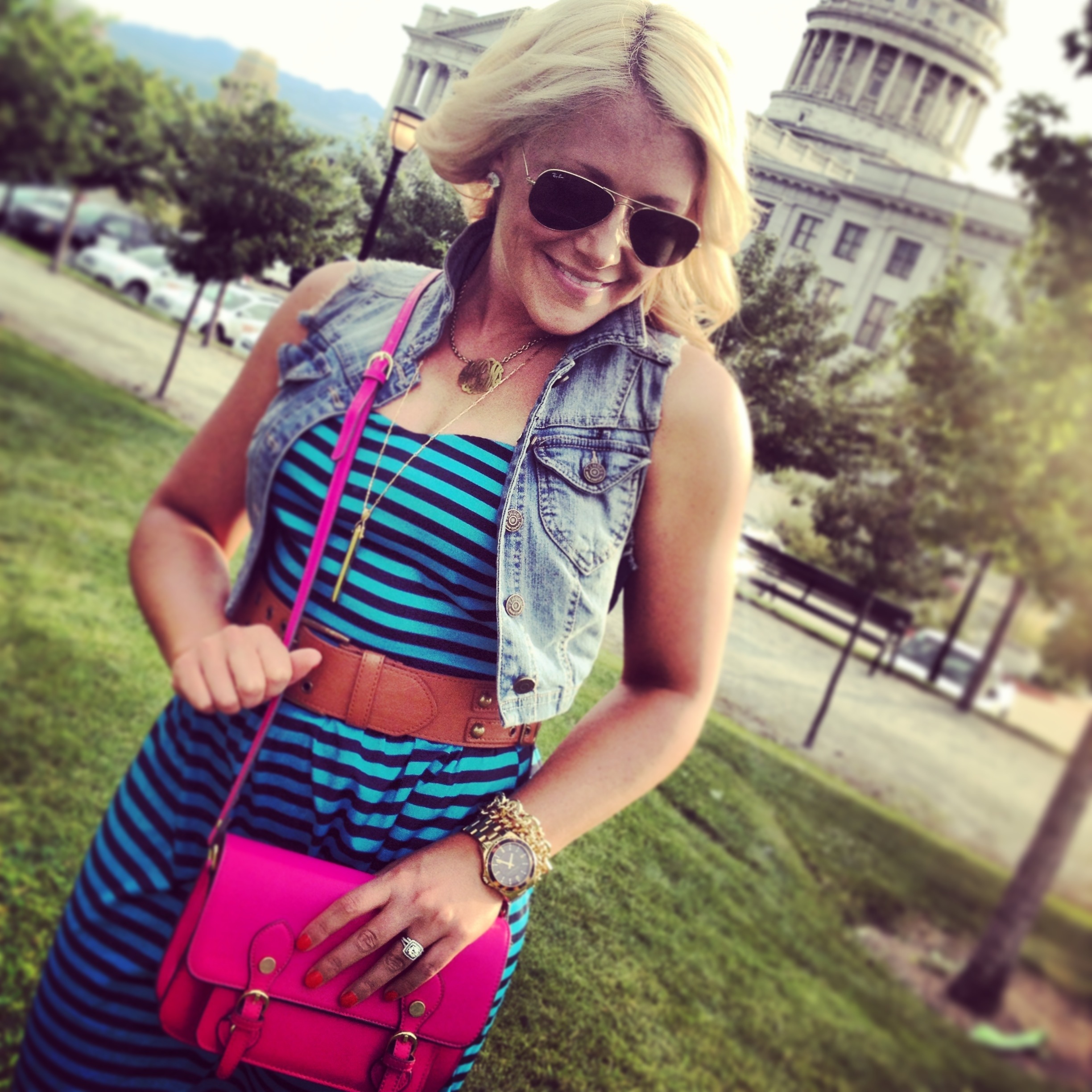 Denim Vest: Macy’s (old), similar, similar | Striped Dress: Francesca’s (old), similar, similar | Necklaces: Keti Sorely Designs, Stella & Dot | Bracelets: JCrew, Stella & Dot | Watch: Michael Kors | Sunnies: Rayban | Purse: Steve Madden (old), similar | Flats: Target (old), similar, similar