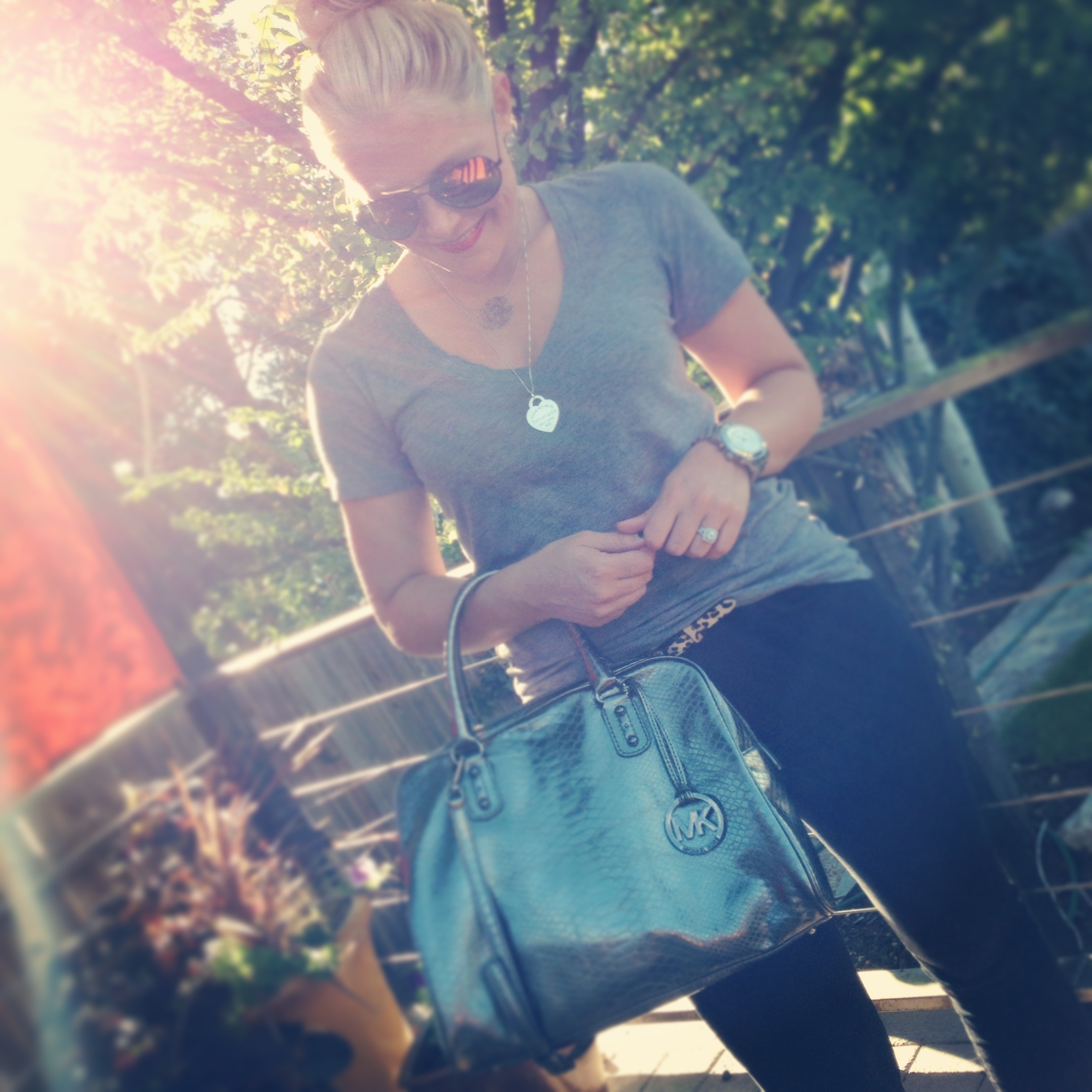 Tee: Victoria’s Secret Pink (BEST v-necks ever) | Skinnies: American Eagle | Necklaces: Tiffany and Co., Kraftshop | Watch: Michael Kors | Sunnies: Target(sold out), similar | Bag: Michael Kors | Pumps: Aldo (old), similar | Lips: Urban Decay Revolution in F-Bomb