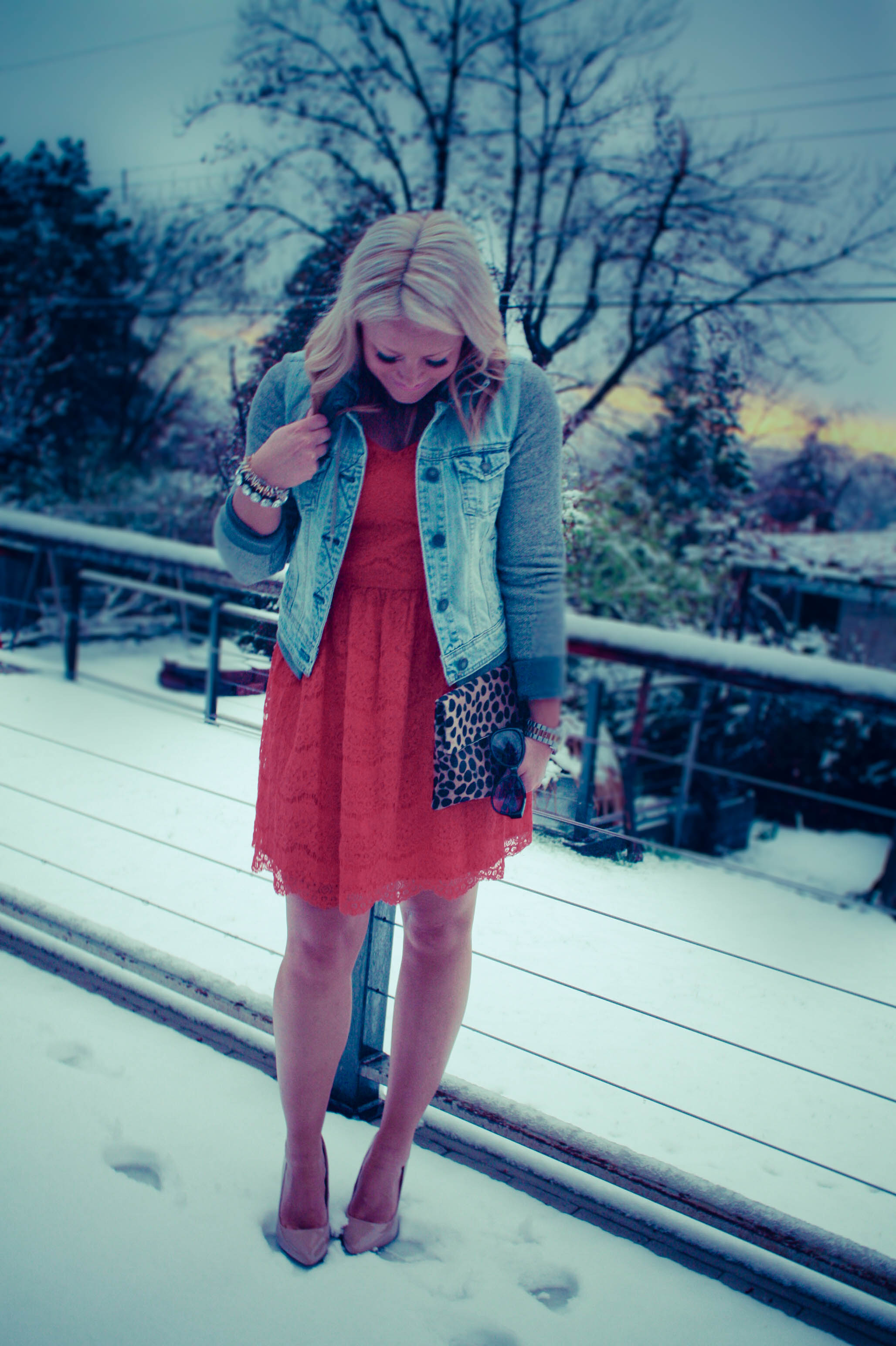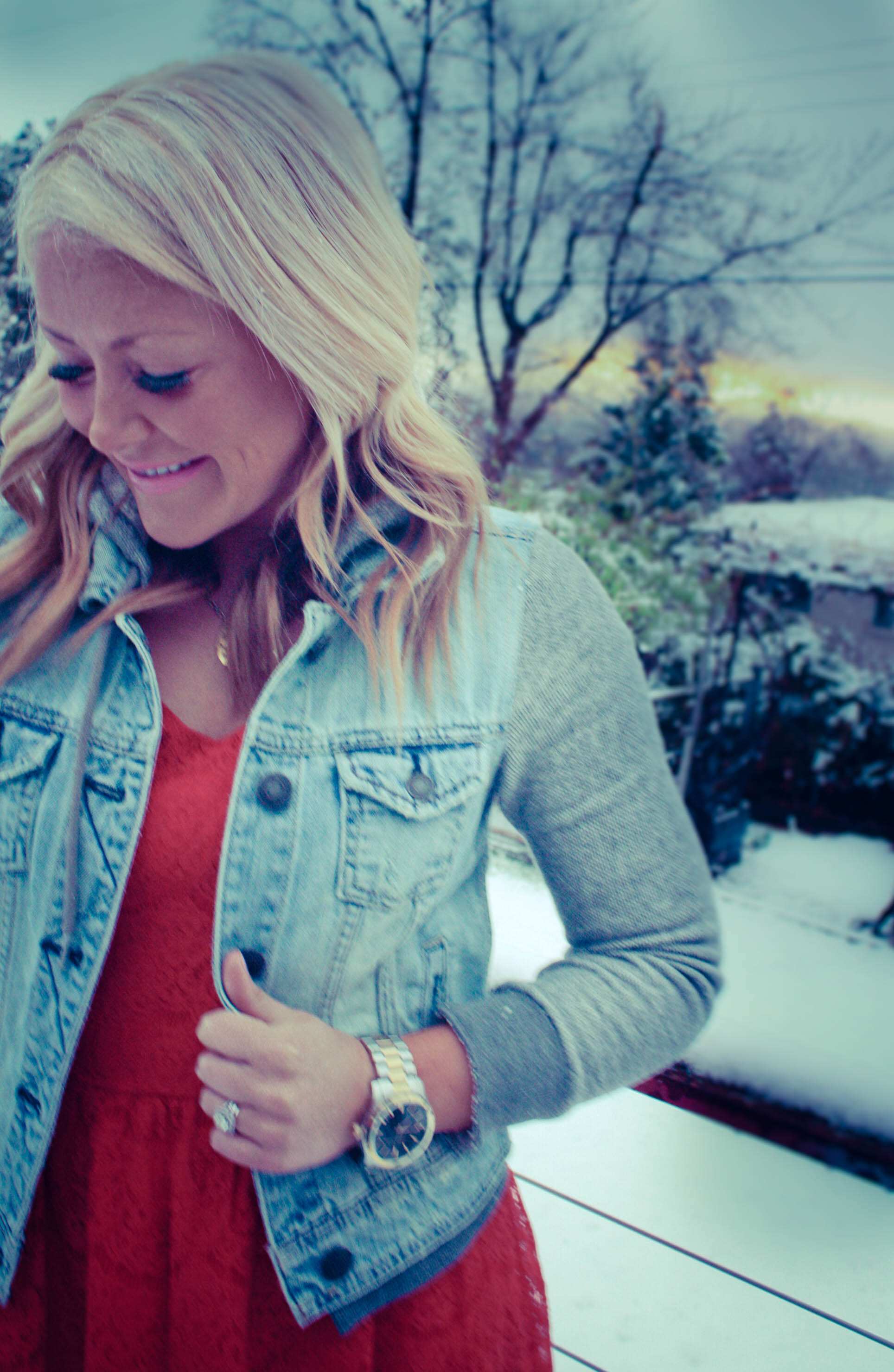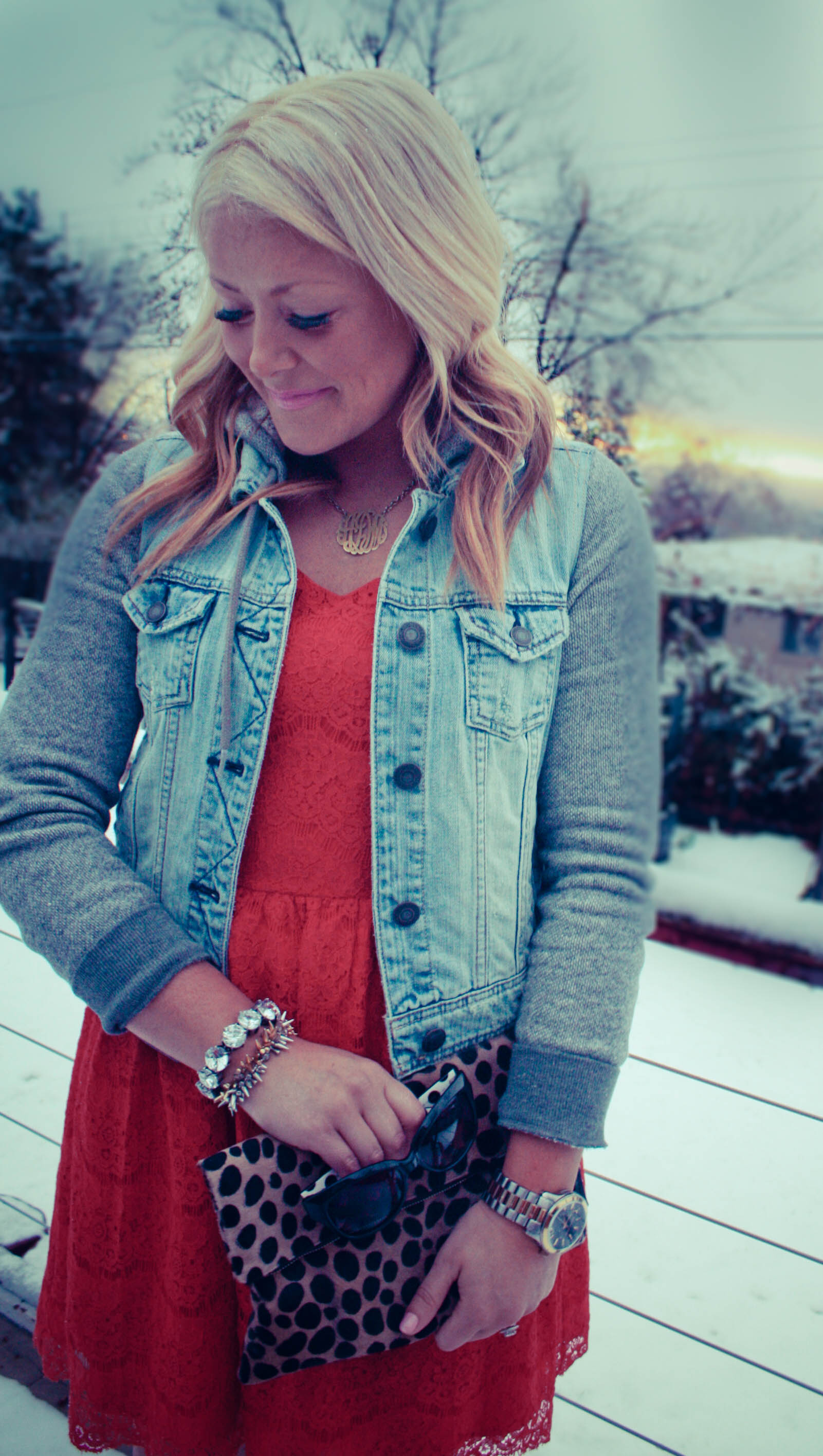 And second, I have to say I am grateful to even be getting a blog up today. I had big regional meetings last week at work-which meant a lot of late nights and early mornings-definitely no time for blog photos. And then over the weekend (when I had planned to catch up), I ended up with a terribly sick hubby AND the SLC had a whirlwind of crazy, stormy weather, including SNOW! Let’s just say, the odds were not in my favor. But fortunately, we were able to sneak in one quick outfit right as the sun went down last night. And I have to say, I am loving my pretty red lace dress paired back to a deconstructed denim jacket (with a hoodie no less). You know me, I always love an unexpected mix of casual and dressy…