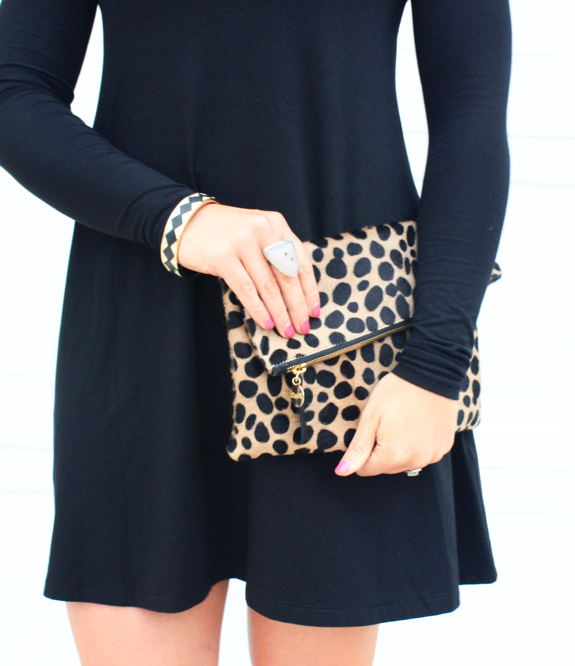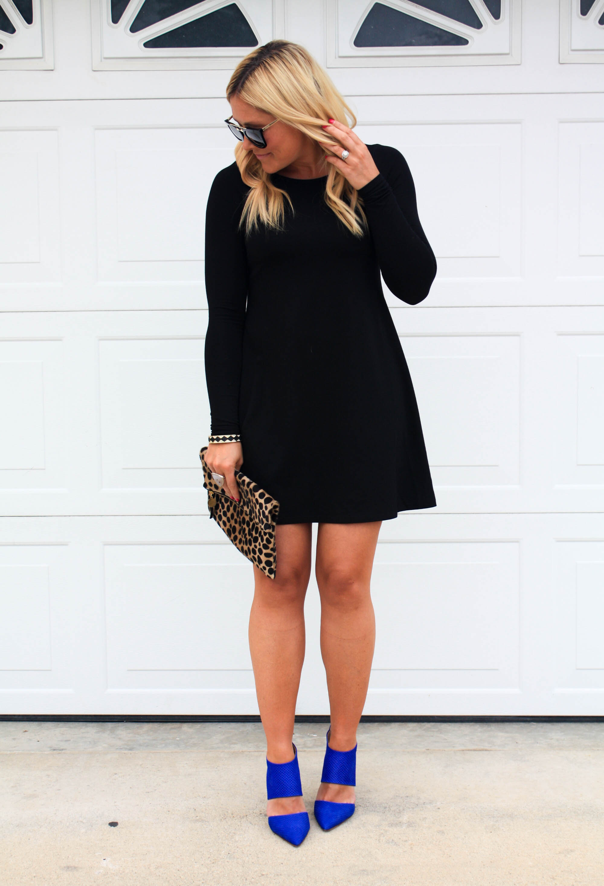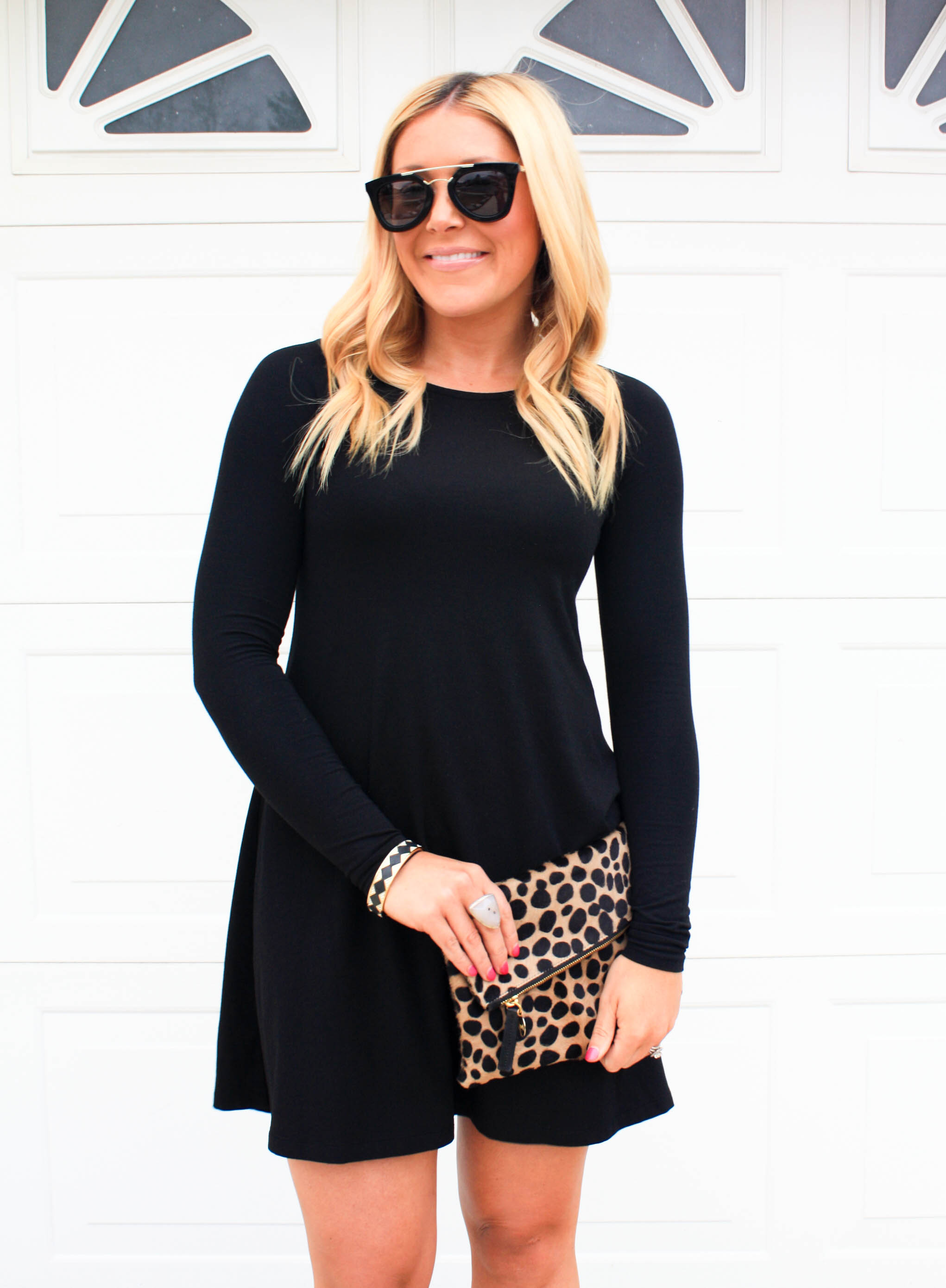 Dress: Express (UNDER $30 and super comfy!!) | Bracelet: House of Harlow c/o Rocksbox | Sunnies: Prada | Clutch: Clare Vivier | Pumps: Vince Camuto (SUPER comfy!!!)