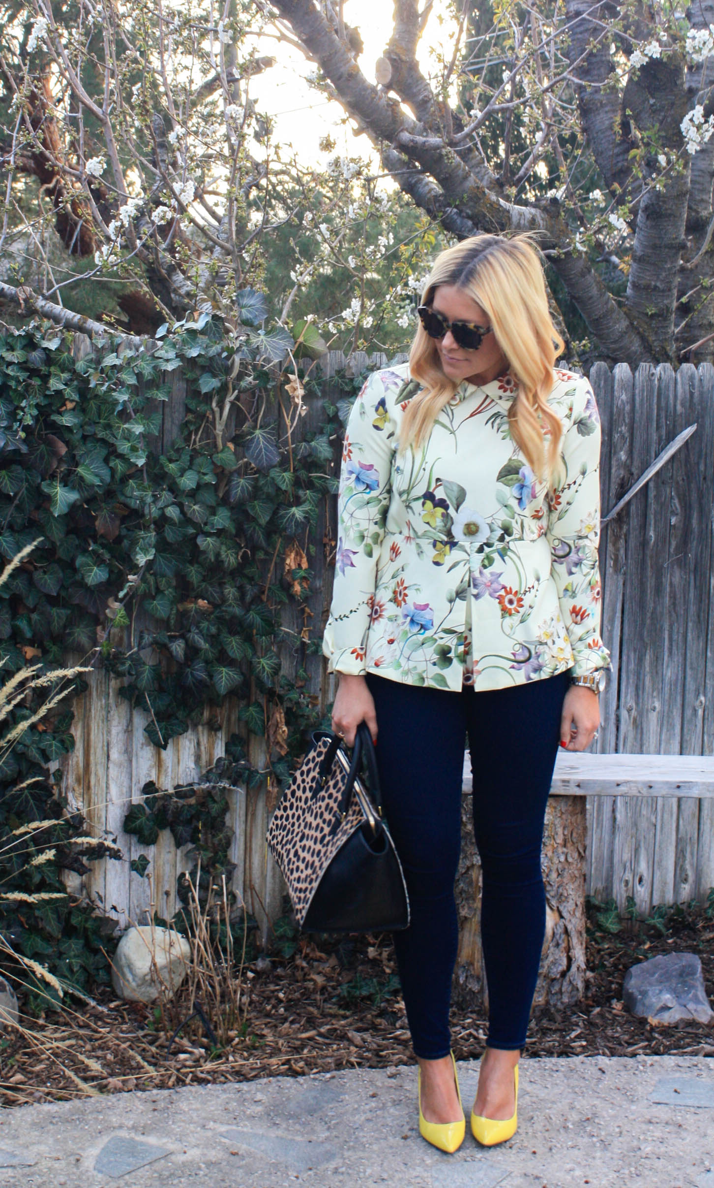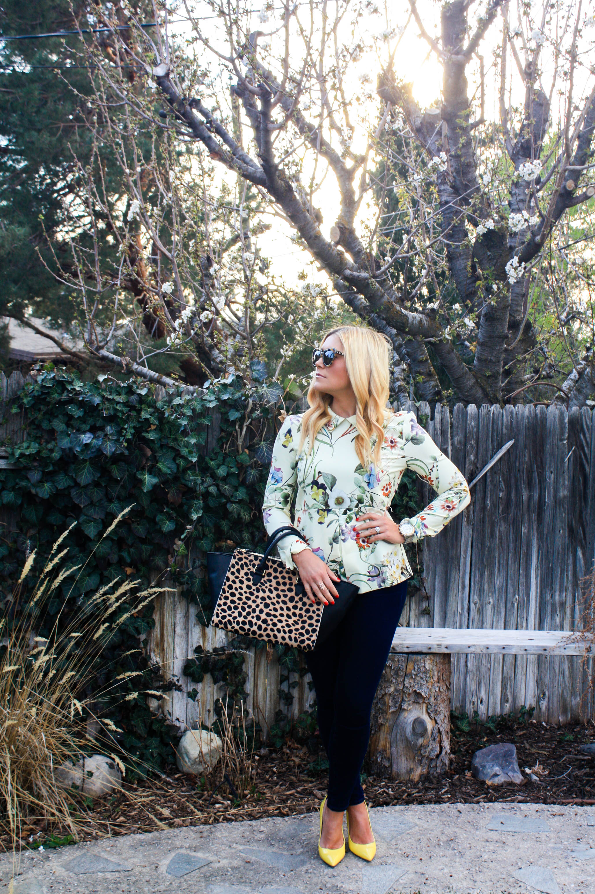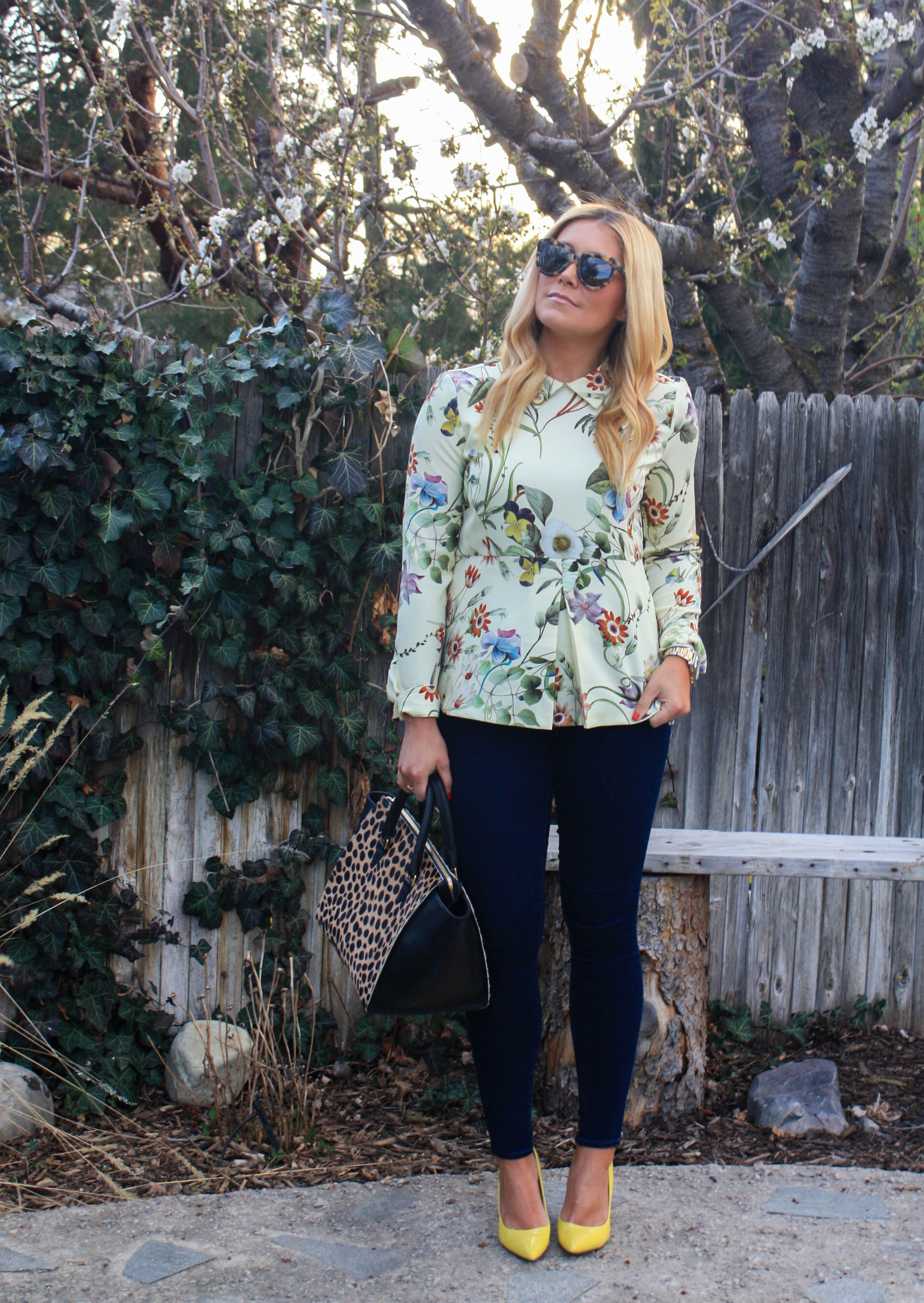 Blouse: Zara (also love this pretty v-neck version), similar, similar (under $11!!!!)| Skinnies: Paige | Watch: Michael Kors | Ring: Stella & Dot | Sunnies: Karen Walker | Bag: Clare Vivier (sold out), LOVE this one | Pumps: Marc Fisher (old), obsessing over these (and they are super comfy-I own the leopard version!)