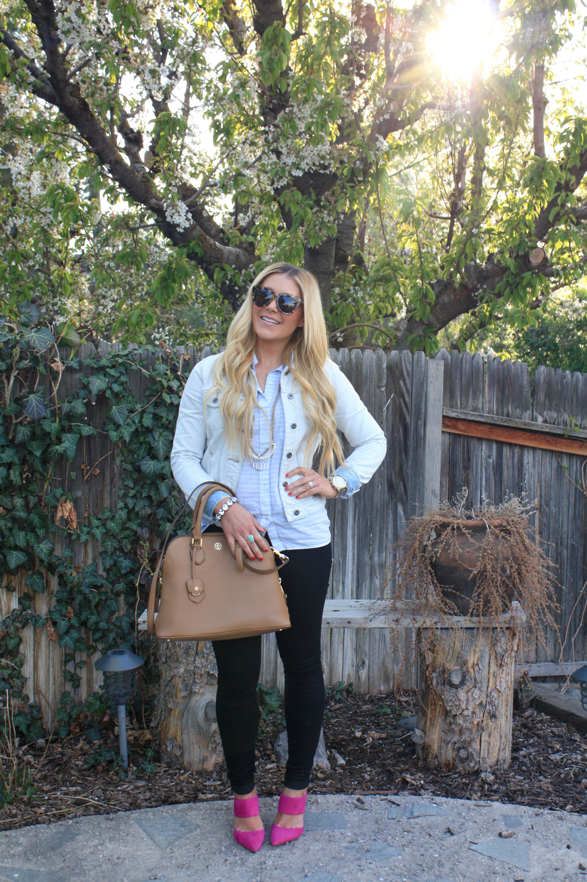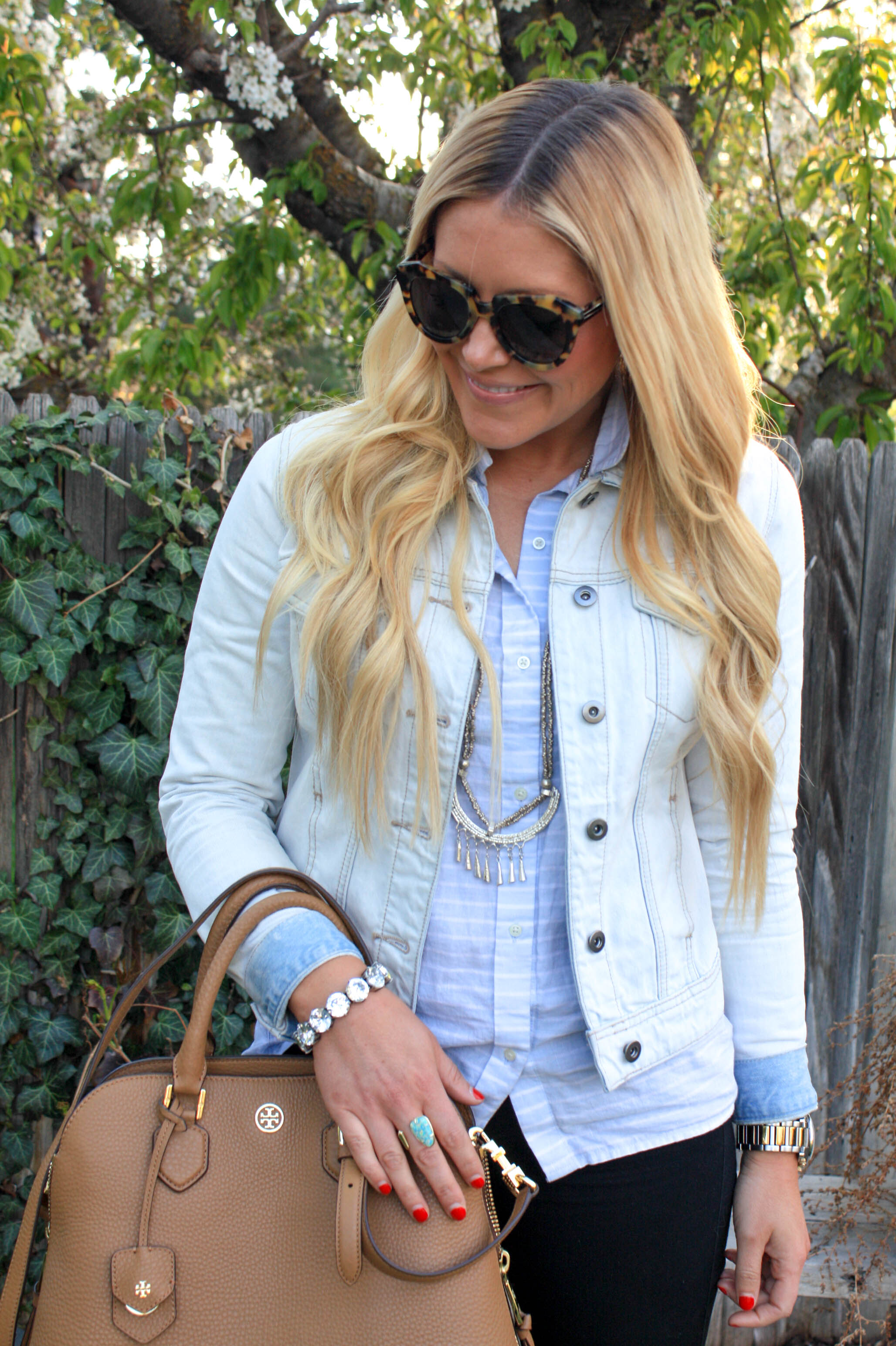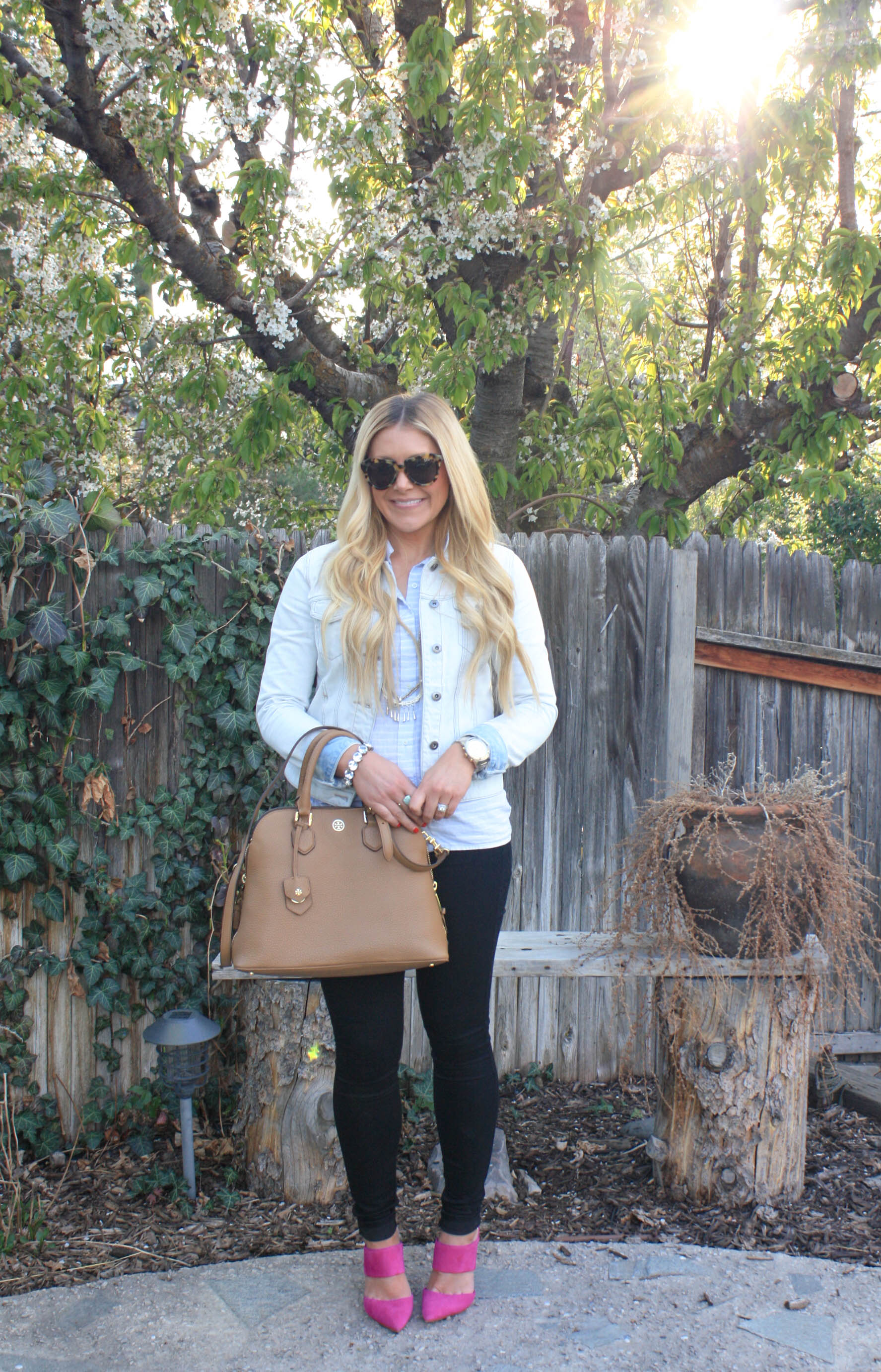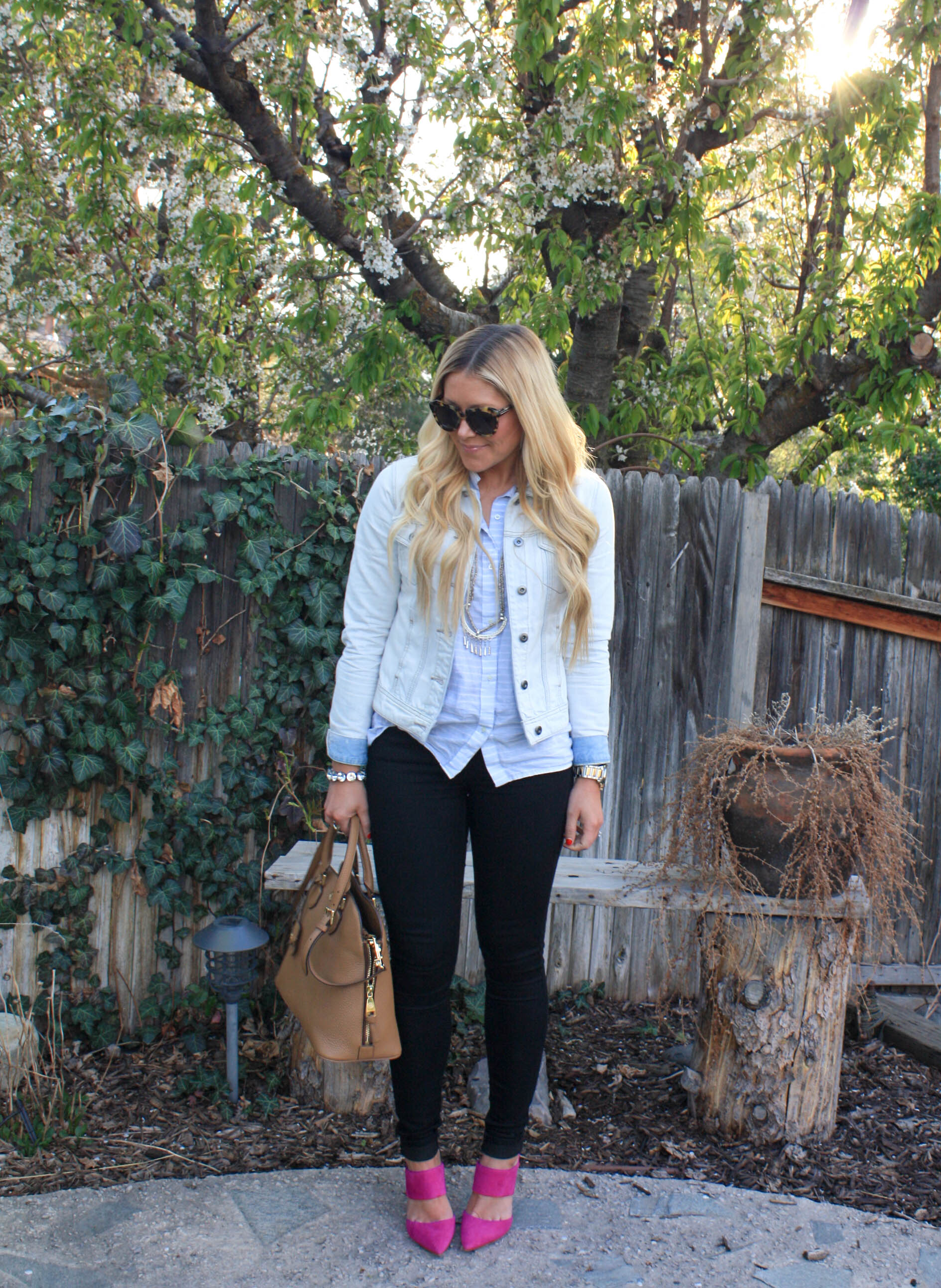 Denim Jacket: Nordstrom, my other favorite is here | Buttondown: Gap (old), similar, similar | Black Skinnies: 7 for all mankind | Necklace: Raven+Lily | Bracelet: JCrew (old), similar | Ring: Kendra Scott | Sunnies: Karen Walker | Bag: Tory Burch | Pumps: Jessica Simpson
