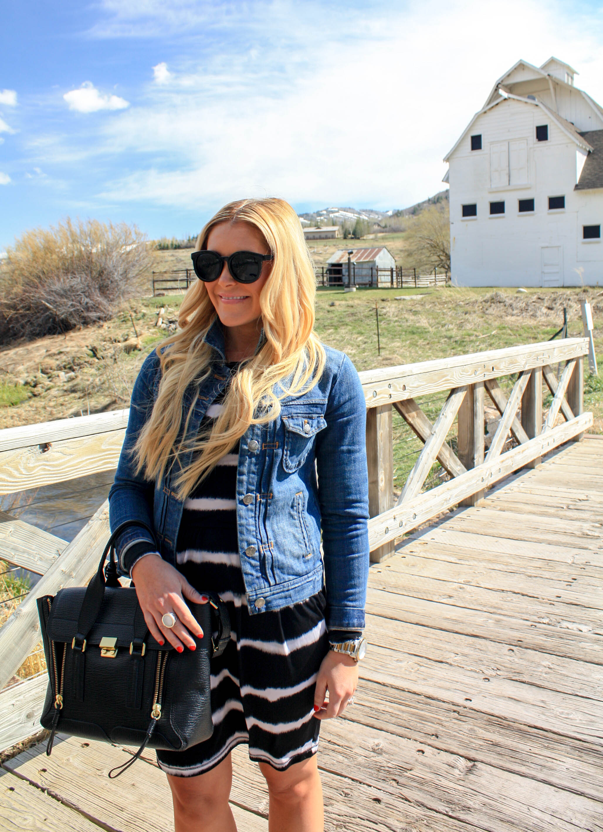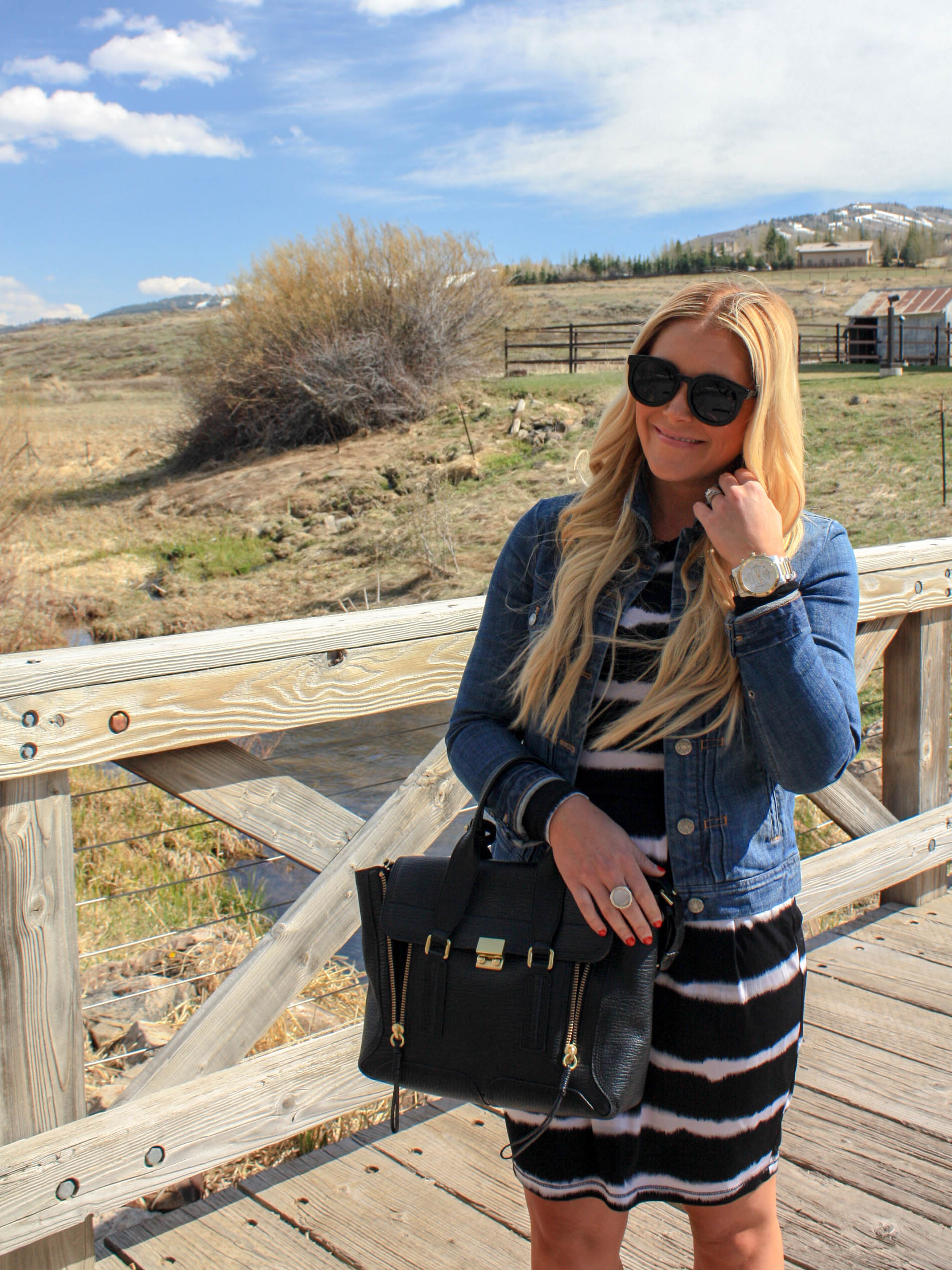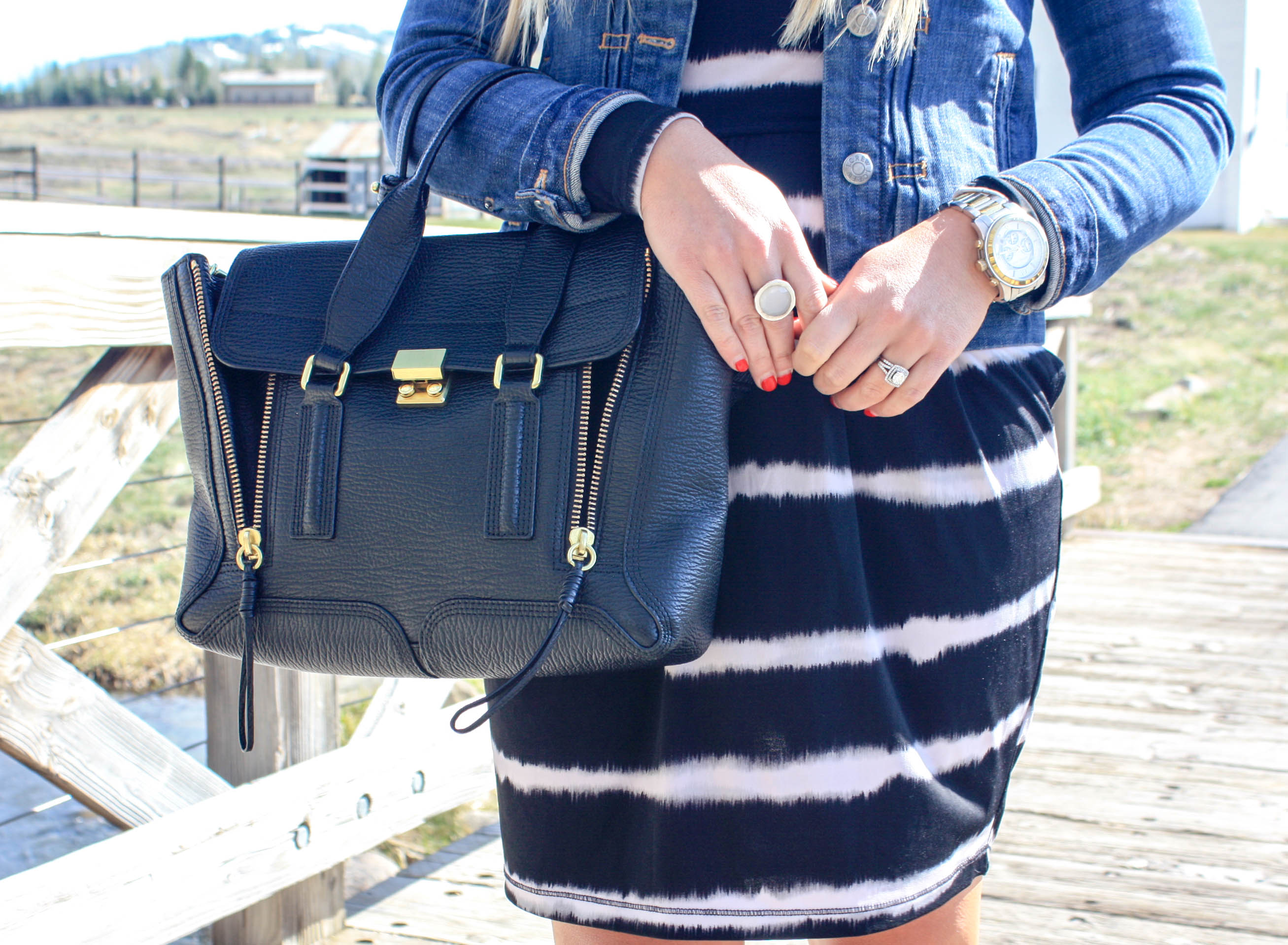 Denim Jacket: JCrew (the best!) | Dress: RACHEL Rachel Roy (older), love this, this, this, and this | Ring: Sundance Catalog (sold out), LOVE this one | Bag: 3.1 Phillip Lim | Sunnies: Karen Walker | Booties: BCBG (sold out), LOVE these