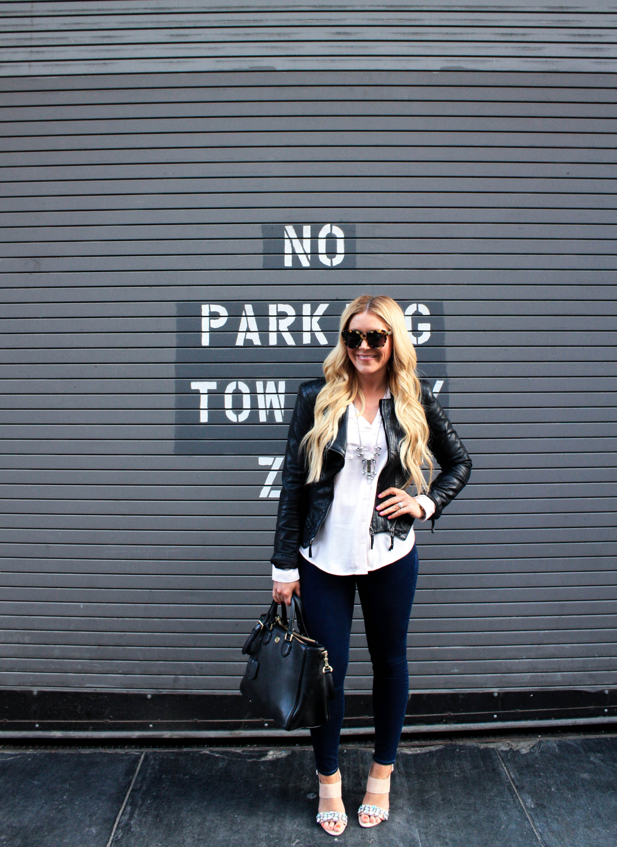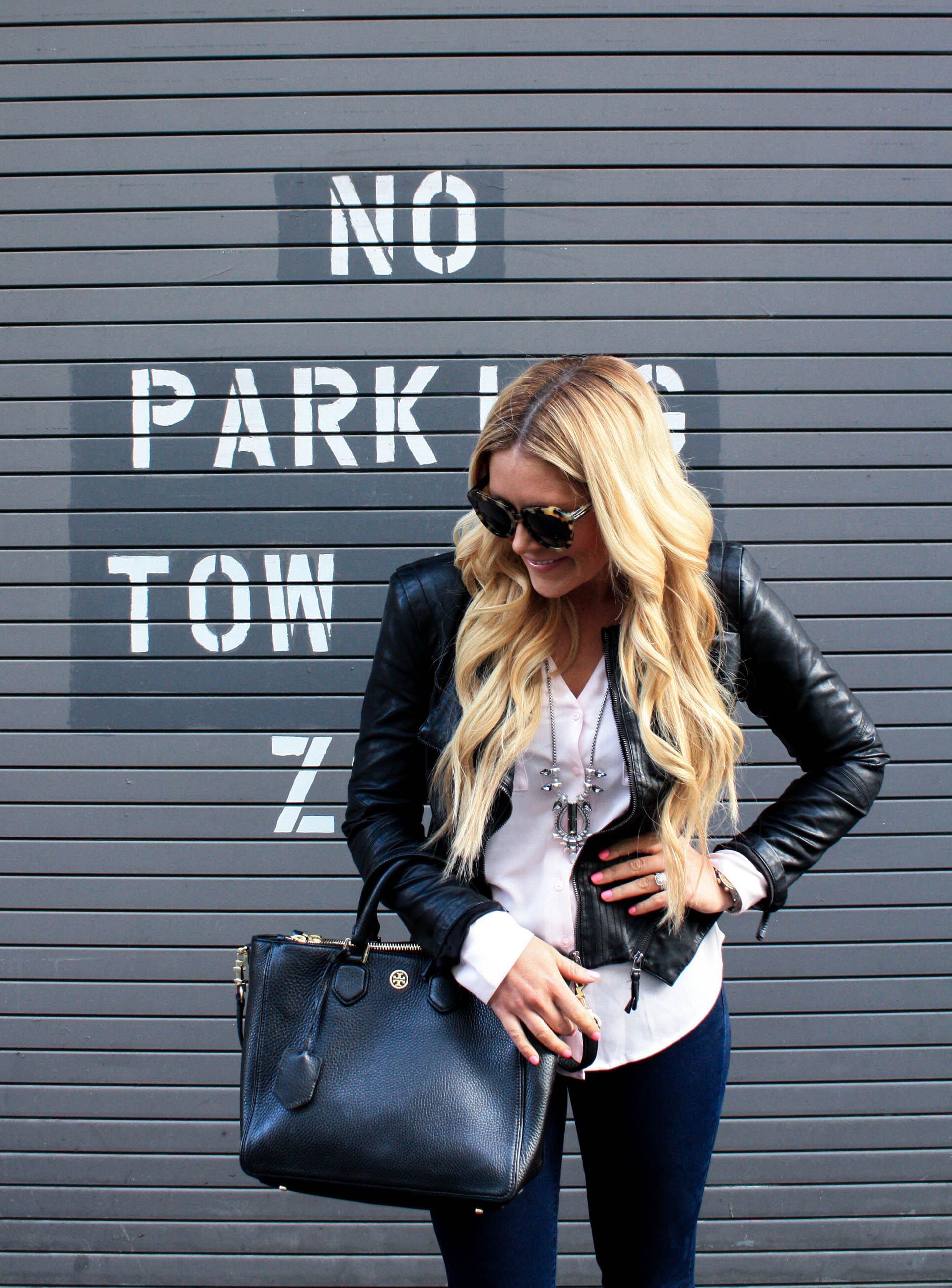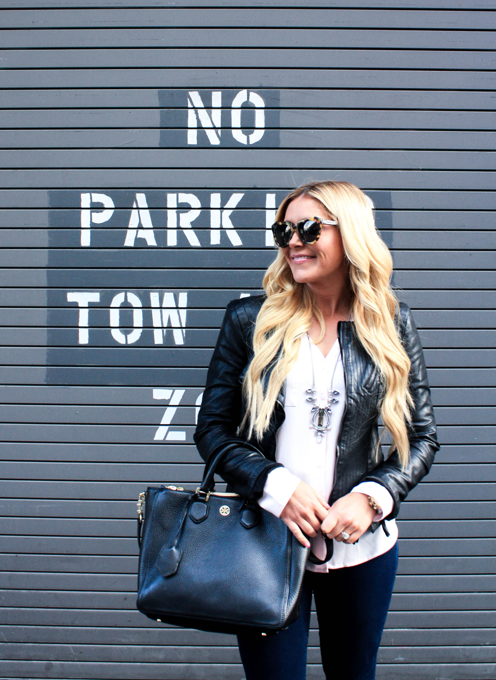 Jacket: Nordstrom (best ever!) | Blouse: Express (another fave and fantastic staple) | Skinnies: Paige | Necklace: Stella & Dot | Sunnies: Karen Walker | Bag: Tory Burch (love this so much, I just ordered it in this color) | Heels: Jessica Simpson