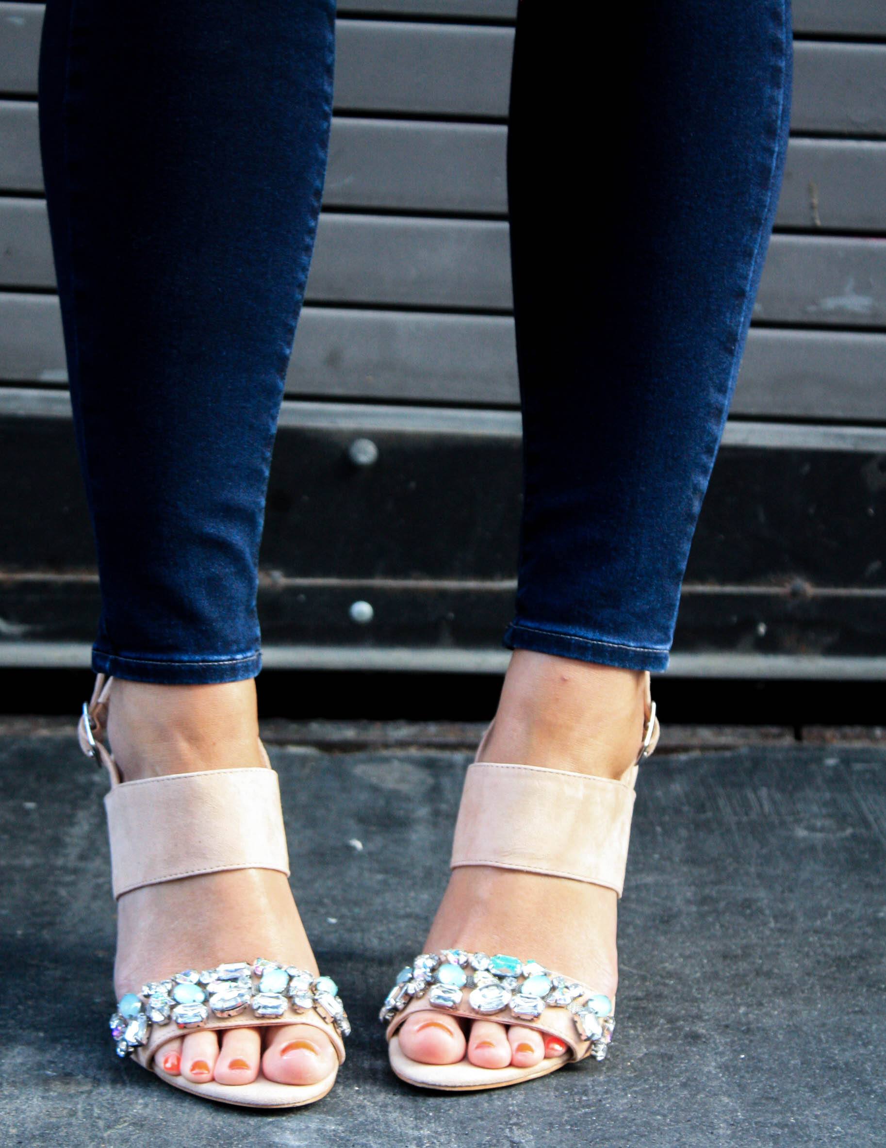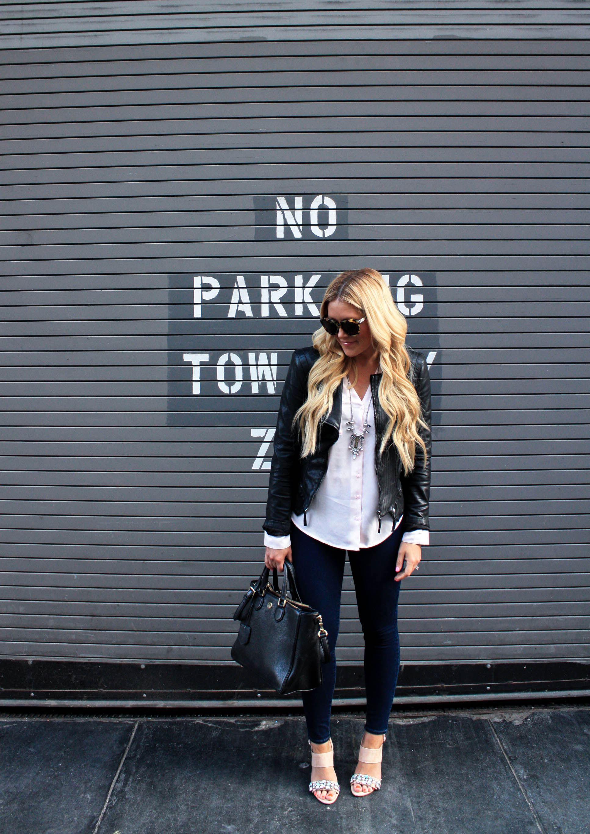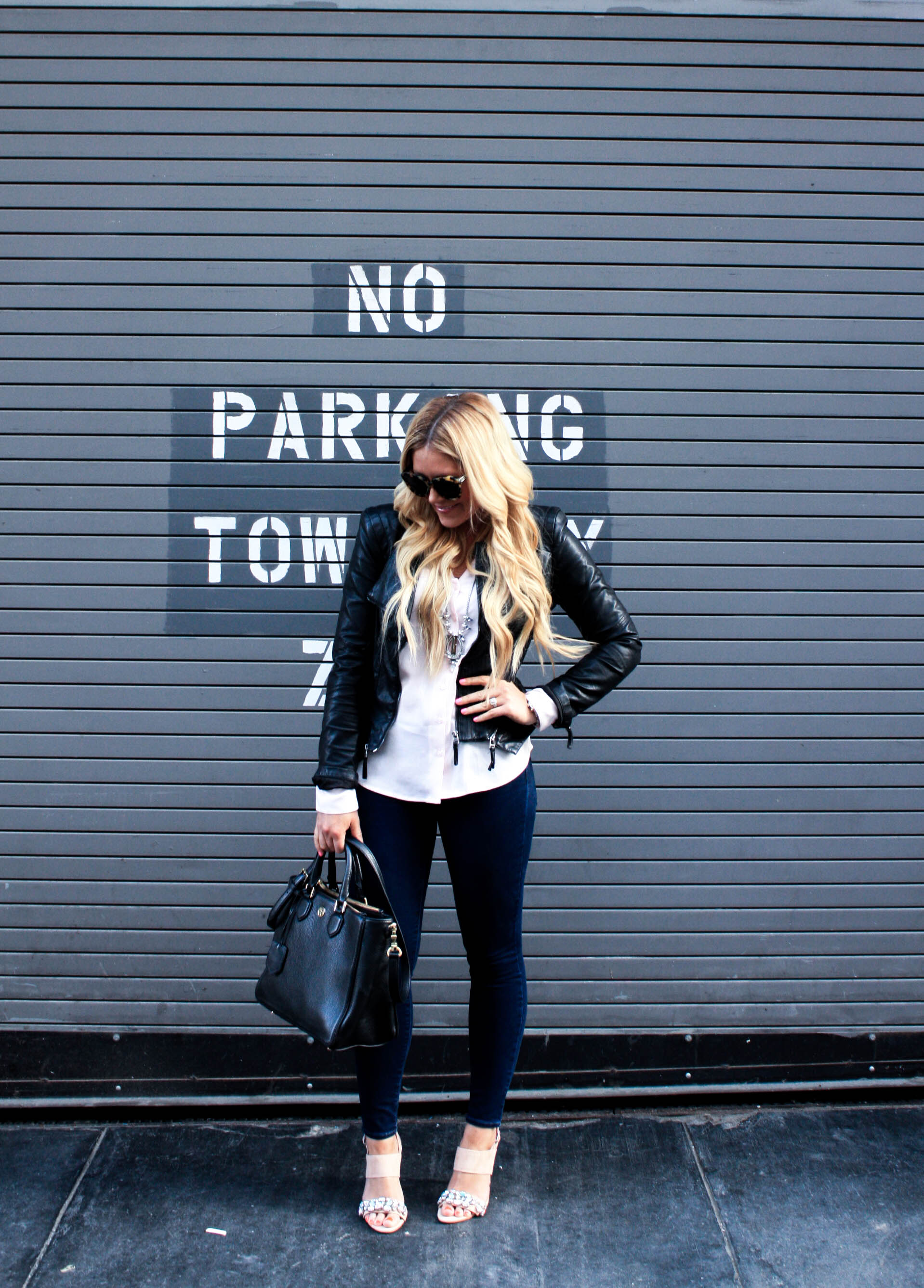 Jacket: Nordstrom (best ever!) | Blouse: Express (another fave and fantastic staple) | Skinnies: Paige | Necklace: Stella & Dot | Sunnies: Karen Walker | Bag: Tory Burch (love this so much, I just ordered it in this color) | Heels: Jessica Simpson