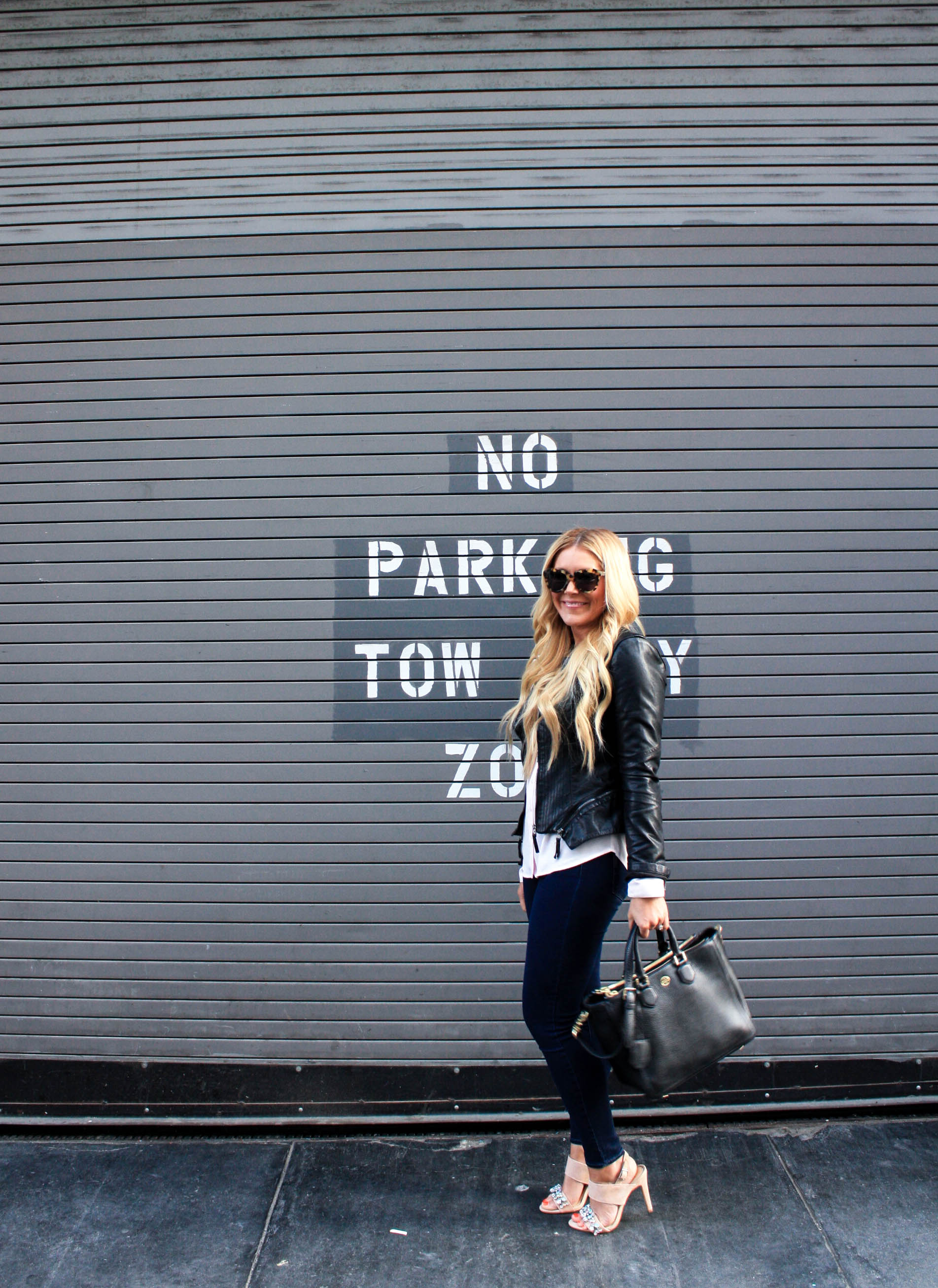 When I was a senior in high school, one of my favorite senior portraits was in front of a really cool “No Parking” sign painted on a falling down building.  So when we were heading out to dinner in SF last weekend with friends and I saw this sign on the side of garage, I had to make J stop and snap some photos for the blog.  And while I am wearing my usual go-to out outfit (leather jacket, a silky blouse, and my favorite skinnies), it’s my shoes that are noteworthy.  As I’ve said many times before, I am a sucker for a great pair of statement shoes, and these certainly fit the bill.  And not only is this particular pair gorgeous (you should see them in person!) AND under $70, but they are super comfy to boot!