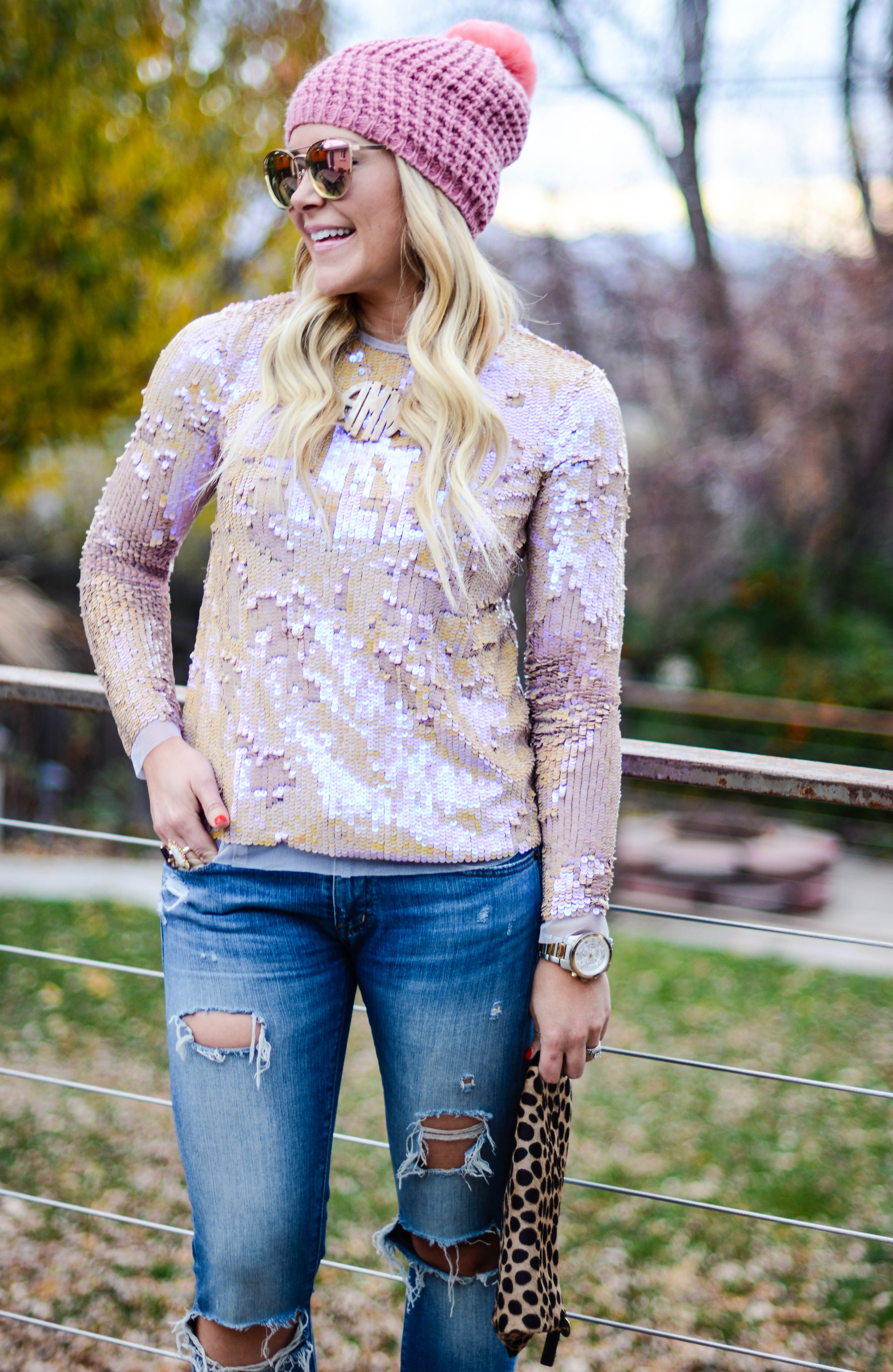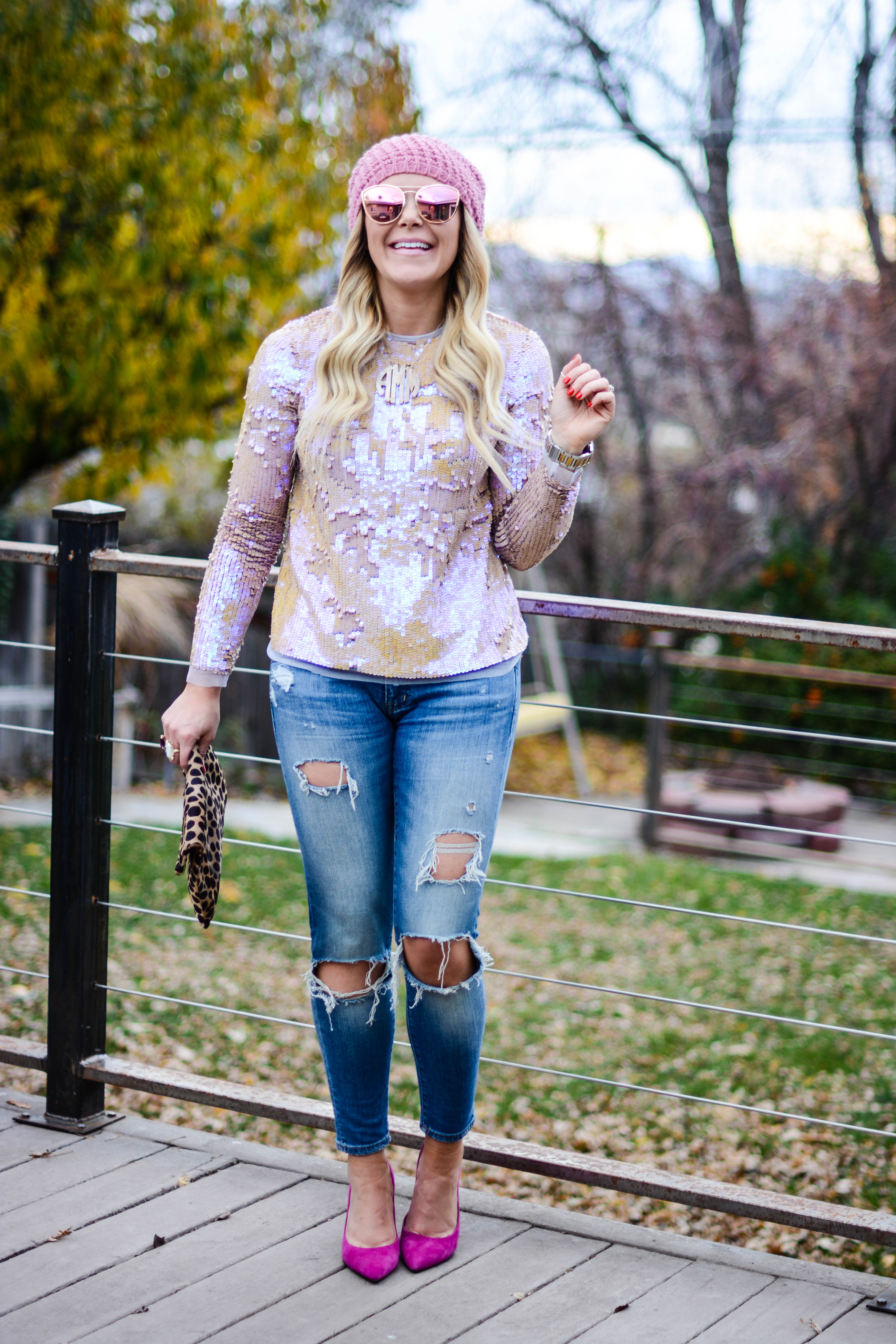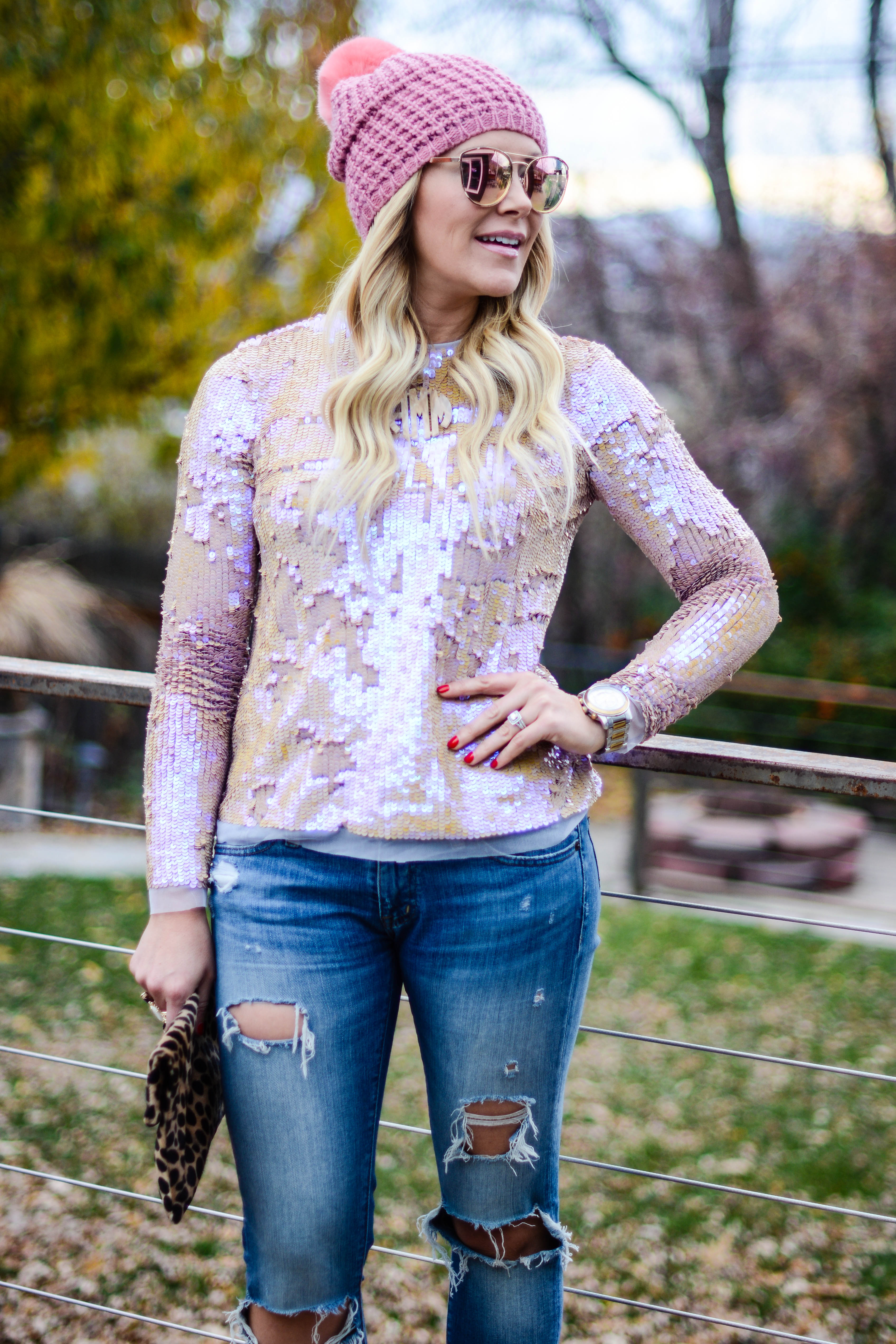 Give me all the sequins. All the time. And pretty much anything else that’s sparkly, while you’re at it! I have to say, one of my favorite things about the holiday season is all of the fun, festive, glittery pieces you can incorporate into your wardrobe. And this top is one of my favorite things I’ve ever purchased. I also love thinking outside the box when it comes to sequins and am loving this top styled with a casual beanie and destroyed denim. But I also can’t wait to dress it up a bit for a holiday party either.