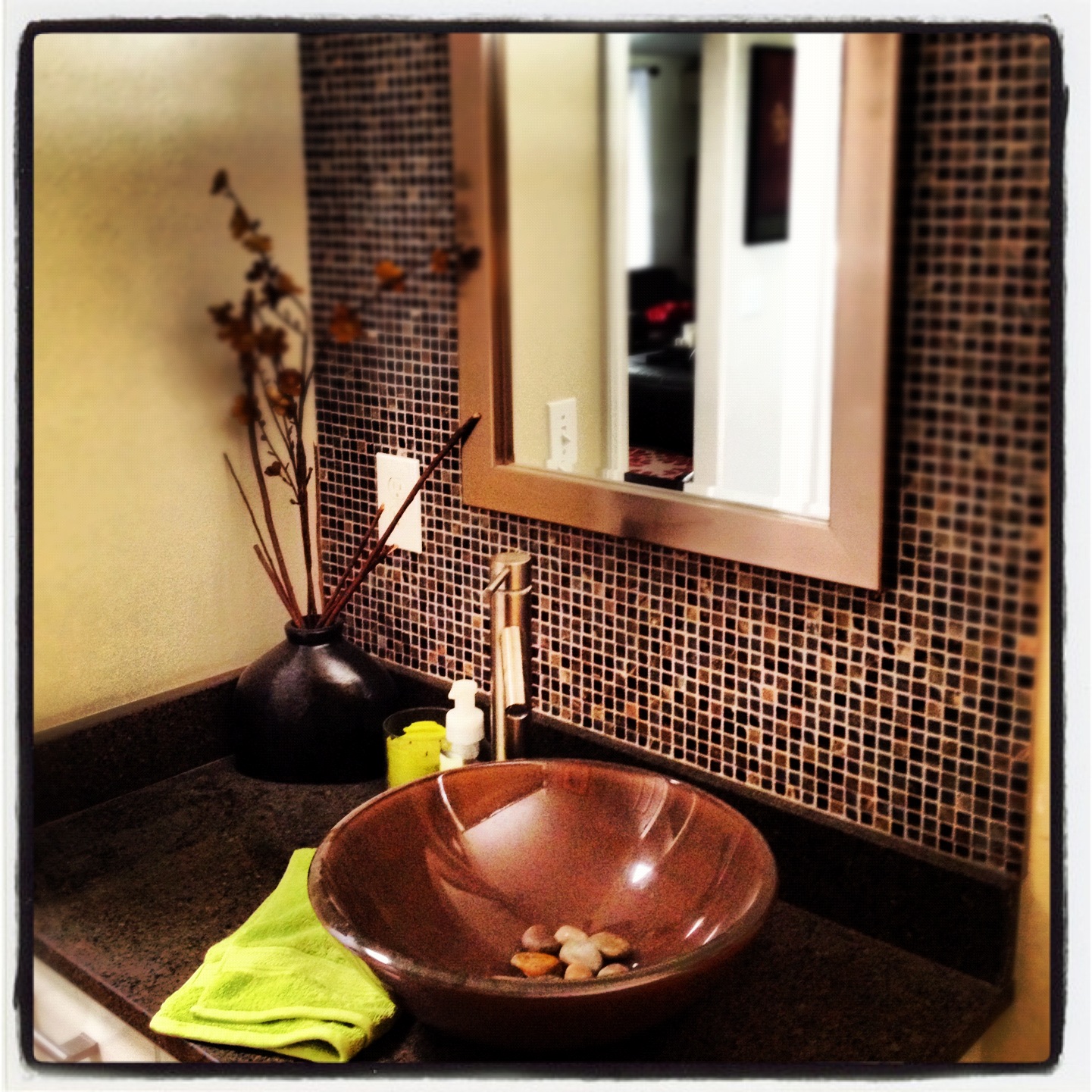 Ta-da!! Beautiful new vanity, quartz counters, my vessel sink, and tile back splash.