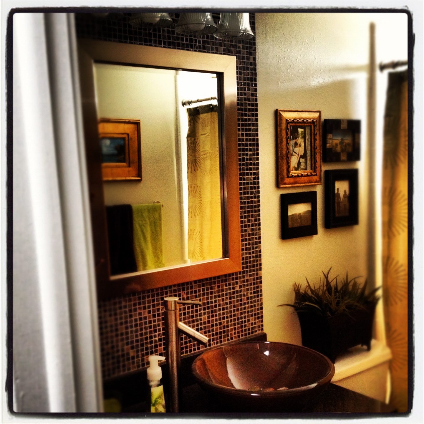 That said, I shared our kitchen transformation with you all (here) a few weeks ago. I had always dreamed of a white kitchen and a farm sink, and I was lucky enough to get both. And apparently I have a thing for sinks, because another item on my wish list was to have a vessel sink in our main bath. I have always wanted a vessel sink for as long as I can remember. I think they are neat, and classy, and unique, and pretty, and well, really, really neat. But if you would have asked my hubby what he though of vessel sinks when we started this project, he would have told you that they were weird, and tacky and just plain ugly. So as we remodeled our main bath (the first of 3 bathrooms we have now renovated) the vessel sink was a hot topic. But as you can see in the pictures below, I got my vessel sink, and I think it’s safe to say that J might like it even better than I do! 🙂