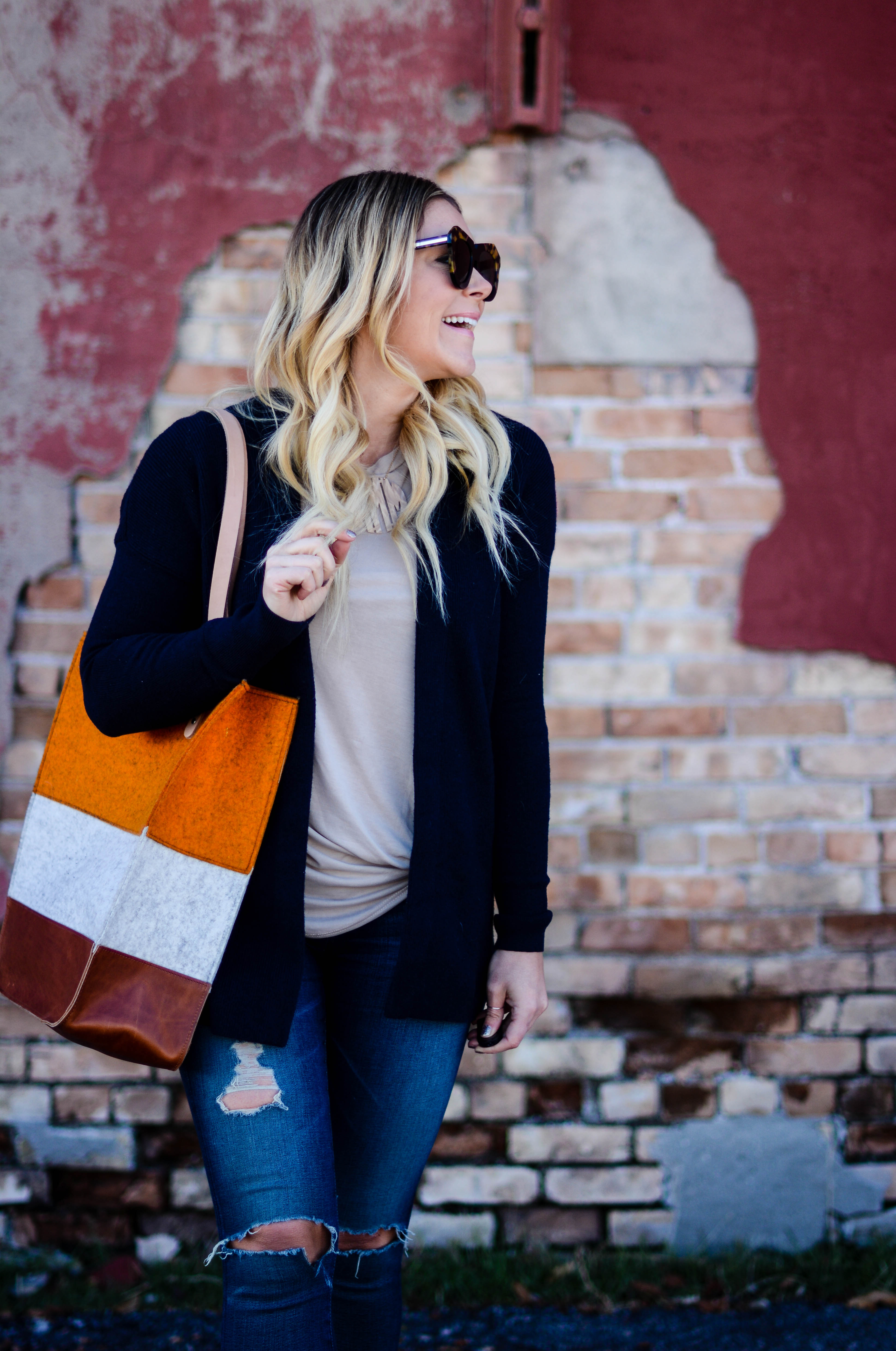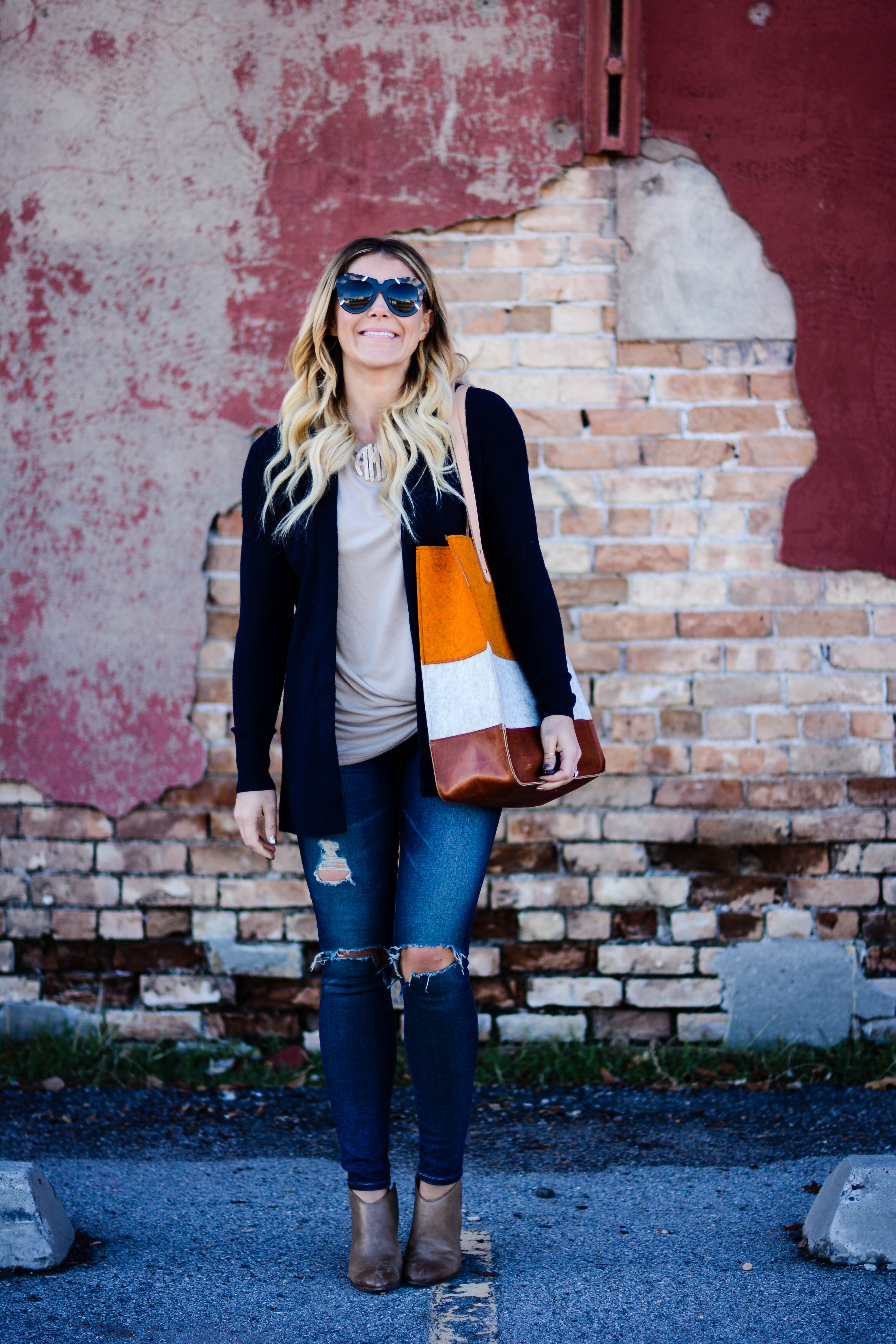 Sweater (on sale for less than $40!)| Denim | Monogram (30% off!)| Bag | Sunnies | Booties (old), similar