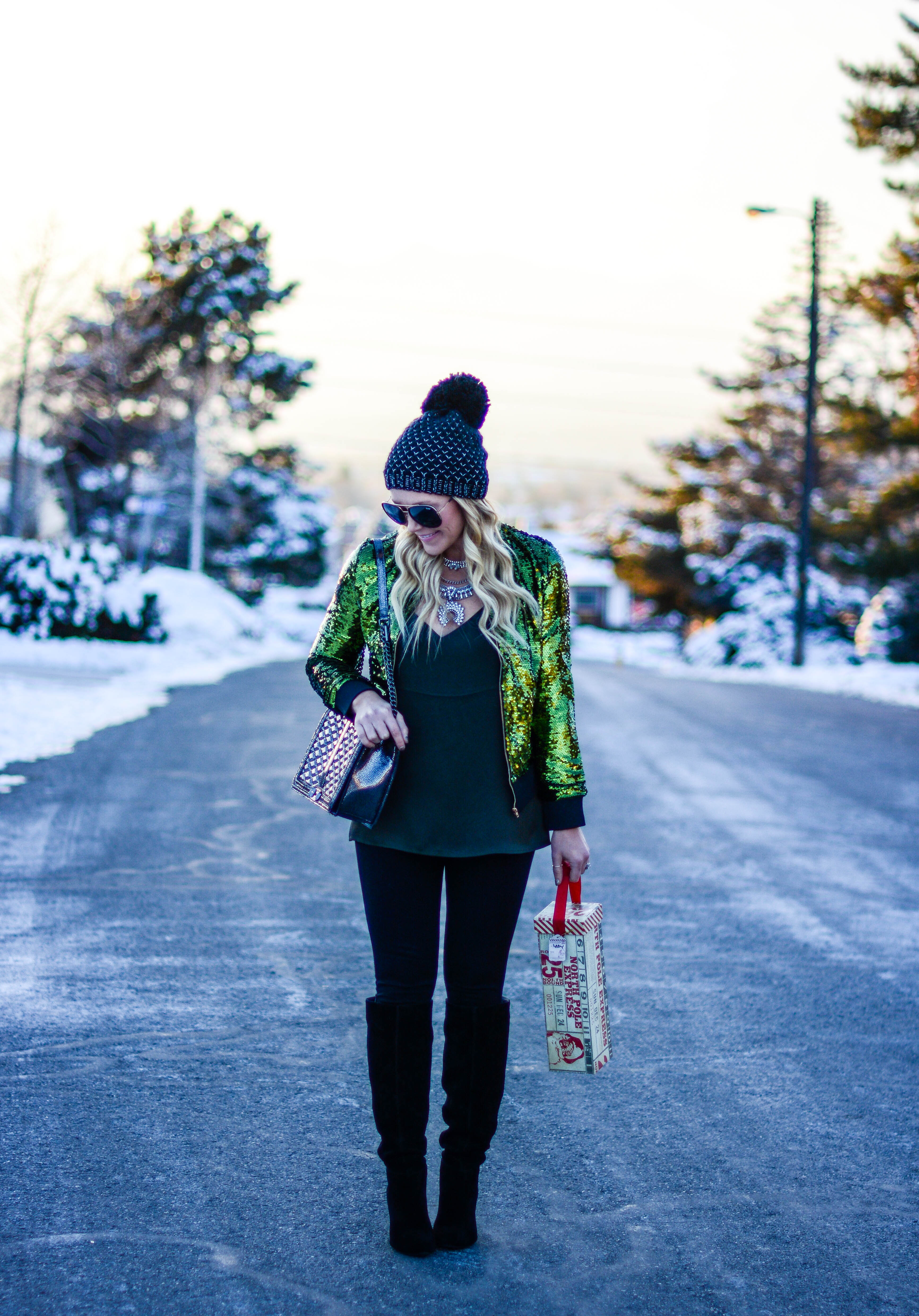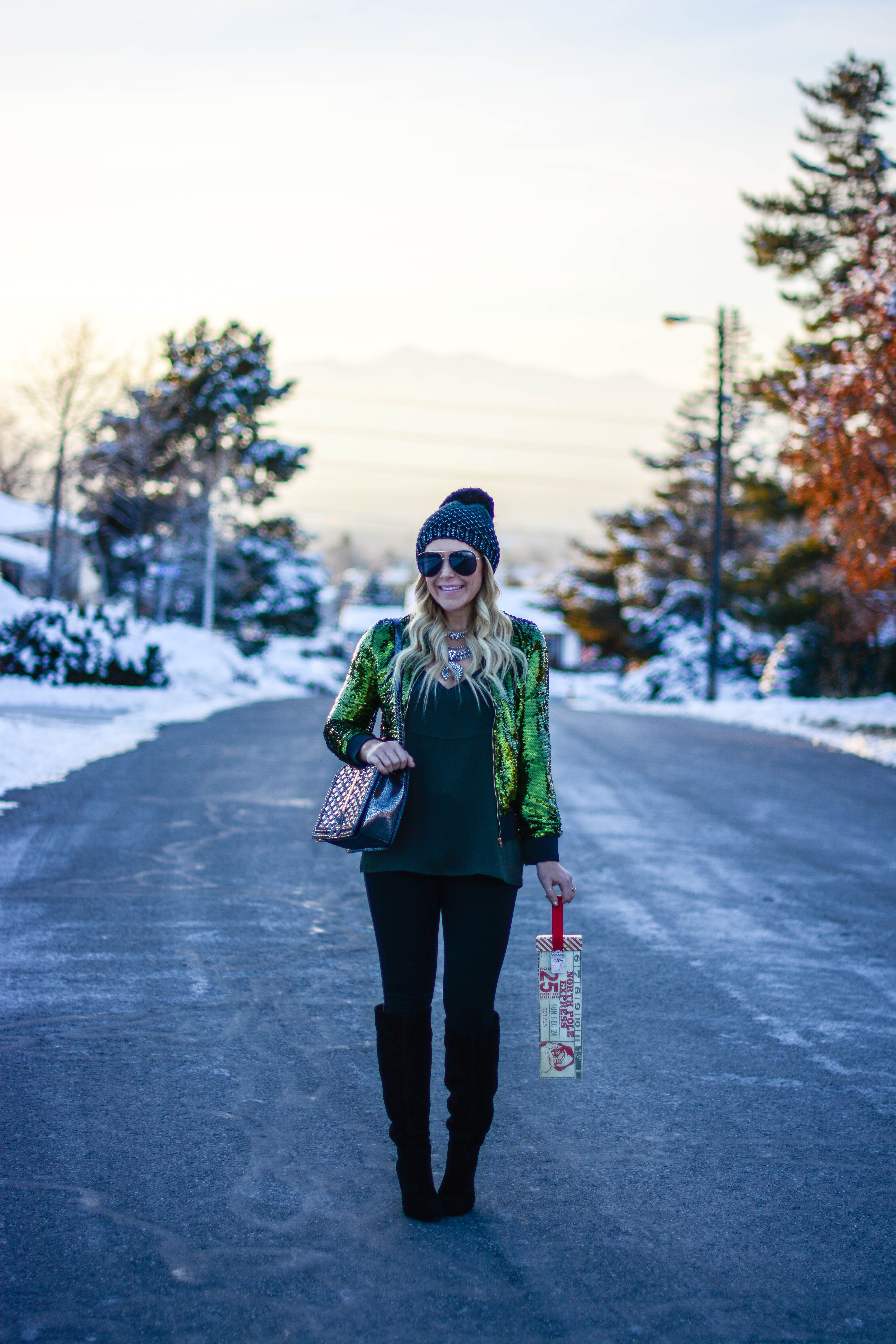 Give me all the sequins!  Now that it’s officially less than one week until Christmas, you can pretty much guarantee that I’ll be wearing sequins (or velvet) in one form or another from here on out.  And what could be better than a sequin bomber?  It’s the perfect way to add a little holiday glam to an otherwise casual look.