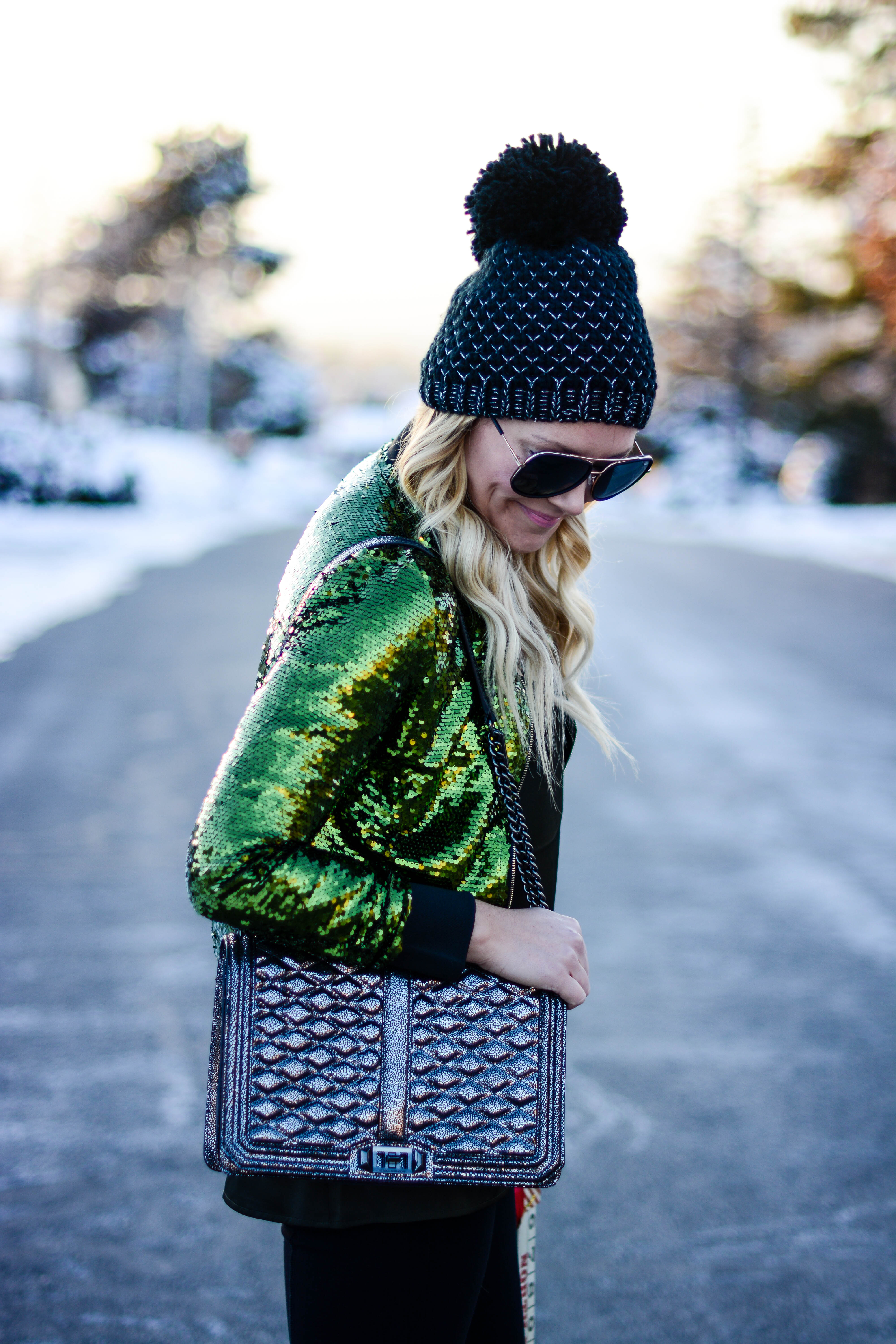 Sequin Bomber, also love this and this (free 2-day shipping!) | Tank | Skinnies | Necklace | Beanie | Sunnies | Bag (more than 50% off)| Boots