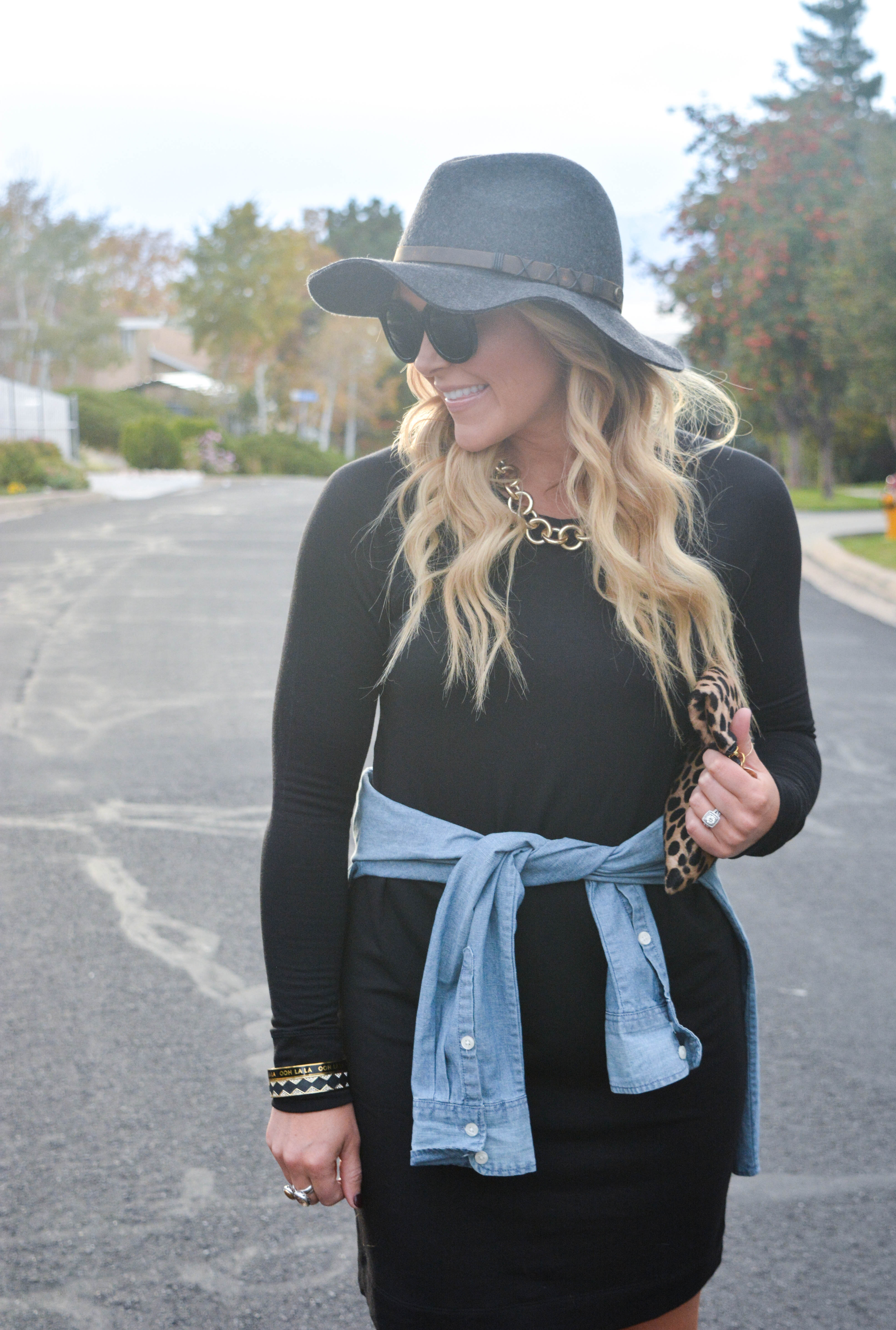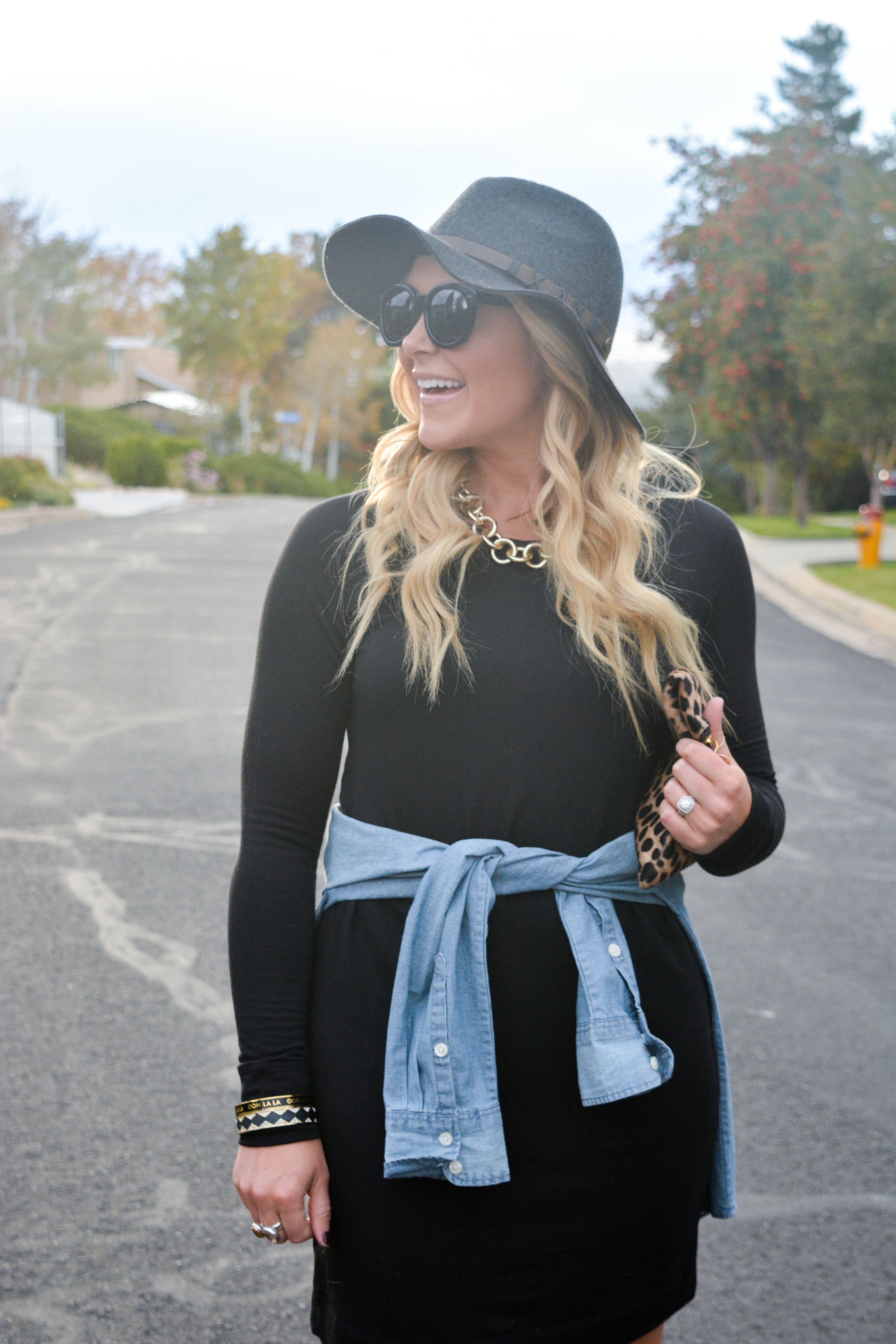 Black Sweatshirt Dress: Loft (LOVE this it is so soft and cozy!!) | Chambray Shirt: JCrew (on sale and a must have fall basic) | Necklace: INC | Bracelets: Kate Spade, House of Harlow | Hat: Pistil | Sunnies: Karen Walker (try them for one month FREE with code ALLDOLLEDUP at checkout) | Clutch: Clare Vivier (LOVING this clare V clutch which is on sale!) | Fringe Heels: Steve Madden (on sale! also love the gold)