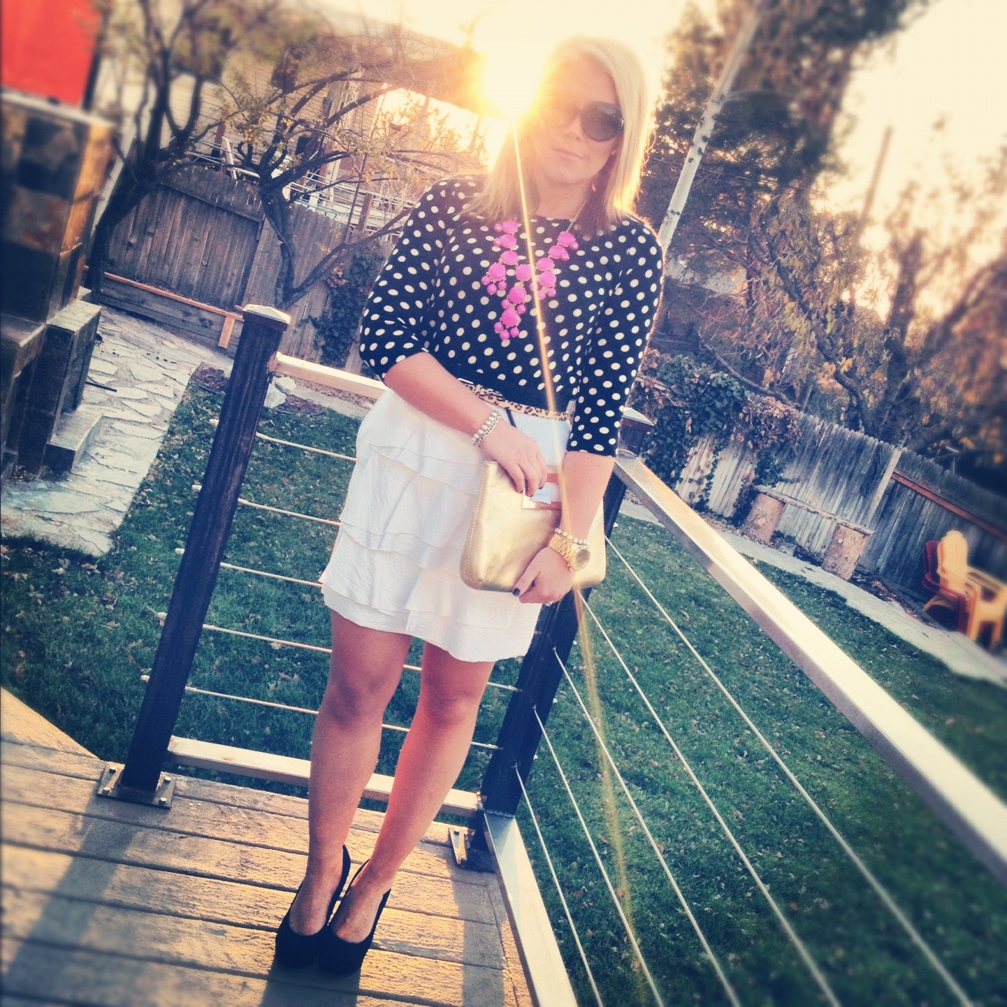 Outfit #3: Dress: Forever21 (sold out), similar | Belt: Steve Madden | Necklaces: Stella & Dot, JCrew, Juicy Couture | Bracelets: JCrew, Kate Spade, Stella & dot | Watch: Michael Kors | Clutch: Coach | Pumps: BCBGeneration Olga