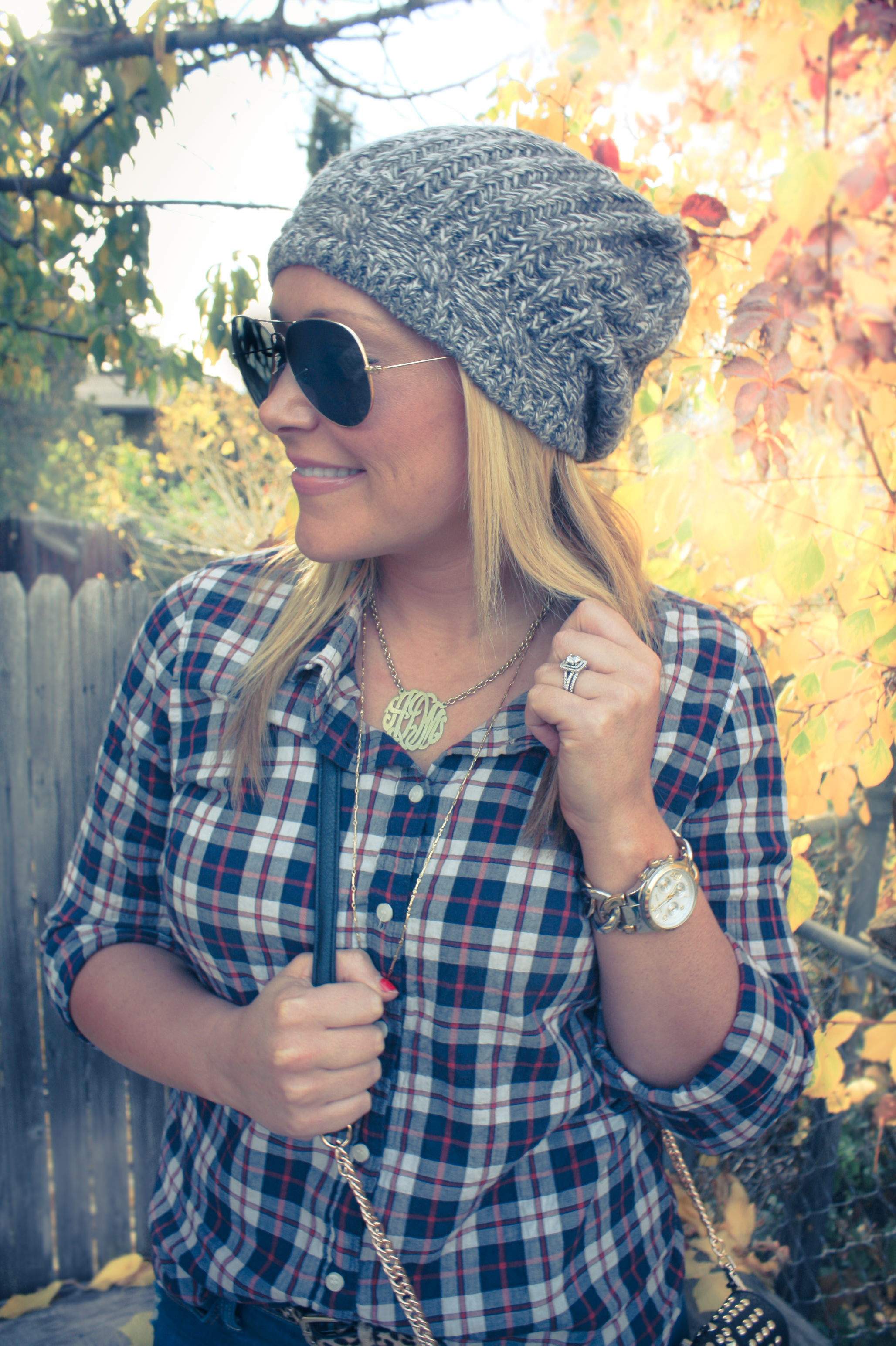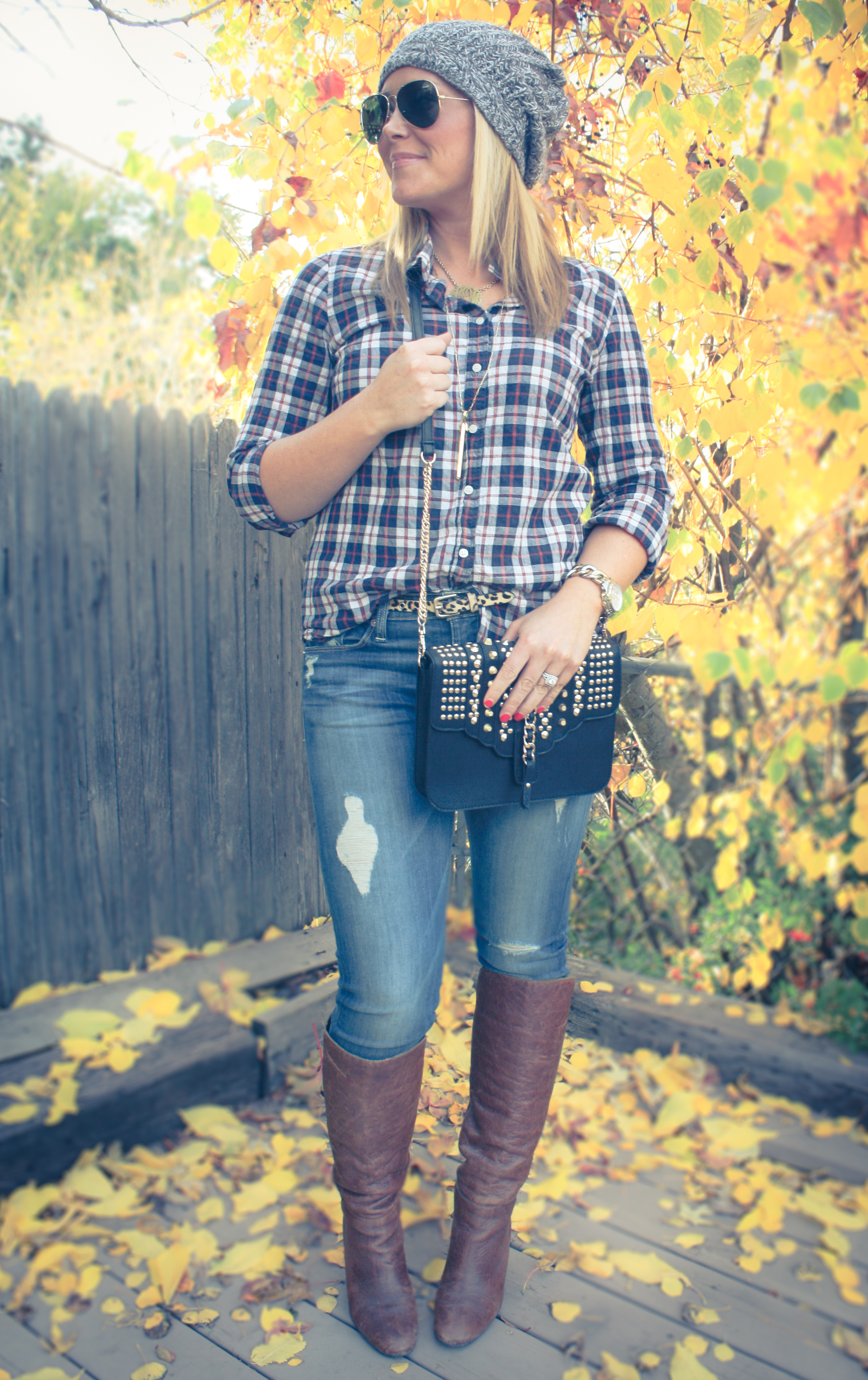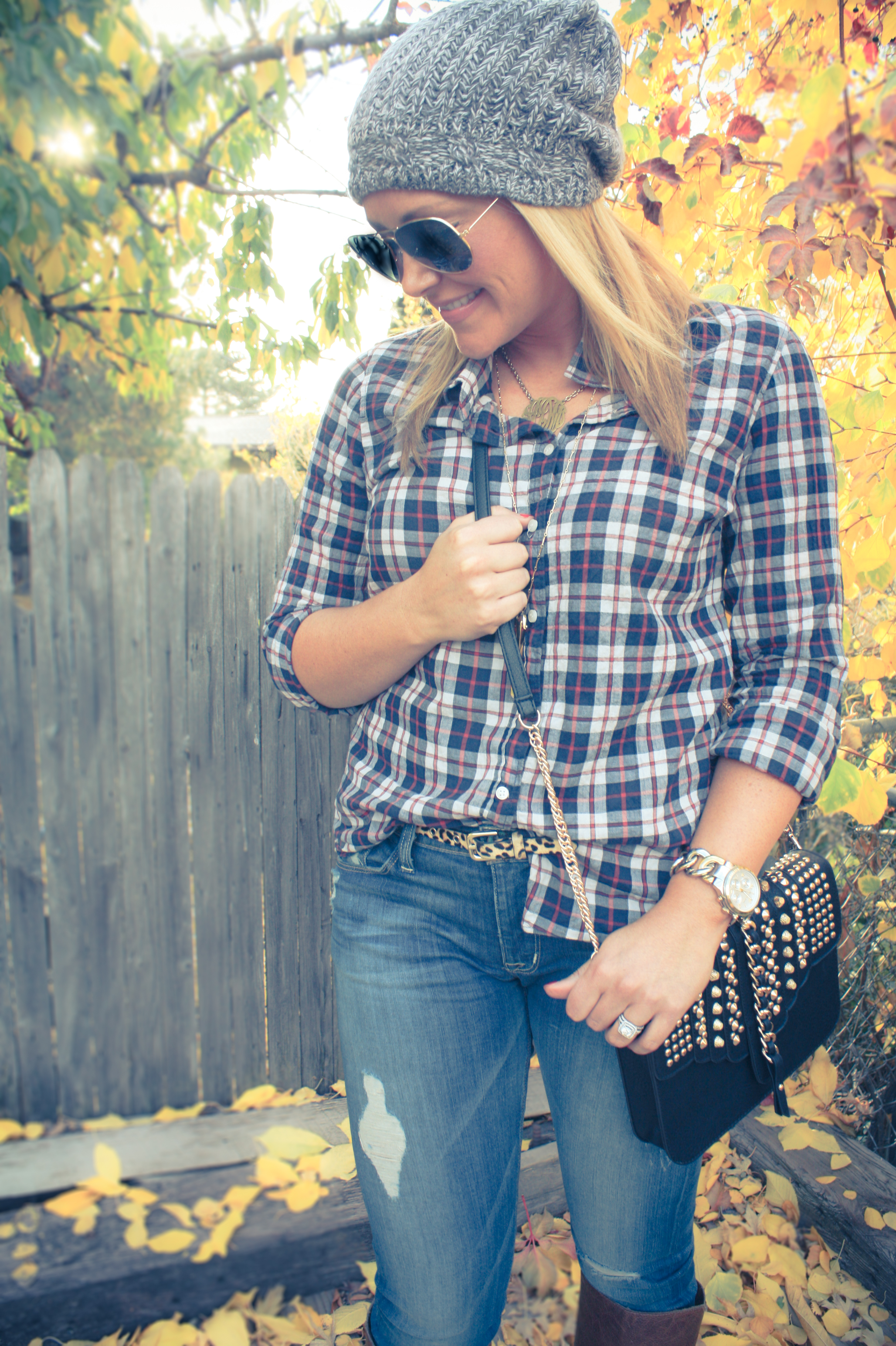 Plaid Button Down: JCrew (old), similar, loving this one | Skinnies: Hudson | Beanie: American Eagle (old), similar, similar | Necklaces: Stella & Dot, Keti Sorely Designs | Watch: Michael Kors | Sunnies: Rayban | Bag: TJMaxx | Boots: Aldo (old), similar, similar