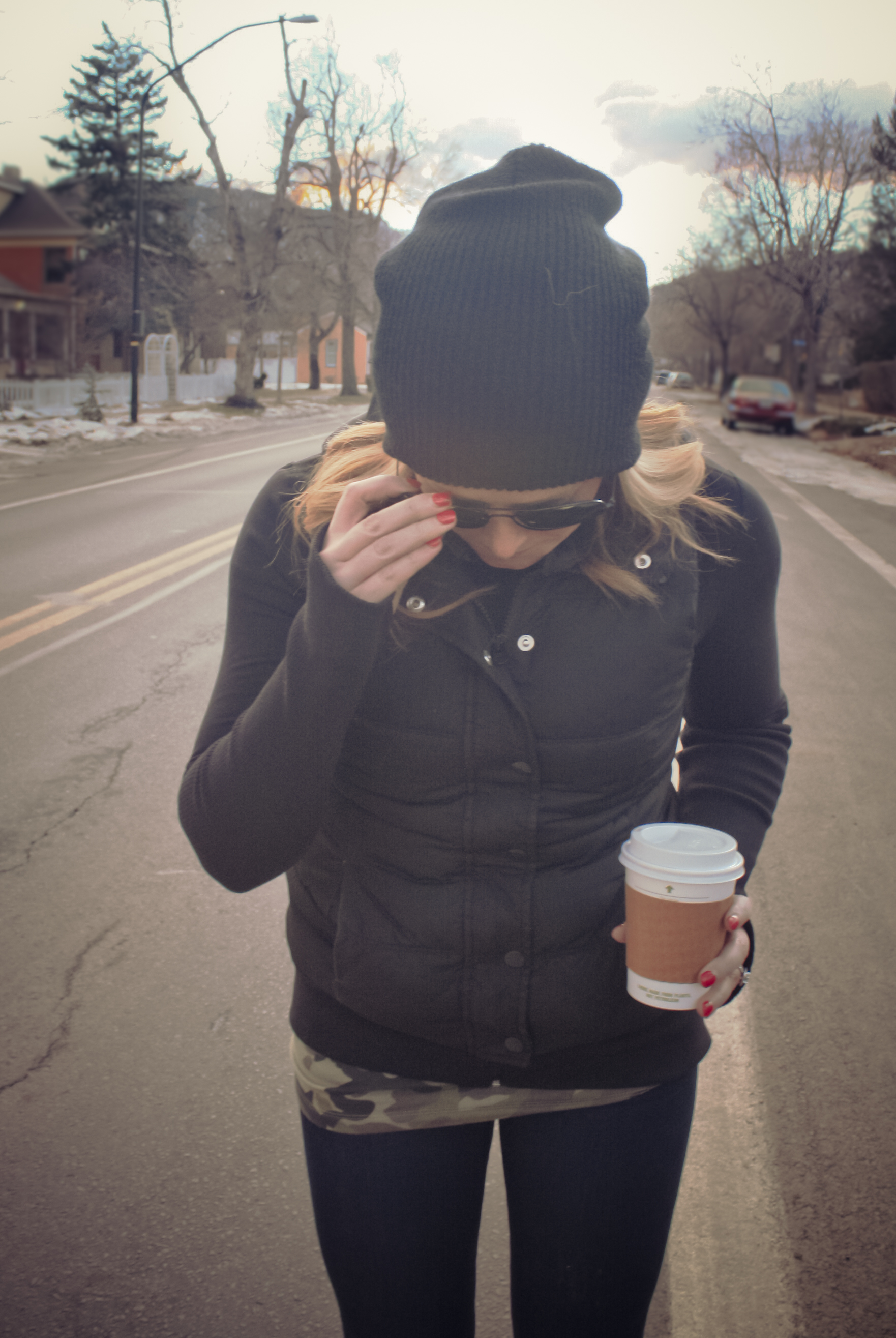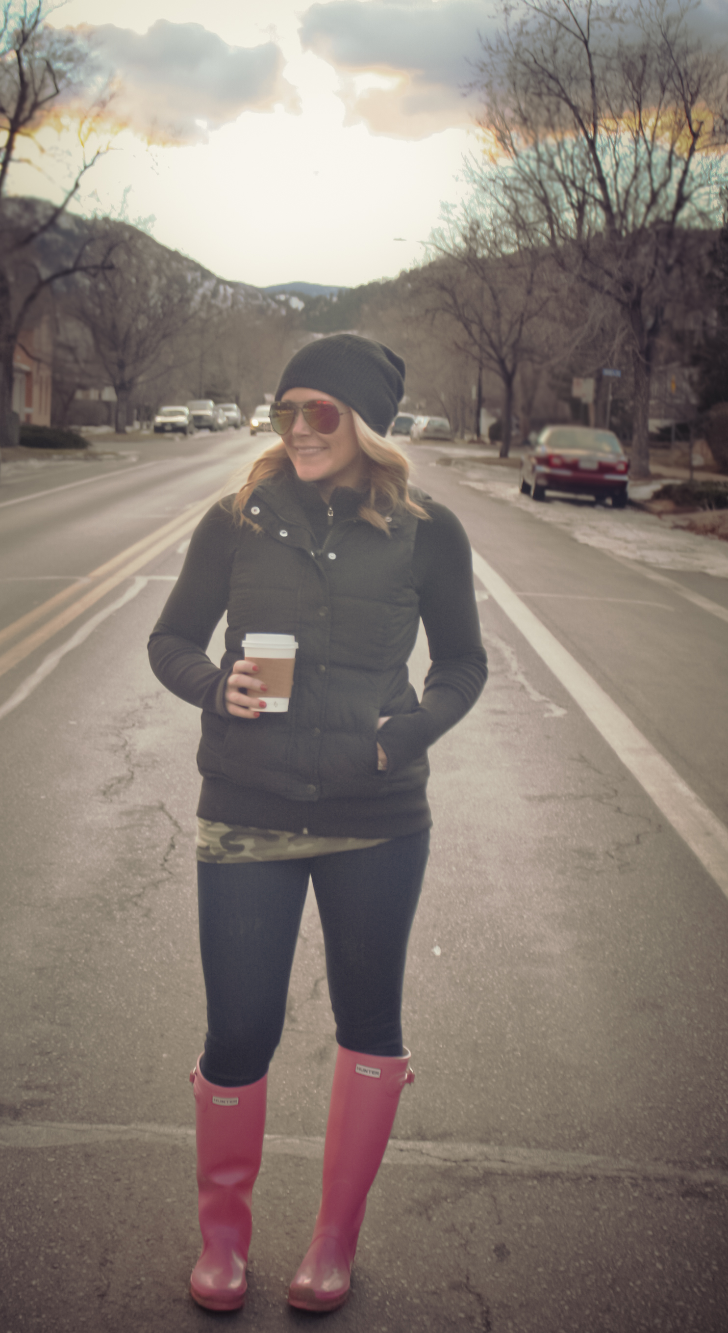 Vest: Old Navy (old), this year’s version, similar | Jacket: Gap Fit (just as nice a lululemon for 1/2 the price!) | Camo Tee: Blossom Boutique (sold out), similar, similar | Jeans: 7 for All Mankind | Sunnies: Target (old), similar, the real deal | Beanie: Dakine | Rain Boots: Hunter