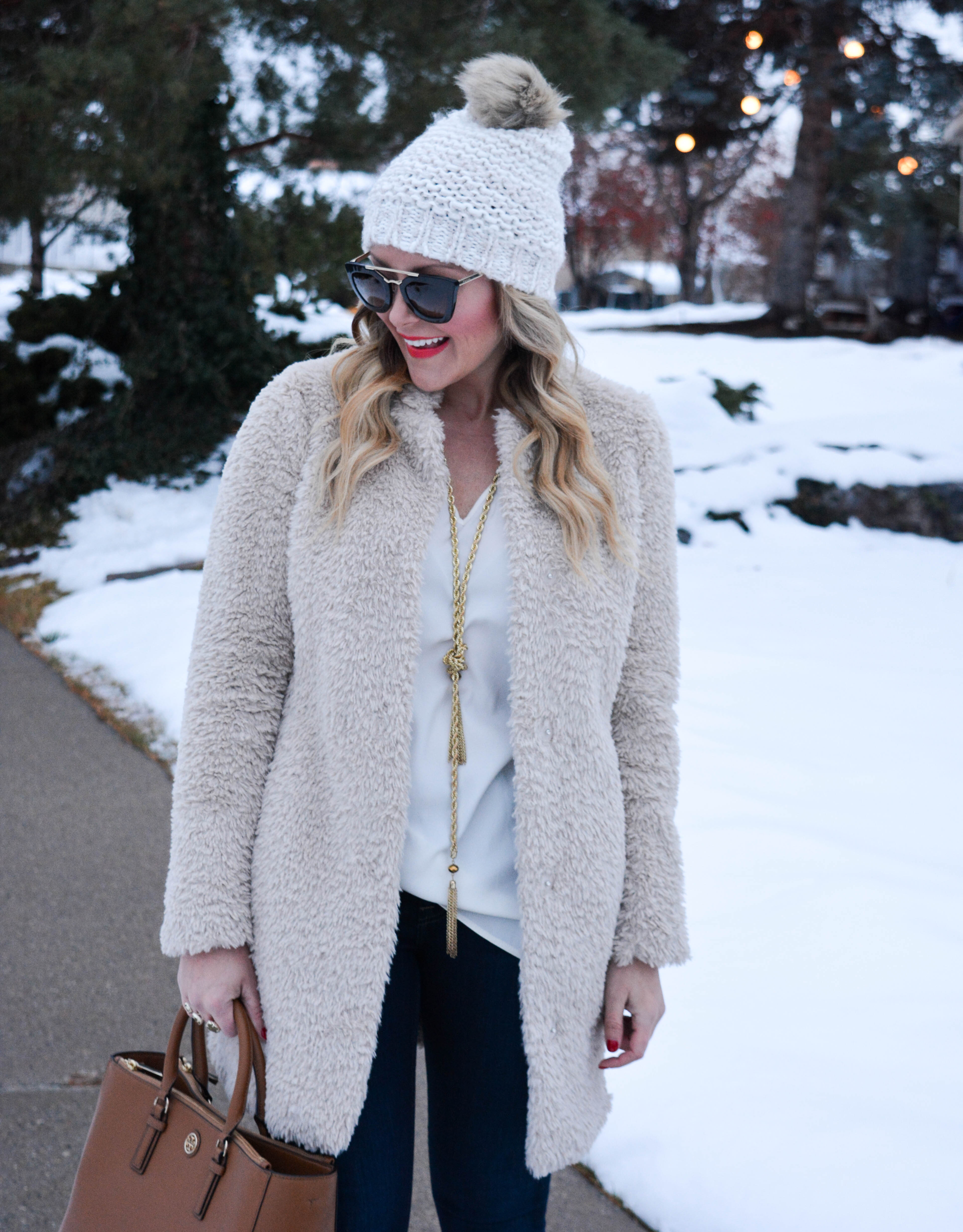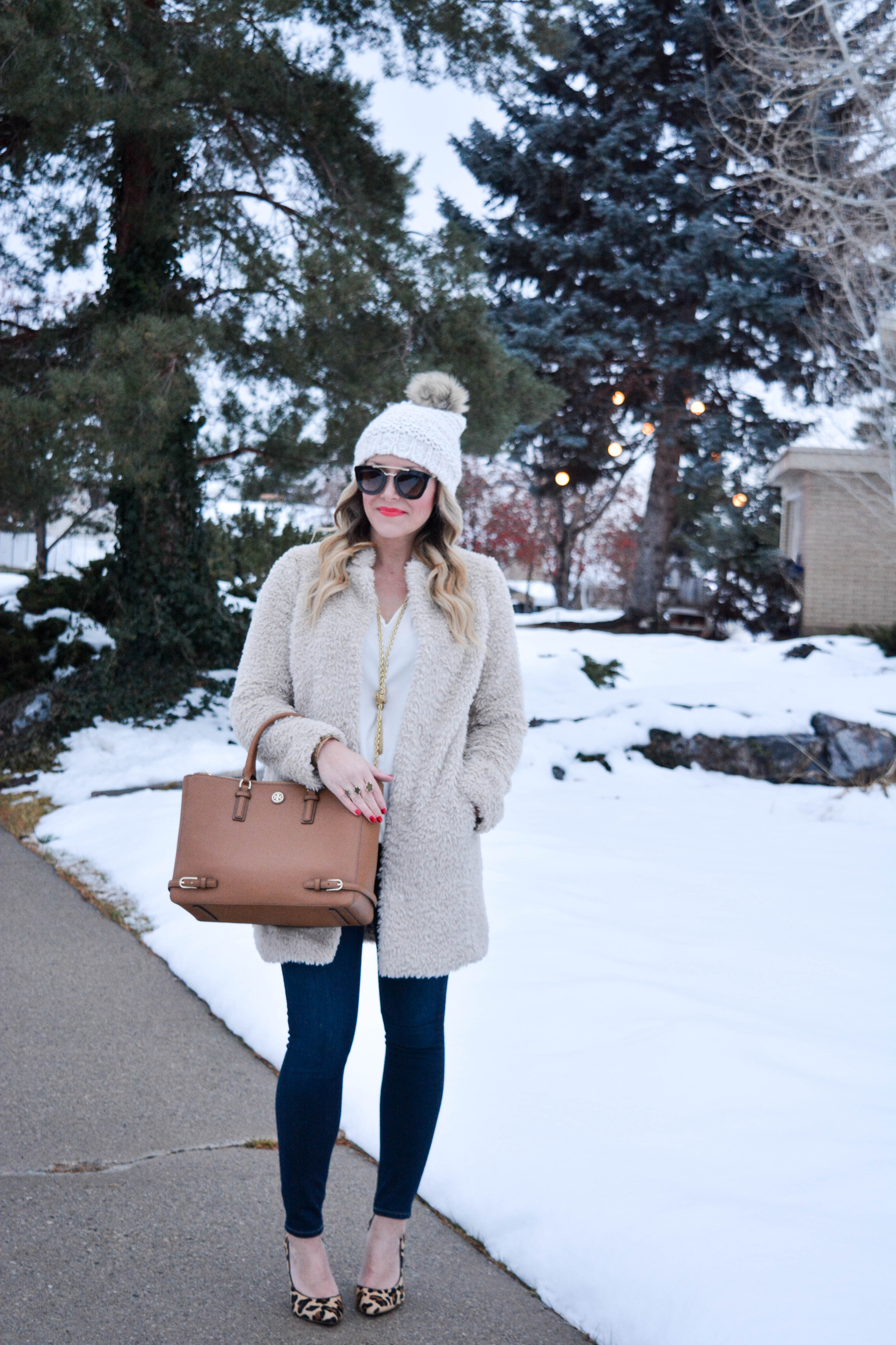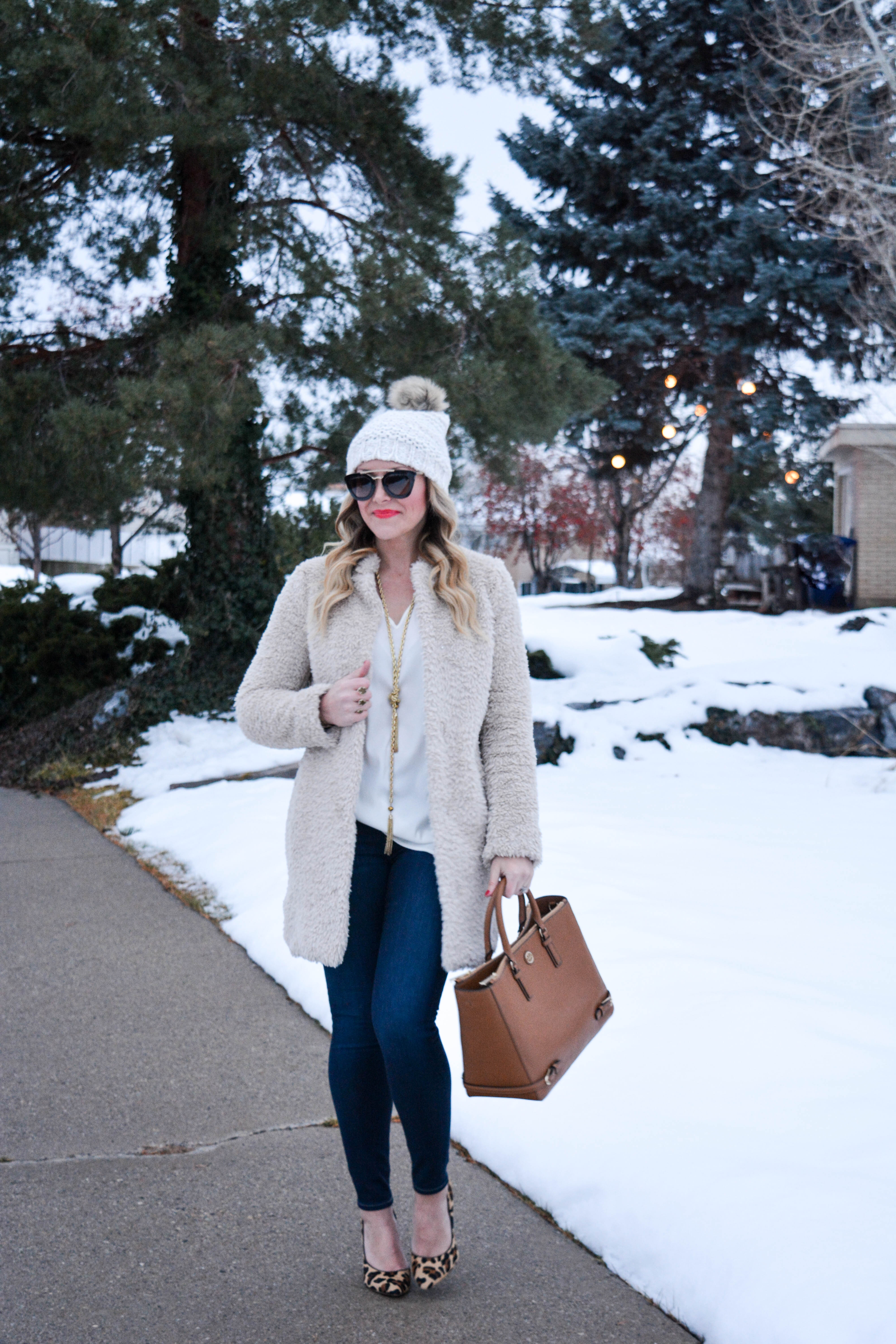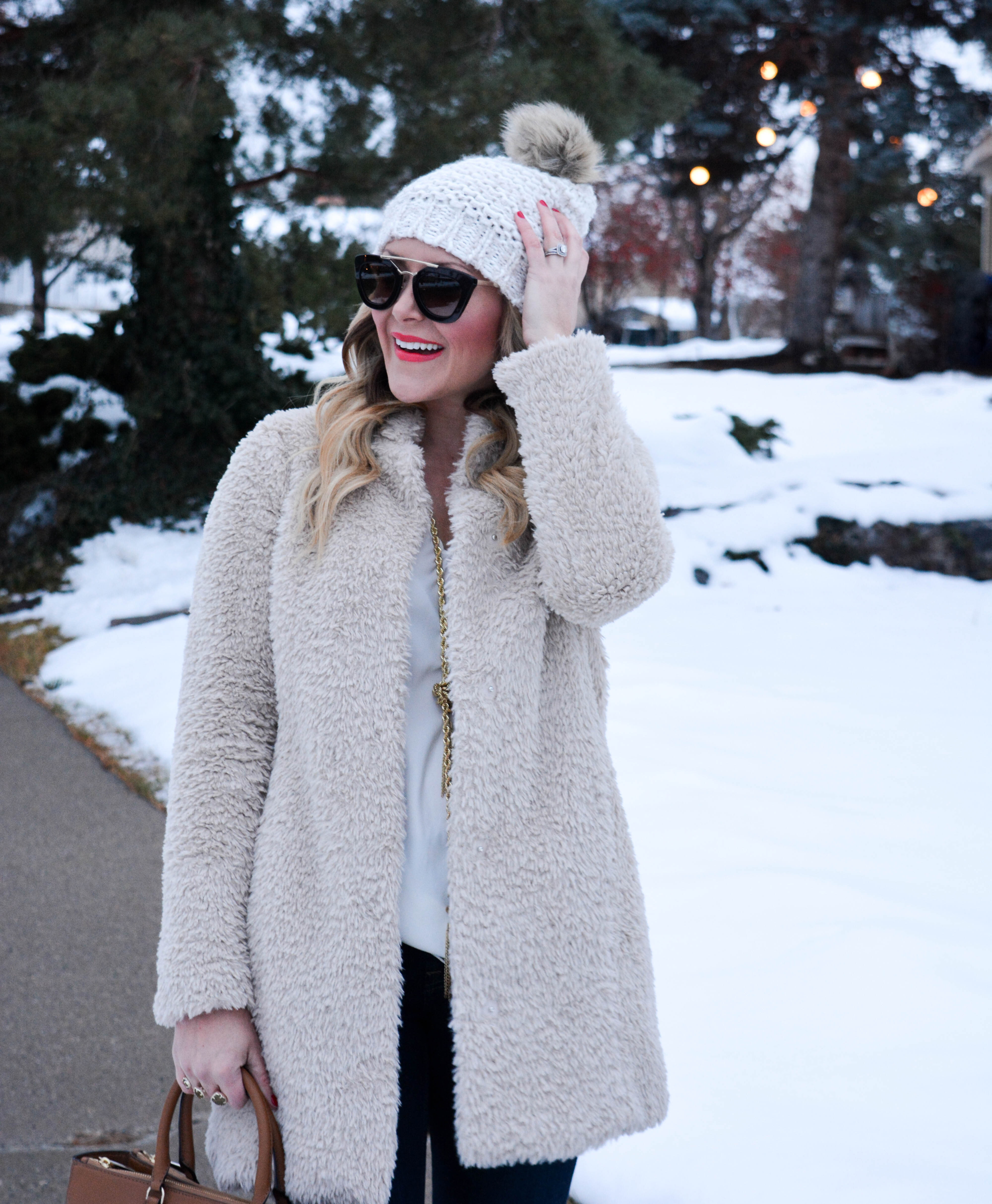 If you are looking to step up your outerwear game this season, then I would highly recommend trying a furry or fuzzy coat.  I initially picked up a blush pink version (which you can see here), and loved it so much, that I have been on the hunt for a more casual option the past few weeks.  And I just so happened to luck out and find this cozy one (on sale!) that was exactly what I was looking for.  Not only do I love the way it looks, but it is incredibly warm and pretty much feels like I am wearing a cloud.  Be sure to scroll to the bottom of the post to shop this coat and my other favorite furry coats of the season!