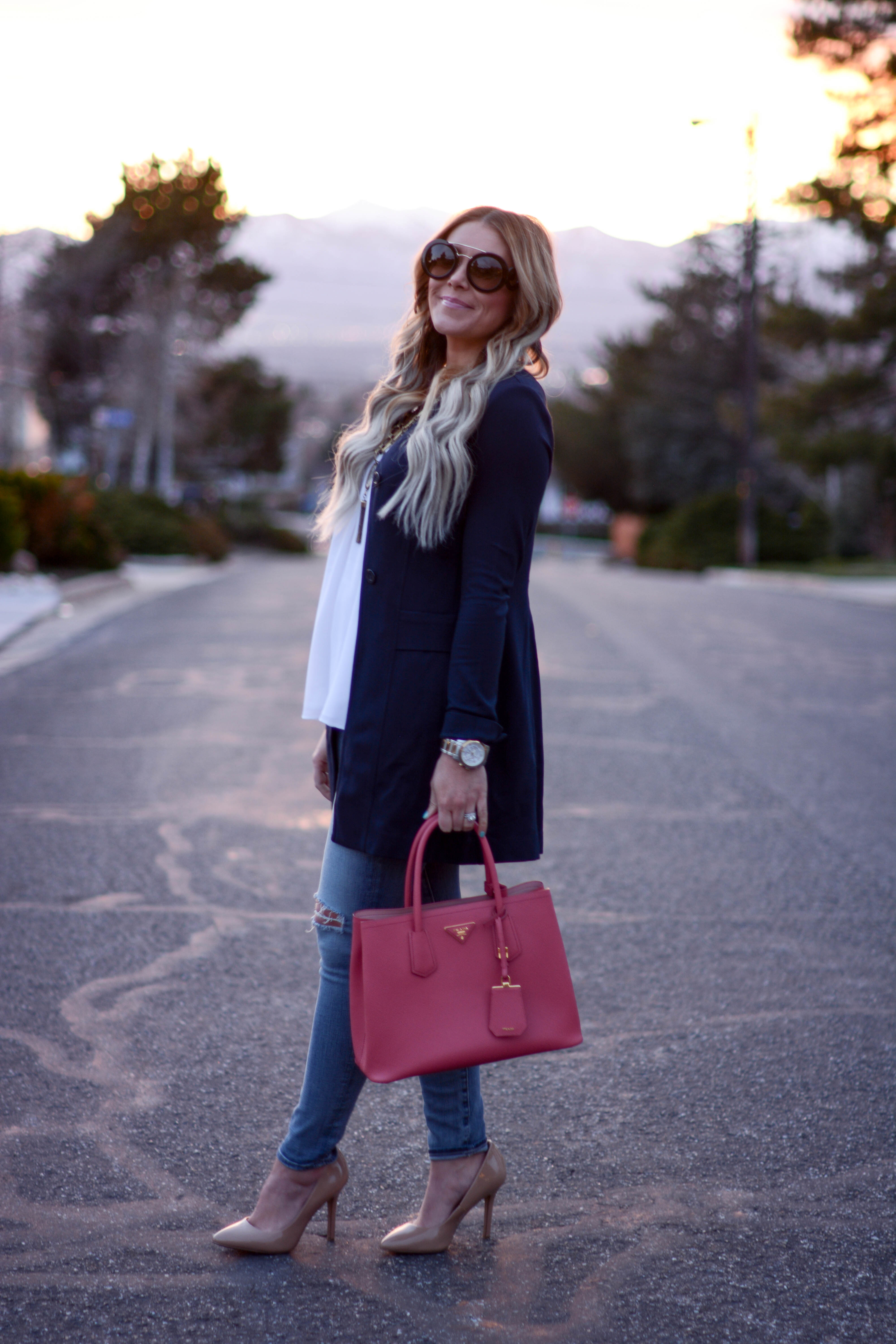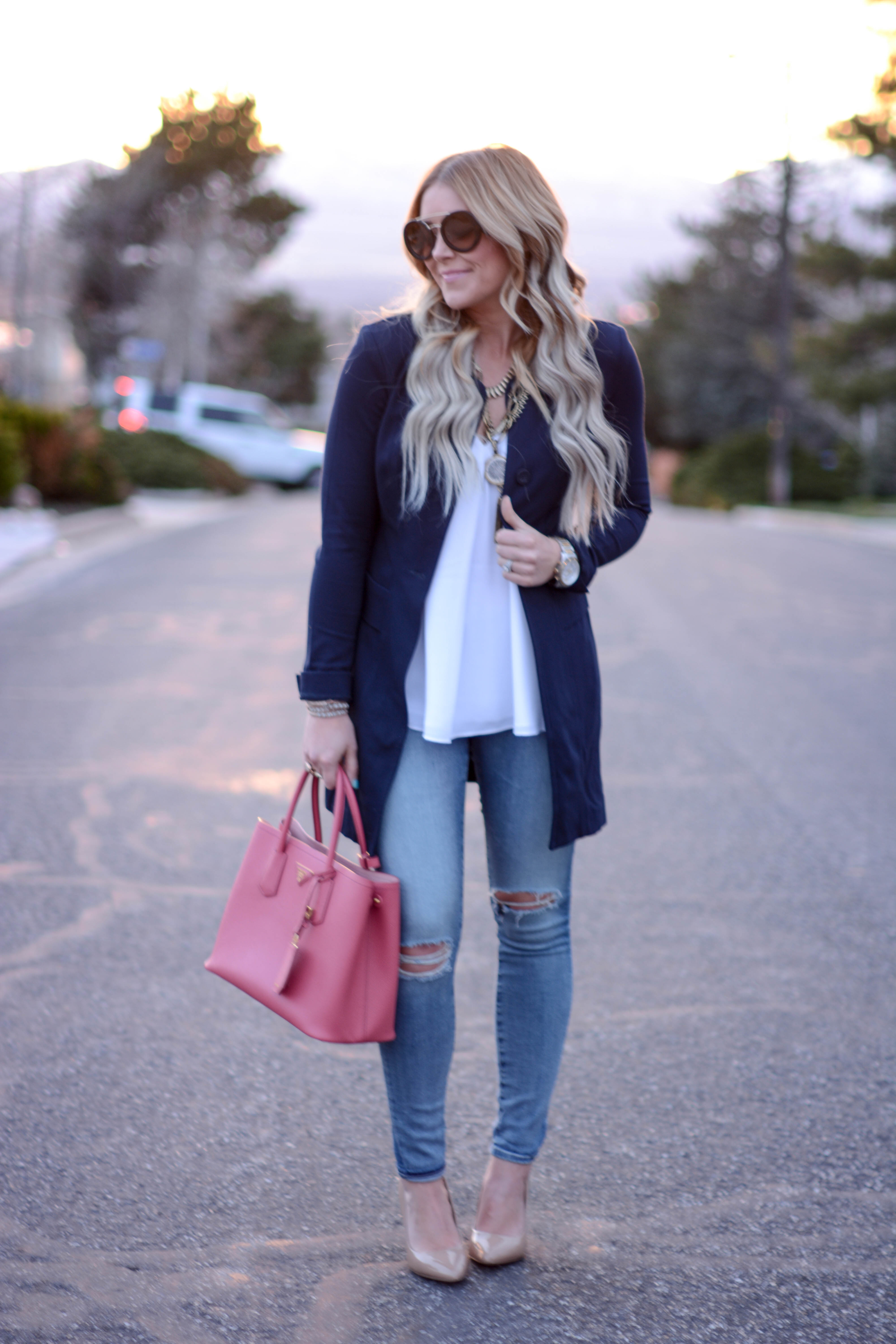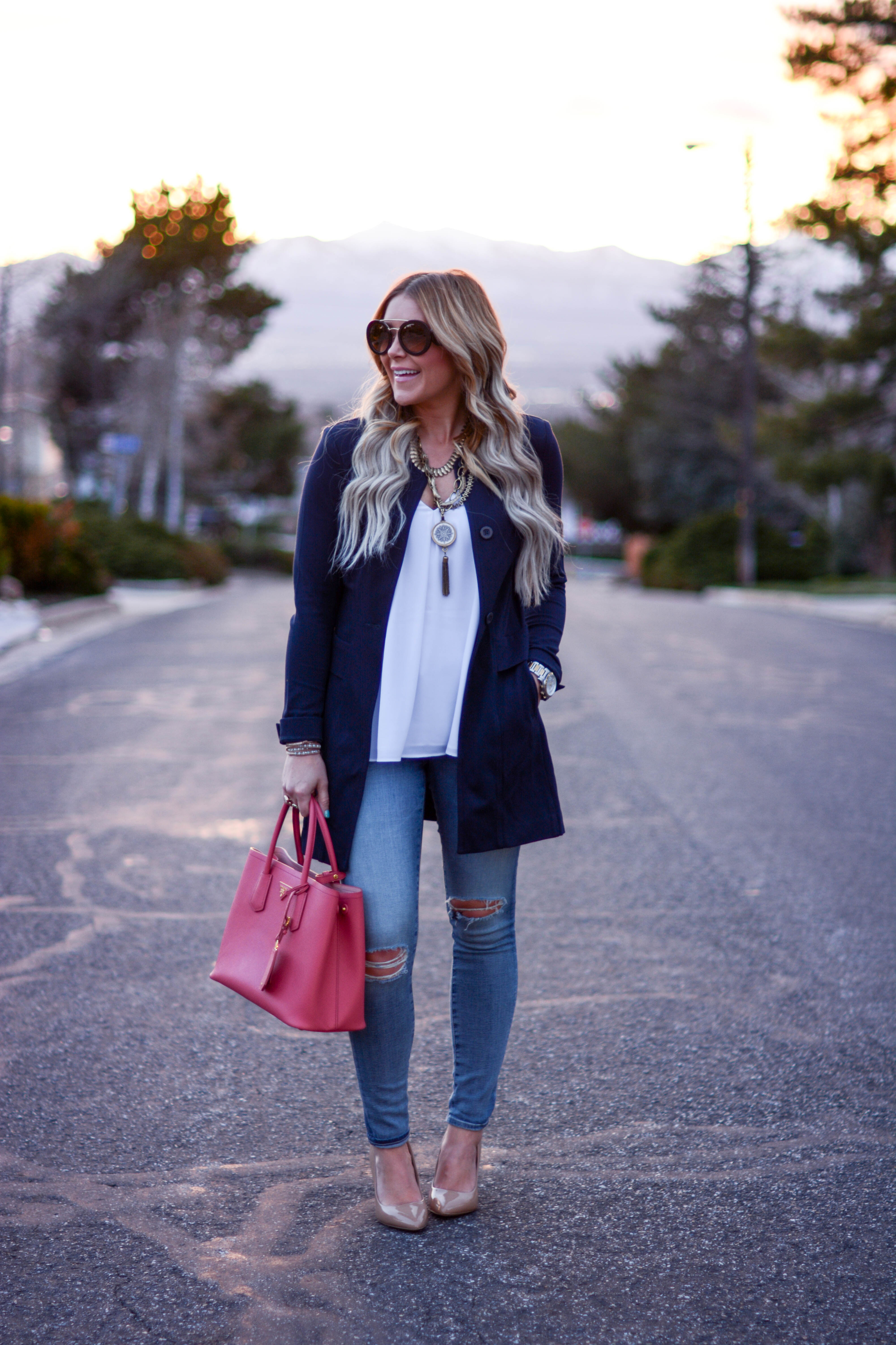 jacket (on sale!) | top (cabi c/o) | necklace | denim | sunglasses | bag | pumps