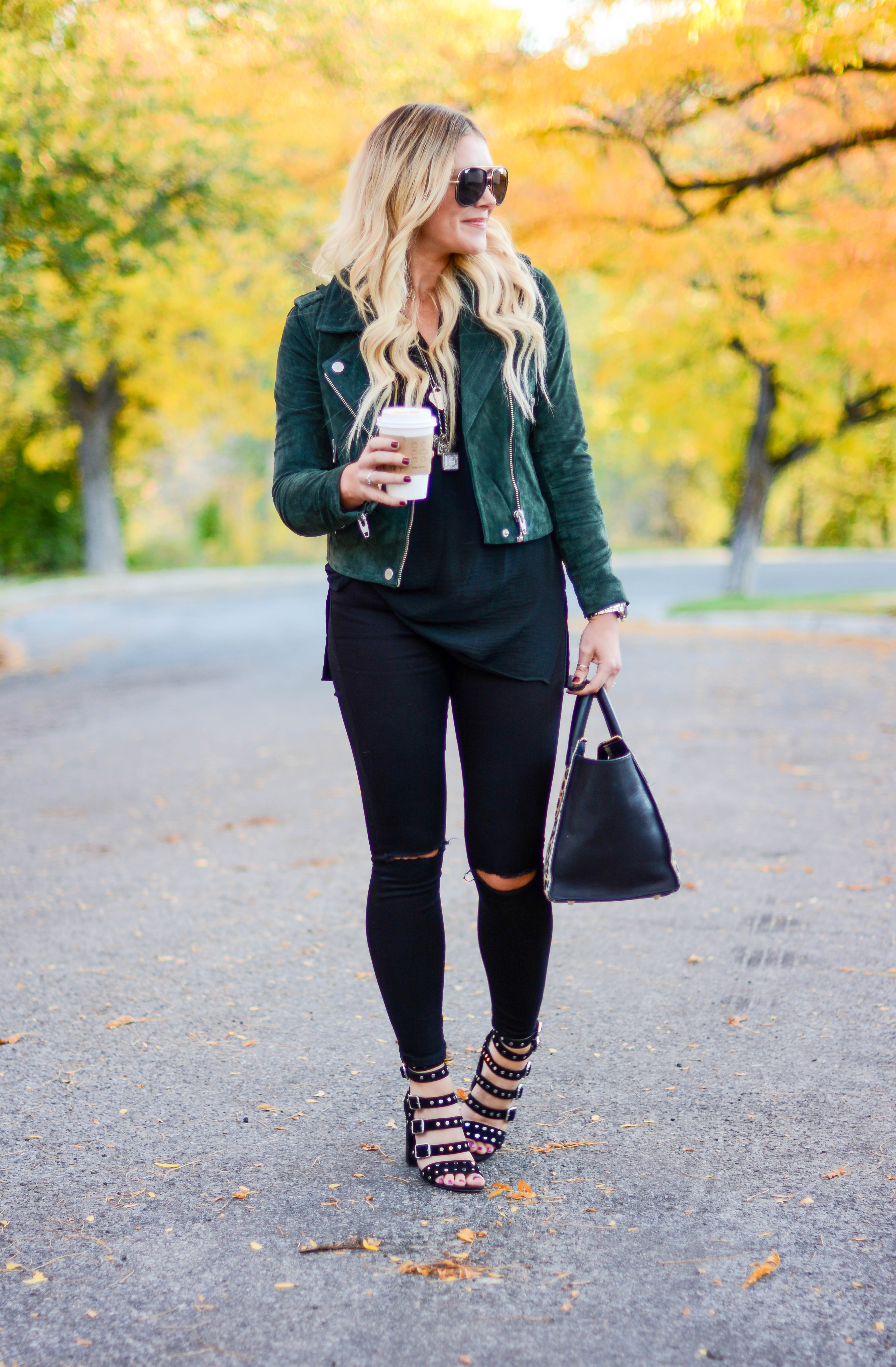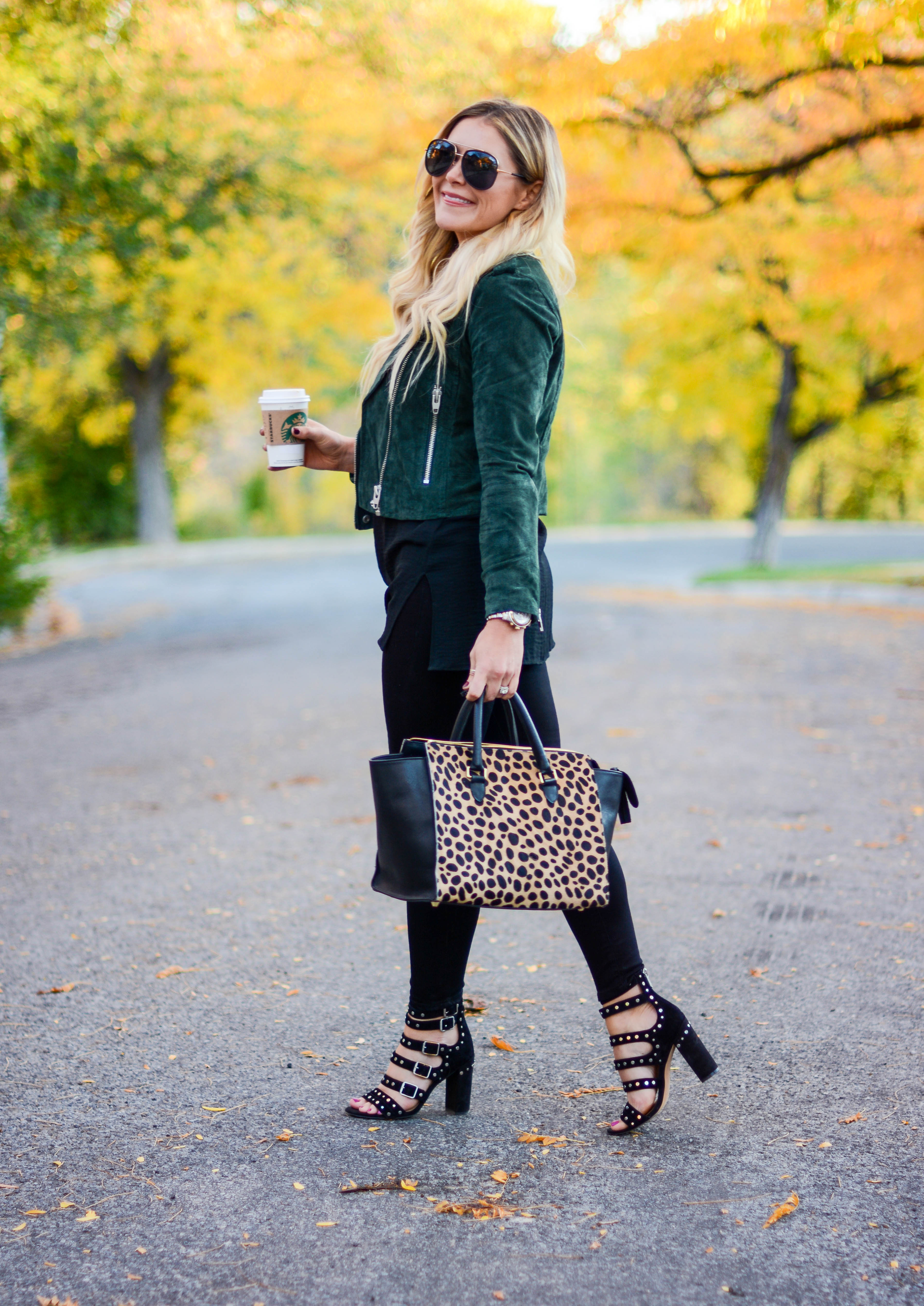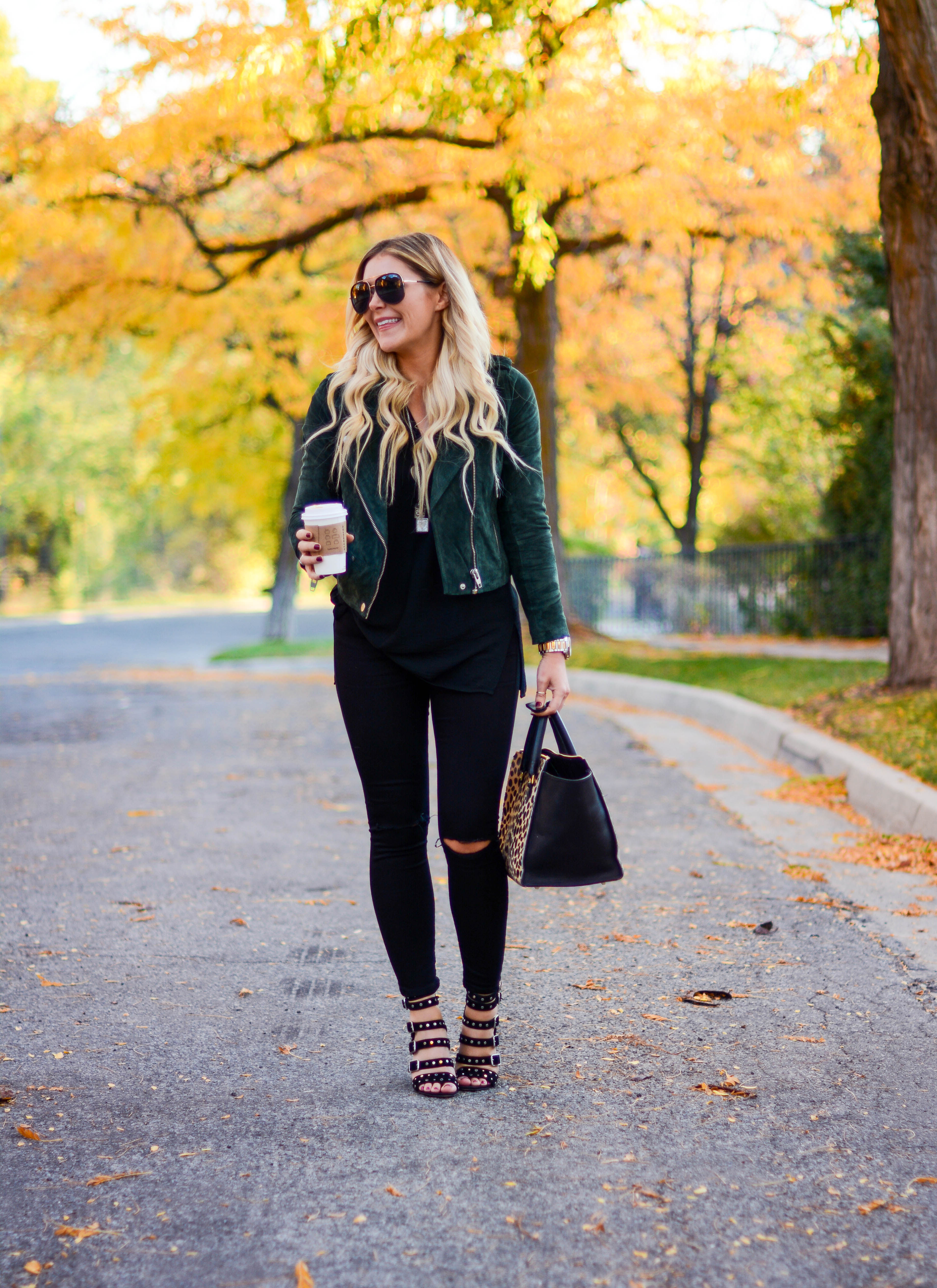 Jacket (TJMaxx), similar, similar, similar | Top | Skinnies (so comfy and less than $100!) | Sunnies | Bag | Heels