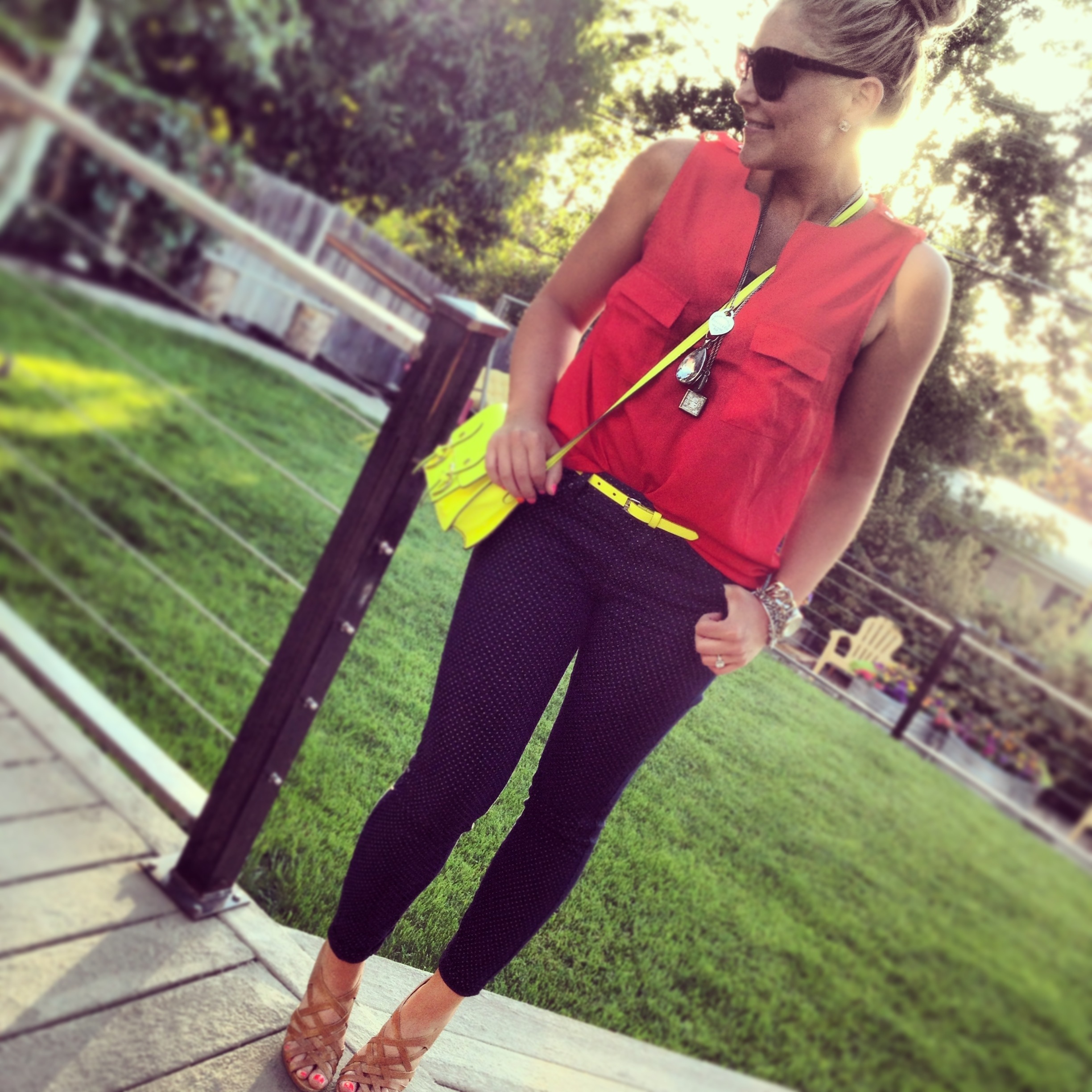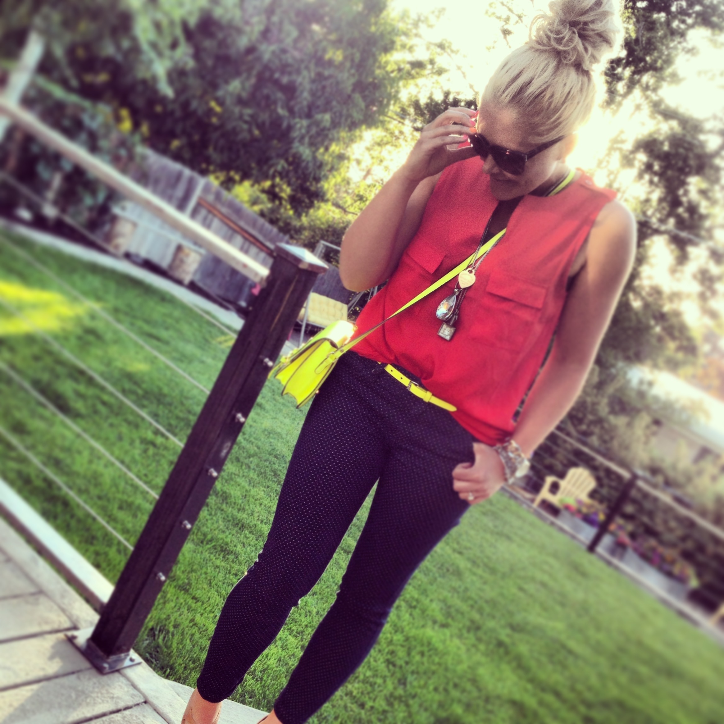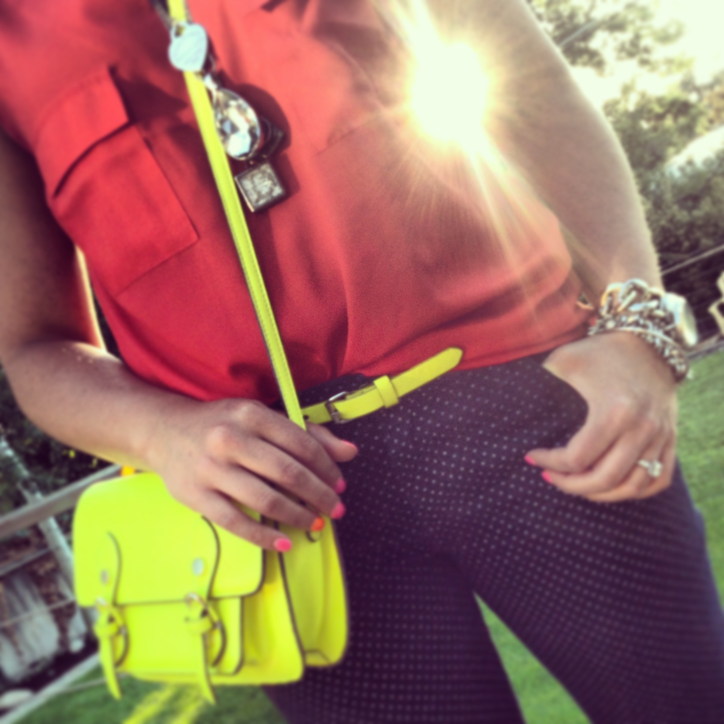 Top:  Forever21, similar, similar | Skinny Slacks:  Gap | Neon Belt:  Macy’s (old), similar | Monogram Necklace:  Keti Sorely Designs | Bracelets:  JCrew, Stella and Dot, Juicy Couture | Watch:  Michael Kors | Sunnies:  House of Harlow Chelsea | Bag:  Olivia+Joy (on sale!) | Shoes:  Chinese Laundry