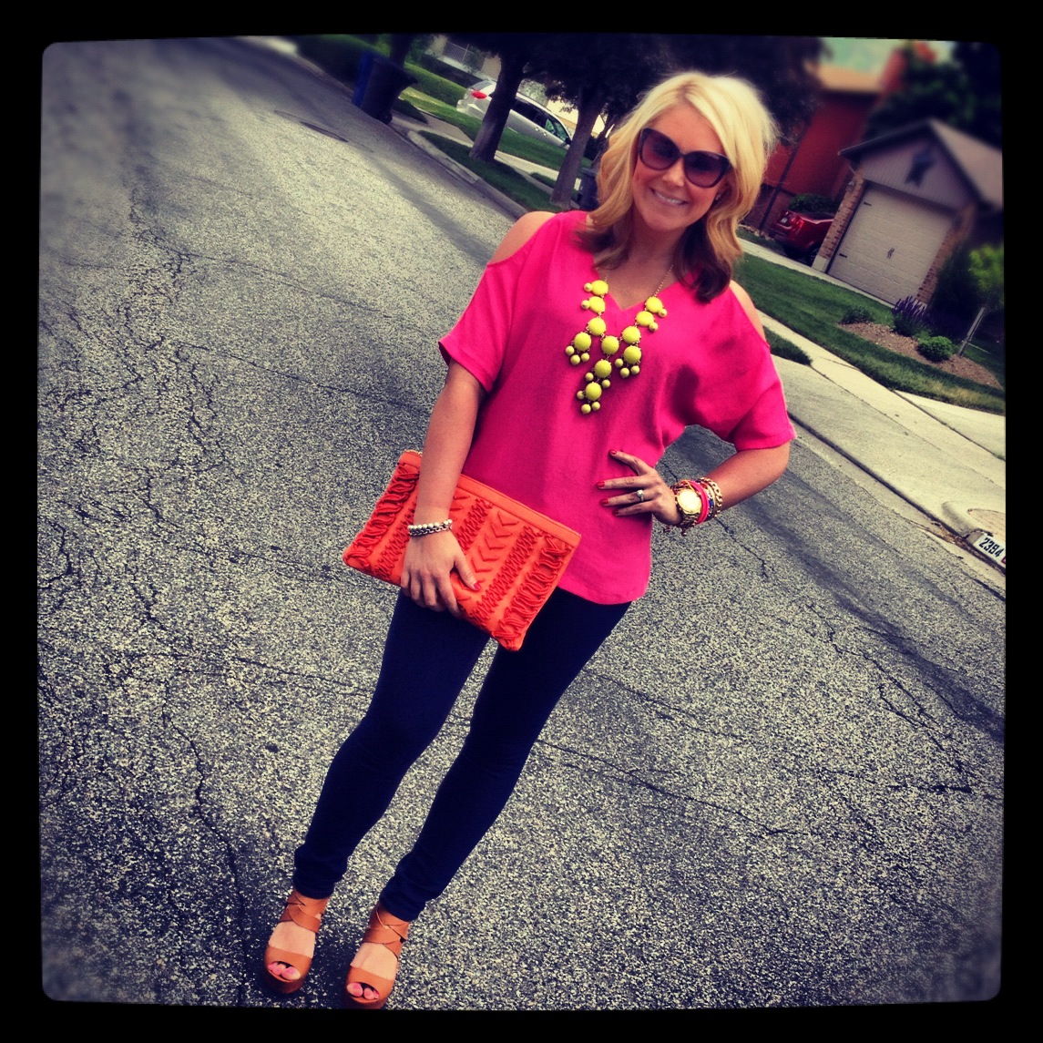I love the cold shoulder trend. I think it is a great way to dress up a simple top-in fact, the other cold shoulder tops in my closet are primarily jersey and most of them seem to have stripes. I tend to gravitate towards them because they are comfy enough to make you feel like you are slipping on your favorite t-shirt, but add a few accessories and some cute shoes, and you have an outfit fit for just about any occasion-including a birthday dinner in your honor! 🙂 They also tend to be flattering on my most figures and are a great way to transition from long sleeves to tank tops. I know I never feel quite ready to show my pasty white arms in the month of May, so a cute cold shoulder top is the perfect middle ground.