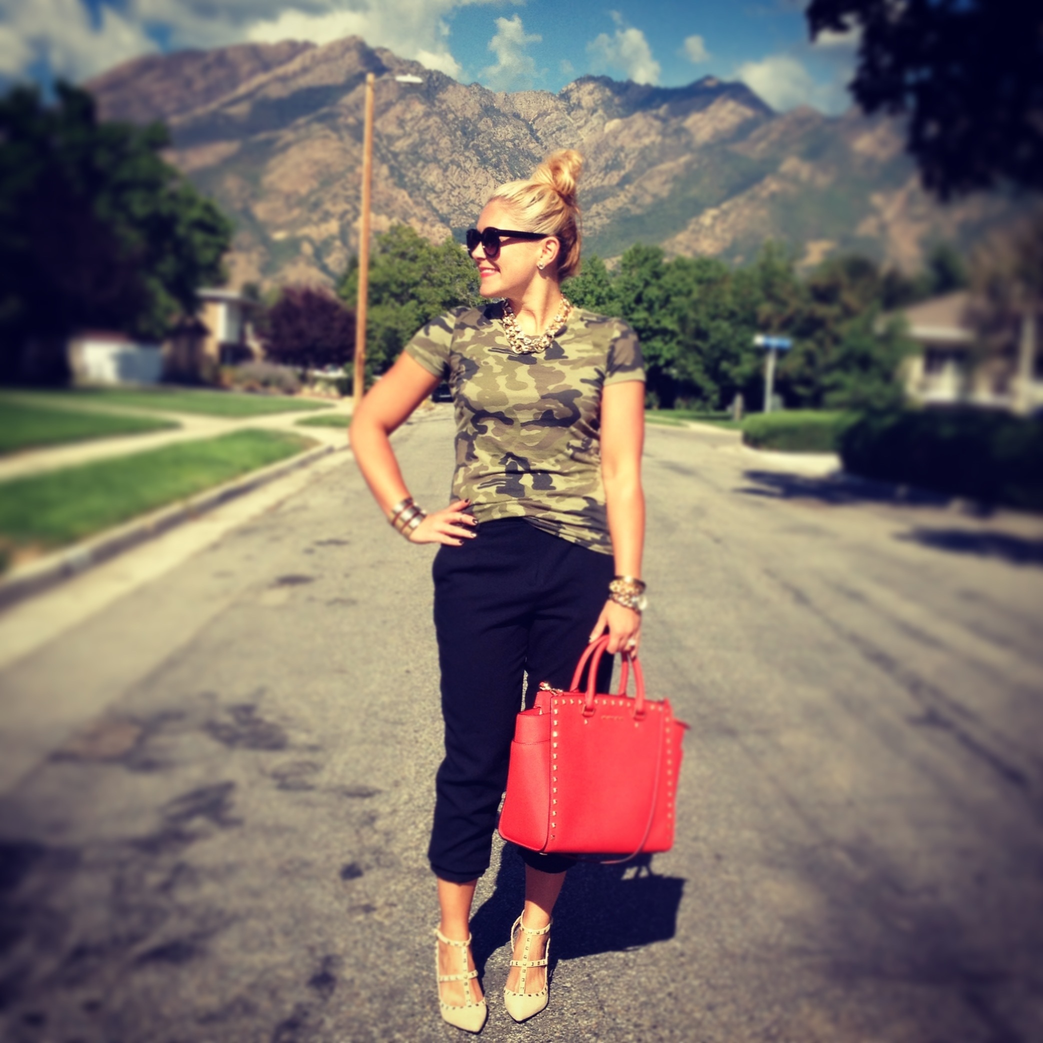 Camo Tee: Blossom Boutique c/o  (only $12!!!!!)| Stovepipe Trousers: BCBGMaxazria (old), similar (on sale!) | Necklaces: JCrew, Stella & Dot | Bracelets: JCrew, Kate Spade, Stella & Dot | Bag: Michael Kors Selma | Pumps: Windsor