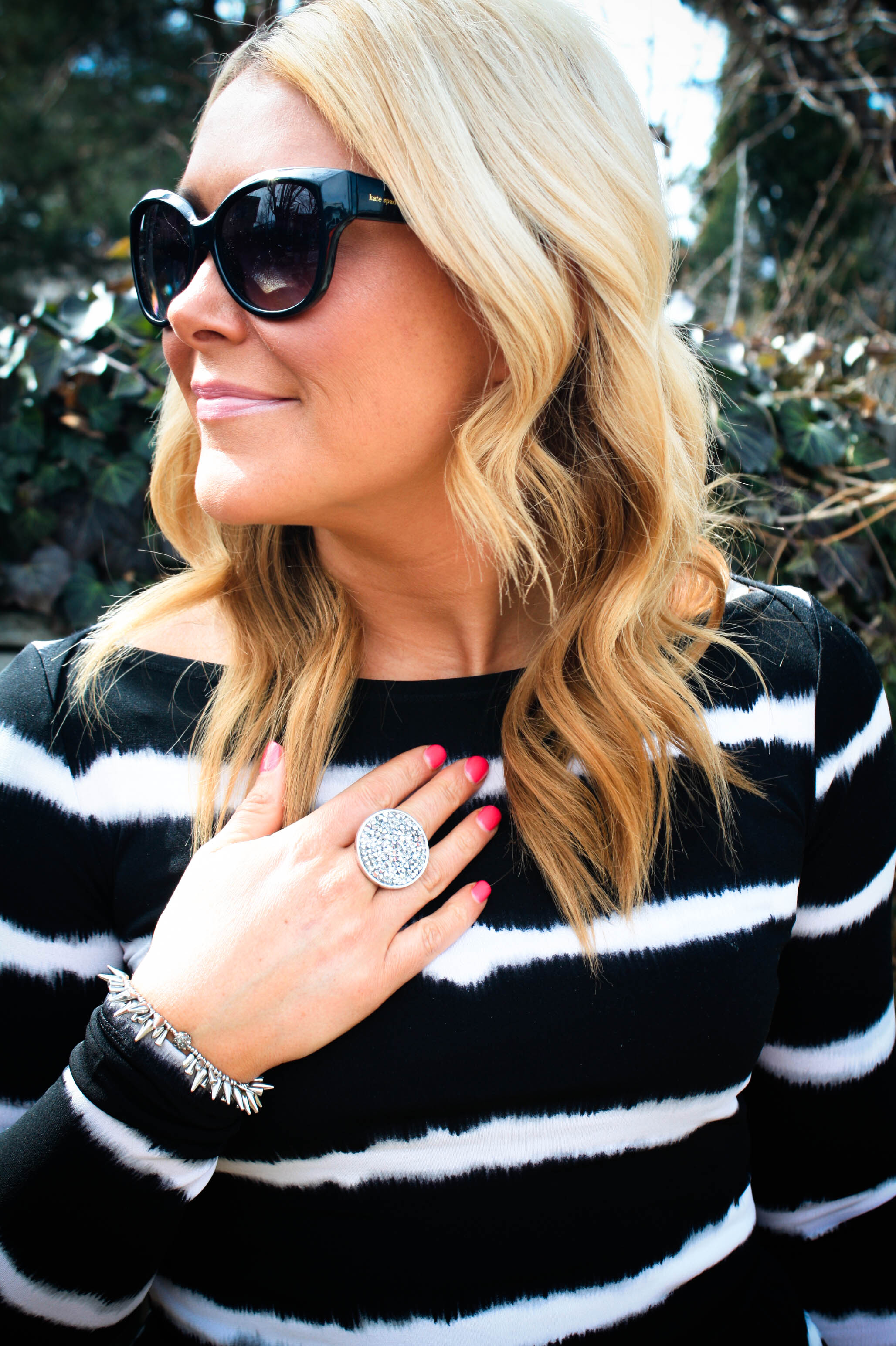 Today I want to introduce you guys to a fabulous jewelry company called Touchstone Crystal.  Now I know the name sounds a little out there (at least that’s what I thought when I first heard about it), but this product is seriously incredible!  In fact, I first discovered it when I thought a girlfriend of mine was wearing diamond solitaire earrings, and when I asked her about them, she let me in on her little secret.  Touchstone Crystal was created by the Swarovski group, and all of the jewelry in turn is made with genuine Swarovski crystals and zirconia (Swarovski Zirconia is the finest simulated diamond in the world).  And do you know what that means?  Not only is the jewelry absolutely gorgeous, and top notch quality, but it is also affordable!  I picked up the beautiful statement ring I am wearing in the below photos and I can’t even being to convey how much I love it.  And not only that, but with most pieces under $100, I can’t wait to add a few more things to my jewelry collection.