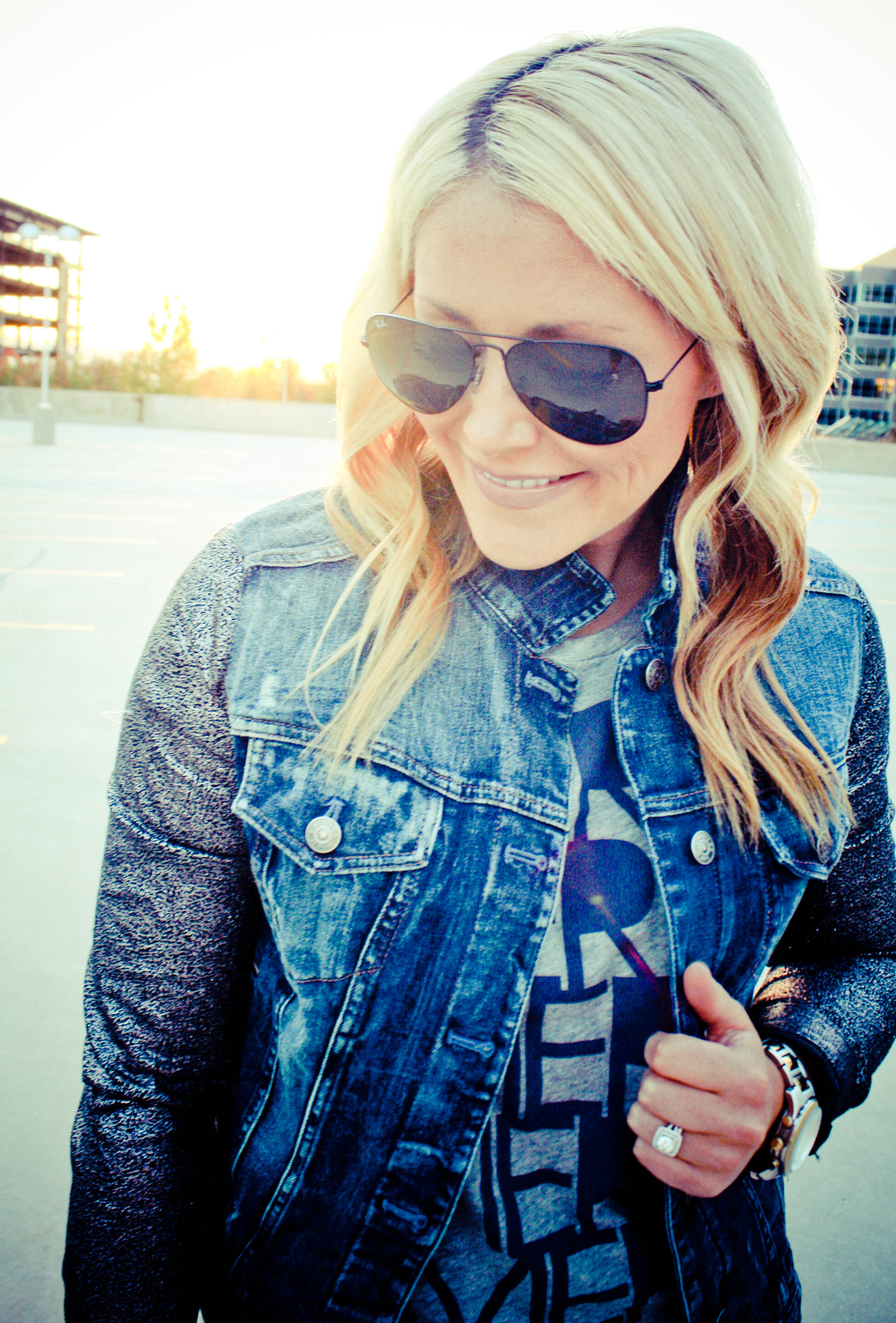 Jacket: American Eagle, LOVE this version | T-shirt: H&M (old), LOVE this | Skinnies: American Eagle | Sunnies: Ray-ban | Bag: Tory Burch | Chucks: Steve Madden