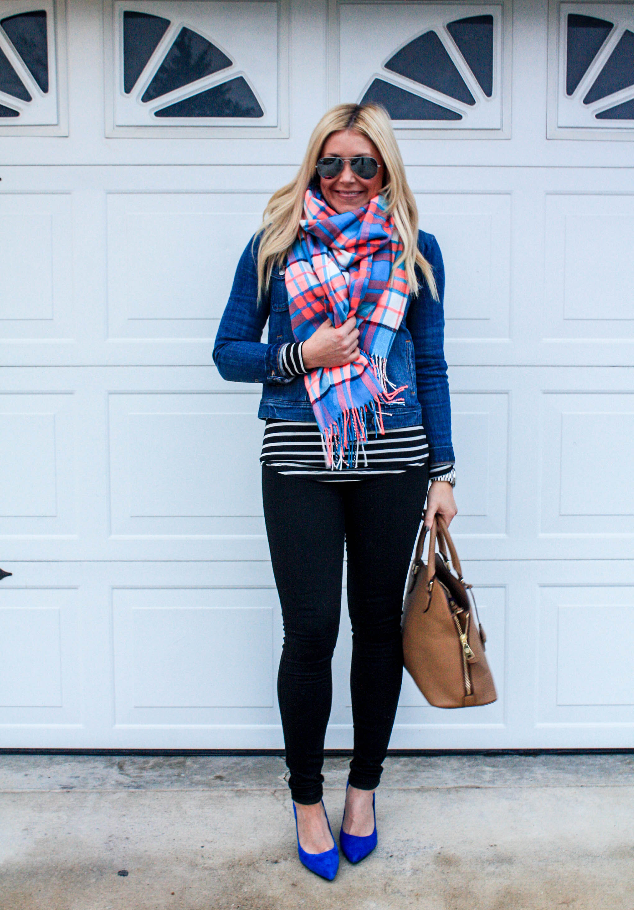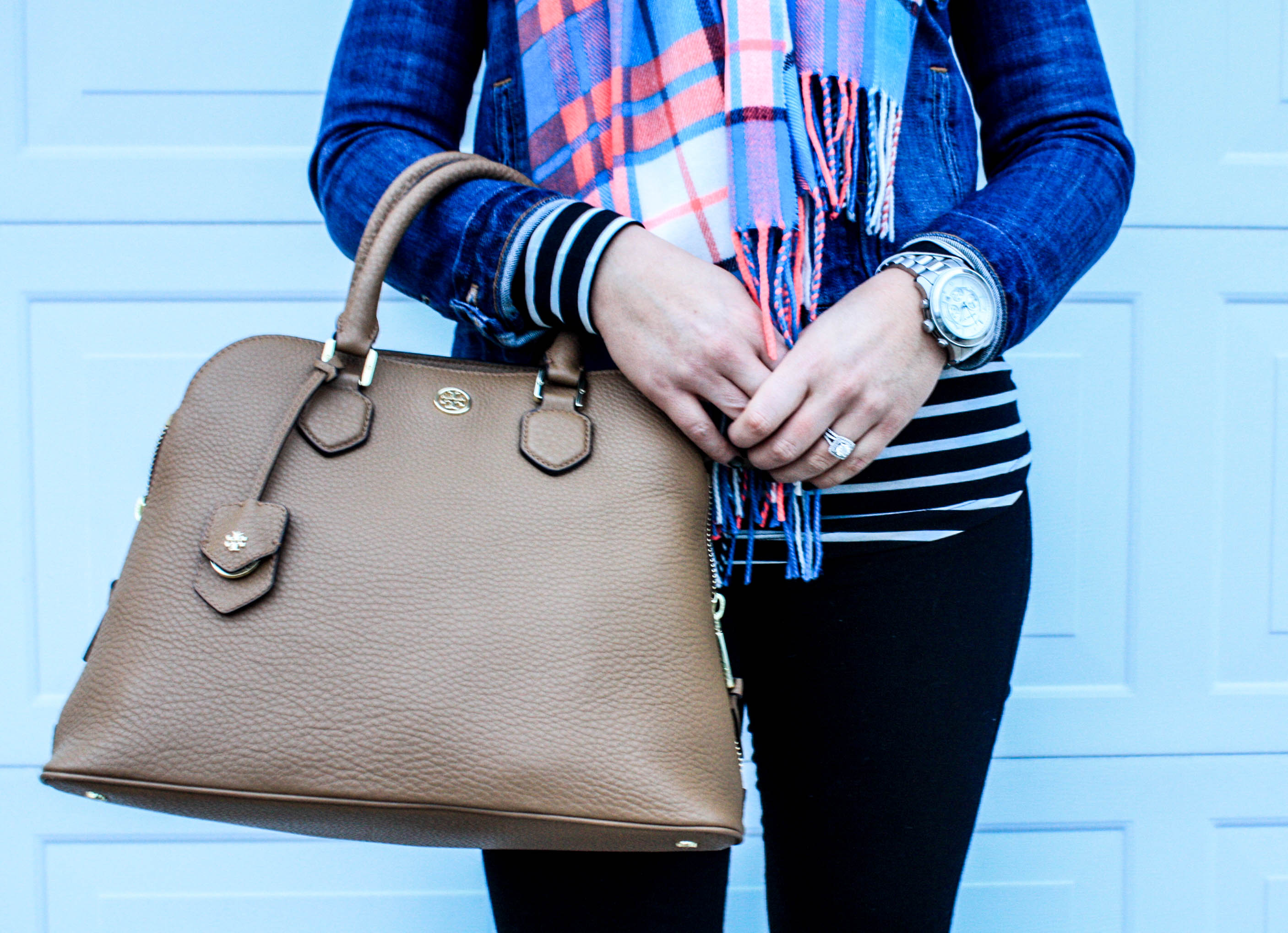 Denim Jacket: JCrew (runs a little big so size down!), also love this one | Striped Turtleneck: Old Navy (on sale for UNDER $7!!), similar non-turtleneck version | Skinnies: 7 for all mankind | Scarf: Gap (old), similar, similar | Sunnies: Ray-Ban | Bag: Tory Burch | Pumps: Nine West