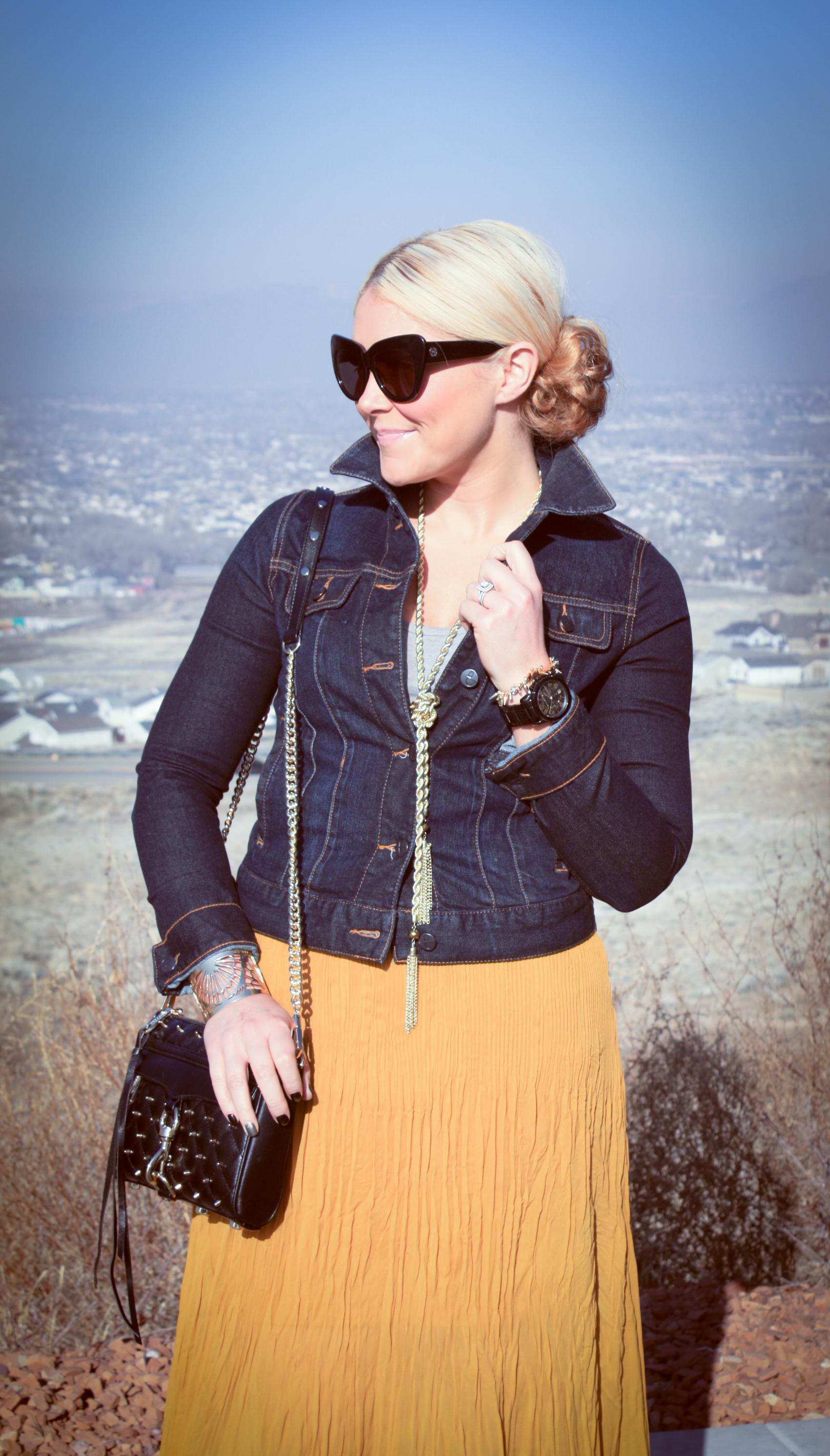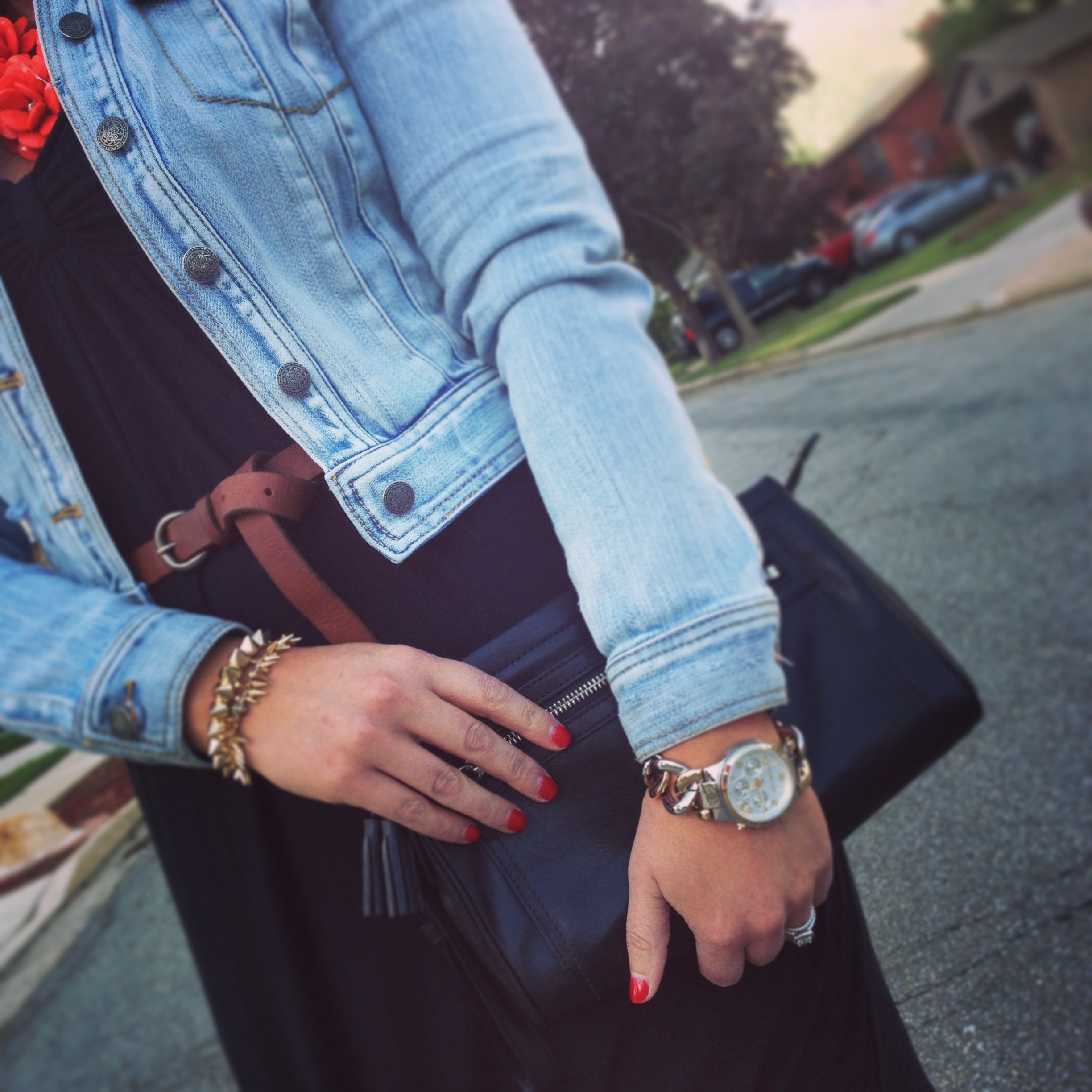 Maxi: Old Navy (old), similar, similar | Denim Jacket: Macy’s | Necklace: Groop Dealz, similar | Bracelet Watch: Michael Kors | Bracelets: Stella & Dot, Aldo | Sunnies: Nordstrom, similar | Clutch: Coach | Wedges: Dolce Vita , new version