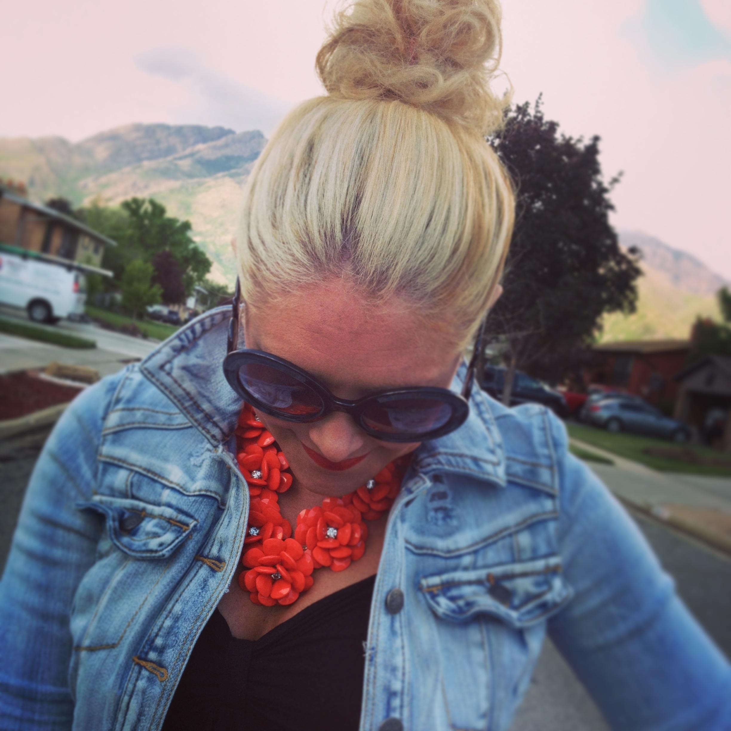 And second, I have to say I am grateful to even be getting a blog up today.  I had big regional meetings last week at work-which meant a lot of late nights and early mornings-definitely no time for blog photos.  And then over the weekend (when I had planned to catch up), I ended up with a terribly sick hubby AND the SLC had a whirlwind of crazy, stormy weather, including SNOW!  Let’s just say, the odds were not in my favor.  But fortunately, we were able to sneak in one quick outfit right as the sun went down last night.  And I have to say, I am loving my pretty red lace dress paired back to a deconstructed denim jacket (with a hoodie no less).  You know me, I always love an unexpected mix of casual and dressy…