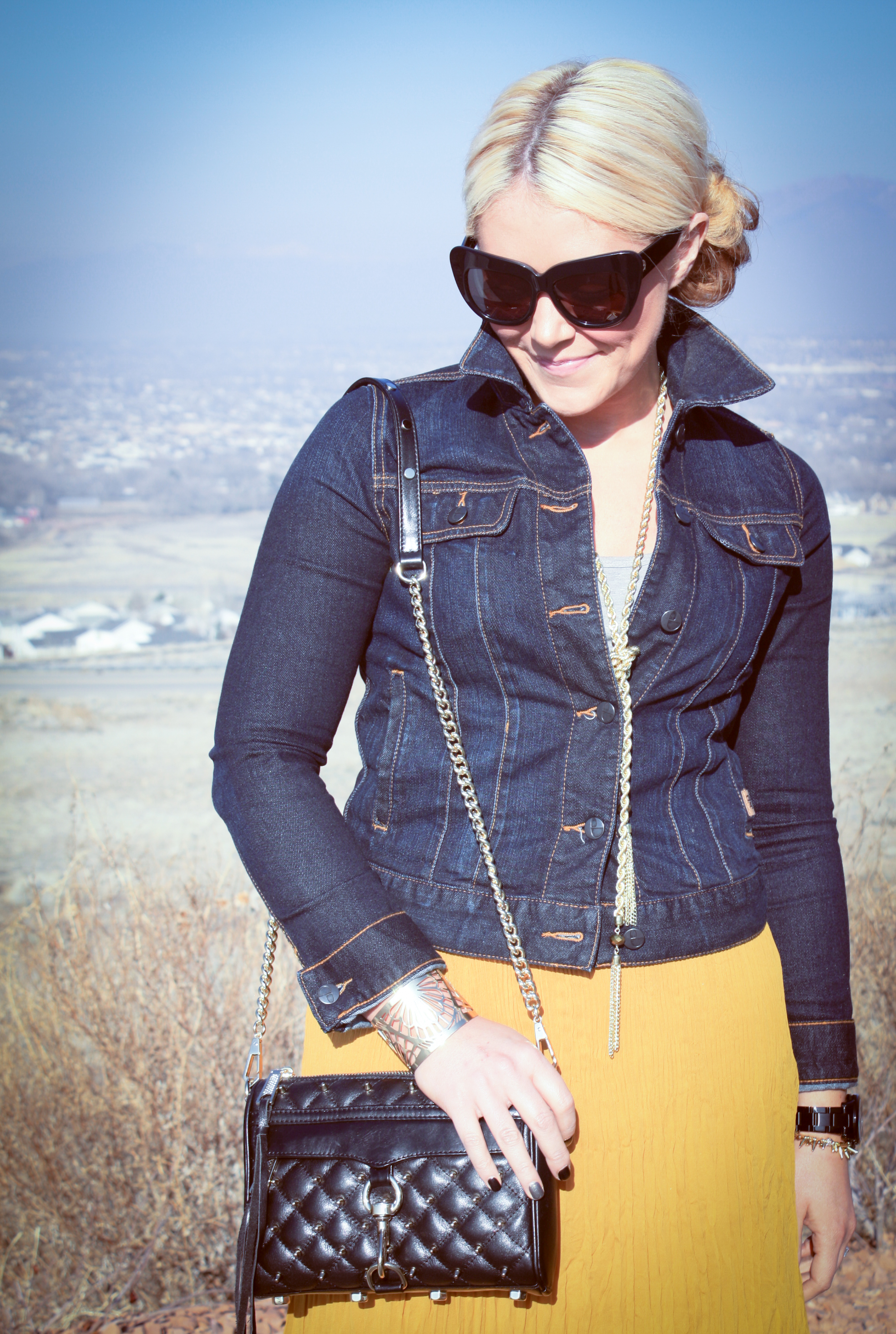 Jean Jacket: Else by Joe’s Jeans (old), similar, similar | Skirt: BarIII (old), similar, similar, LOVING this lace version | Necklace: Jeweliq | Cuff: H&M (old), similar | Bracelet: Stella & Dot Renegade | Watch: Michael Kors | Sunnies: House of Harlow Chelsea | Bag: Rebecca Minkoff | Pumps: Ivanka Trump (on sale!!)