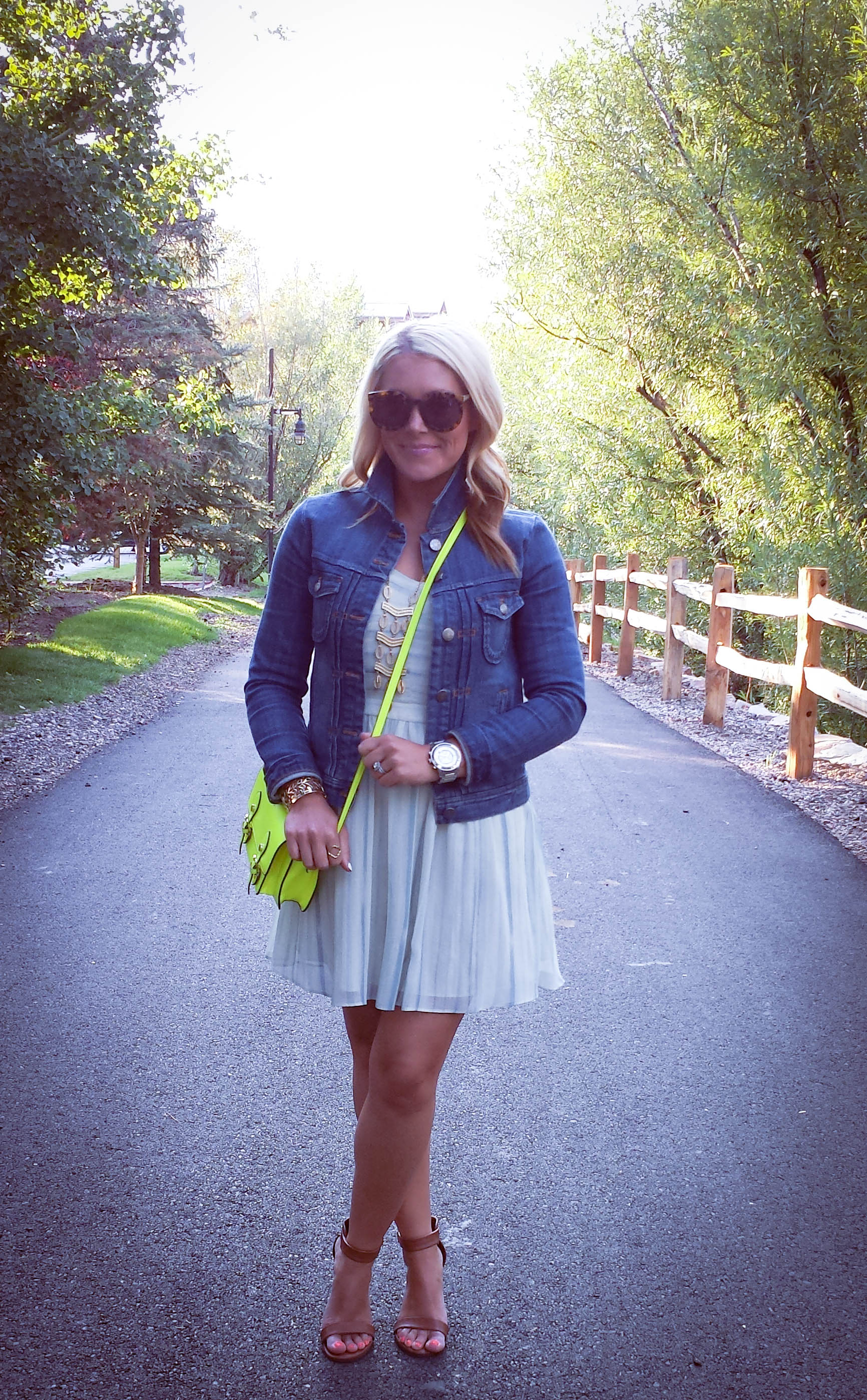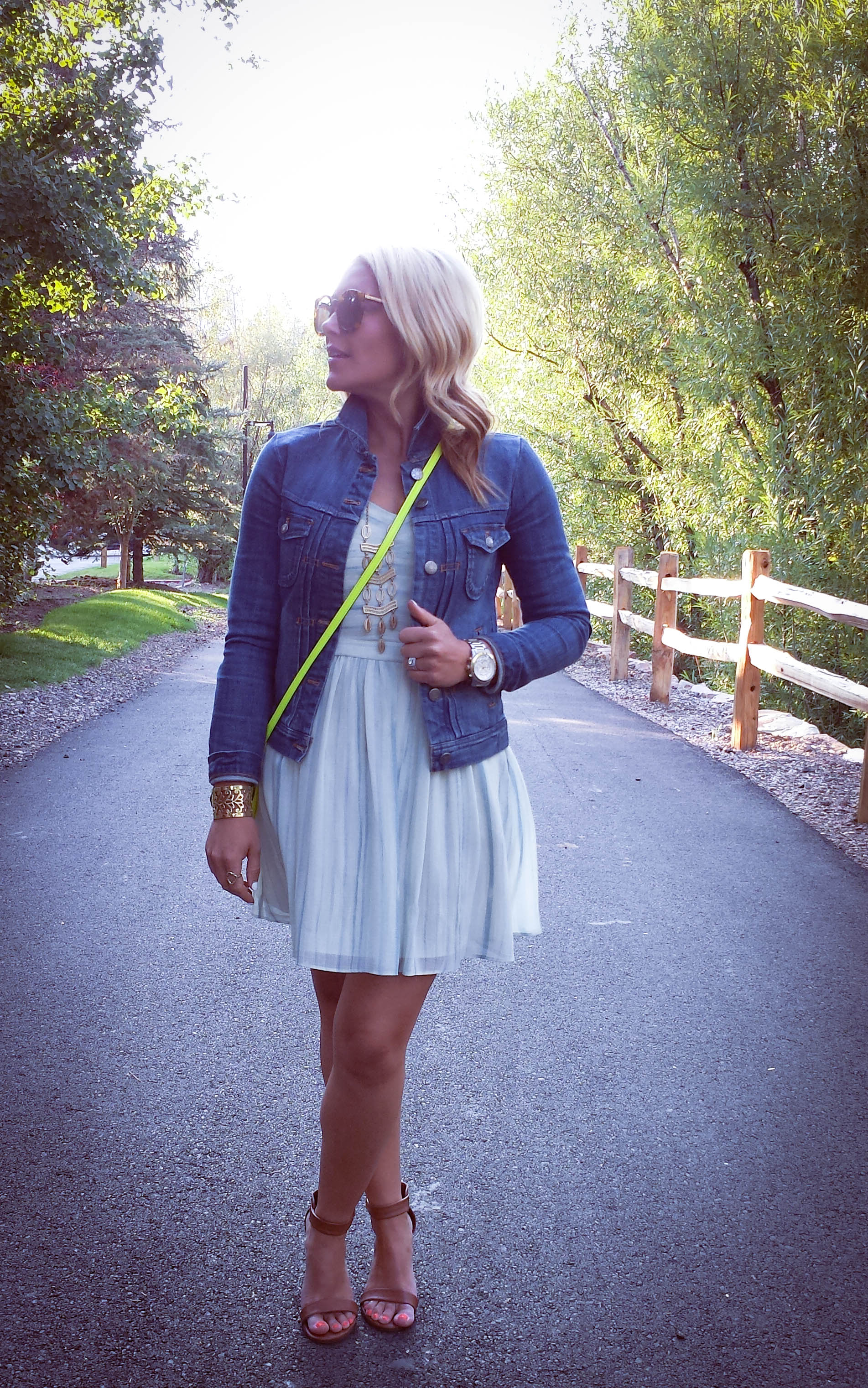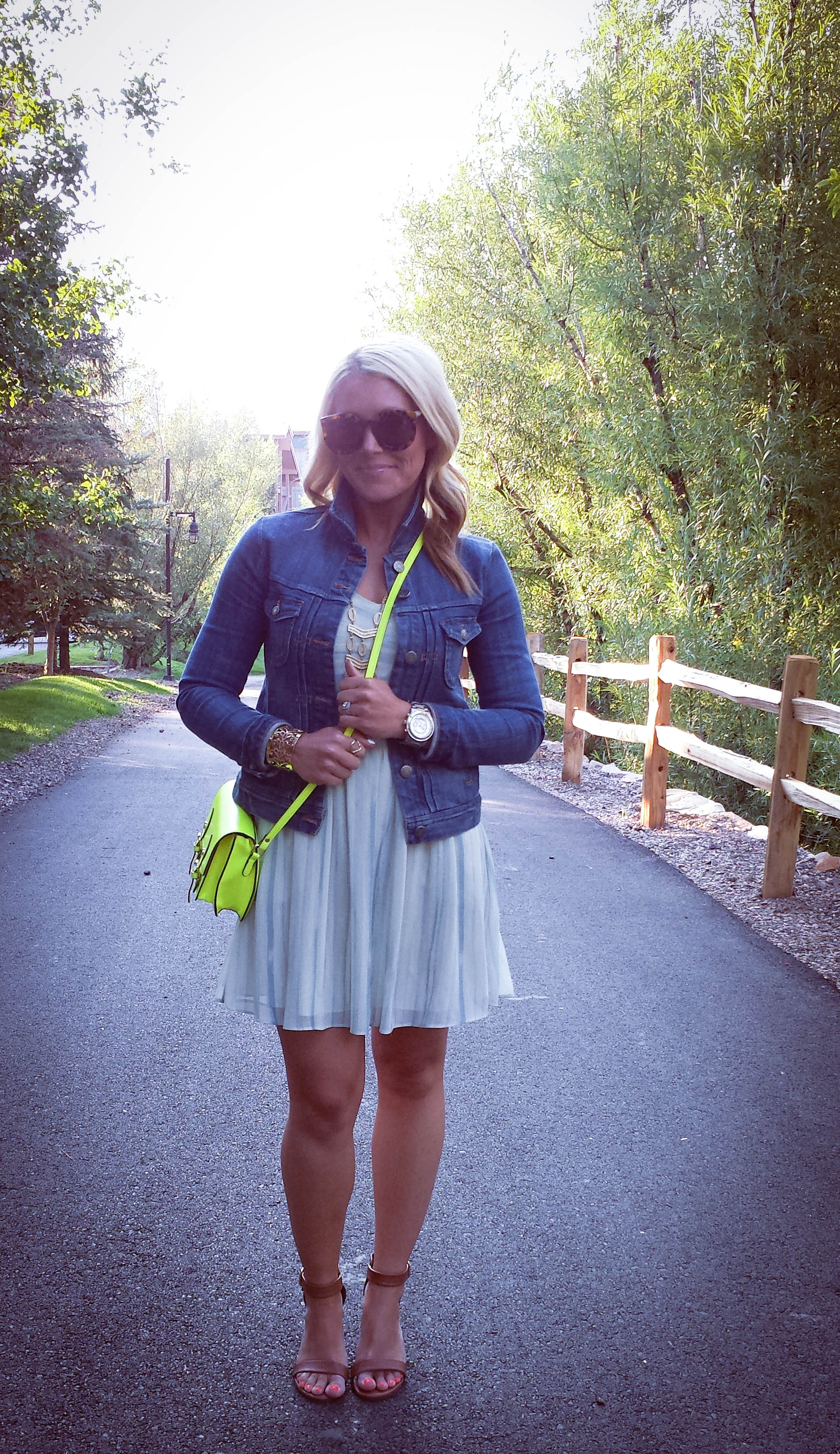 This past weekend, J and I had a little staycation up in Park City.  And even though it was officially the last weekend of summer, the Fall season has already crept into the mountains.  The leaves are starting to change colors and it was definitely jacket weather.  But since I’m not ready to give up dresses quite yet, I am extending their seasonality by pairing them back to denim and leather jackets.  And I’ve got to say, summer to fall transitional fashions are some favorite looks to put together!