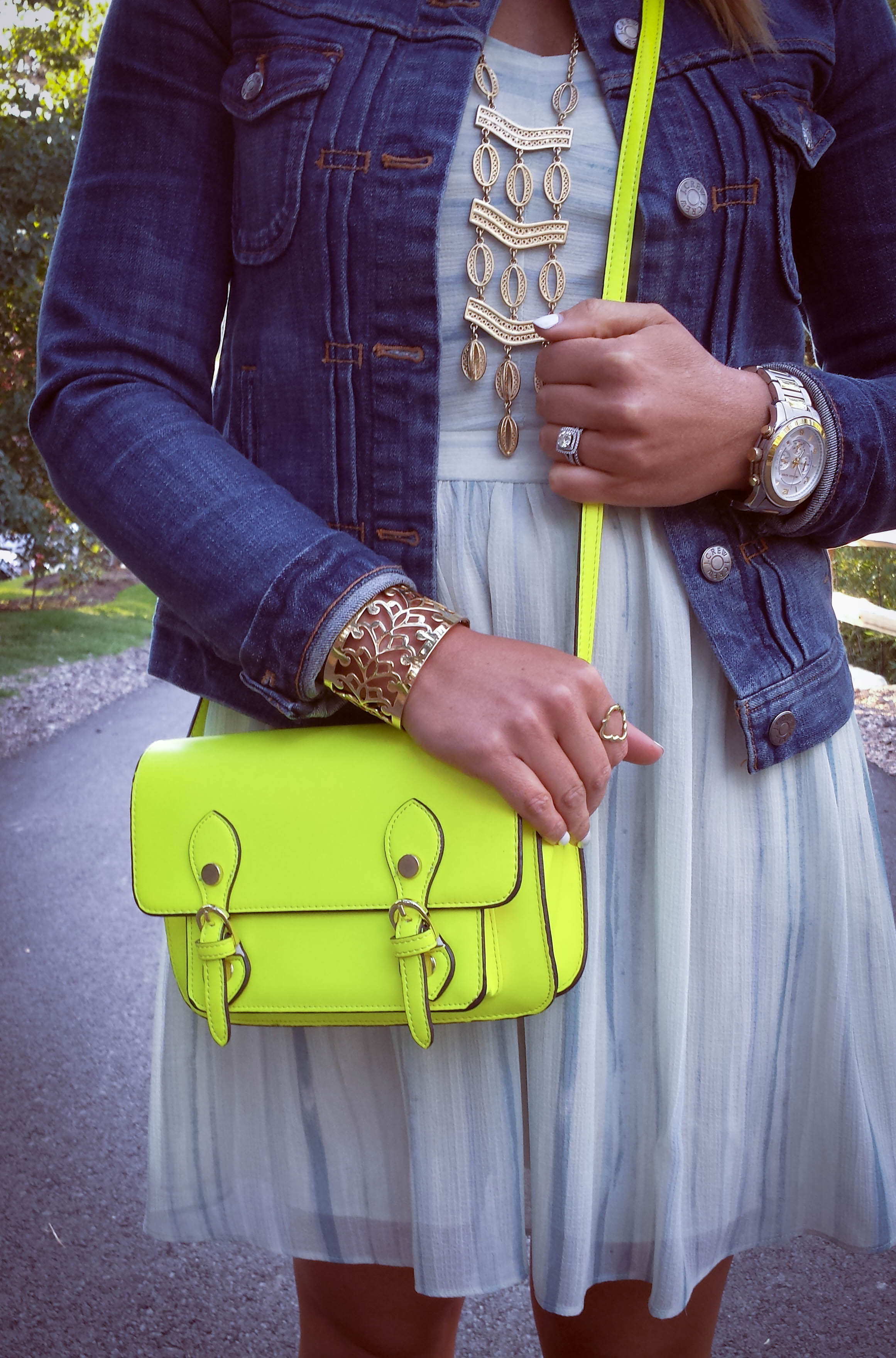 Dress: Rachel Roy (on sale for under $30-runs small so size up!), similar, similar | Denim Jacket: JCrew (on sale for under $60!) | Necklace: Stella & Dot | Cuff: Macy’s | Watch: Michael Kors, similar | Sunnies: Karen Walker | Bag: Steve Madden (old), similar, LOVE this one | Wedges: Material Girl via Macy’s (sold out), similar
