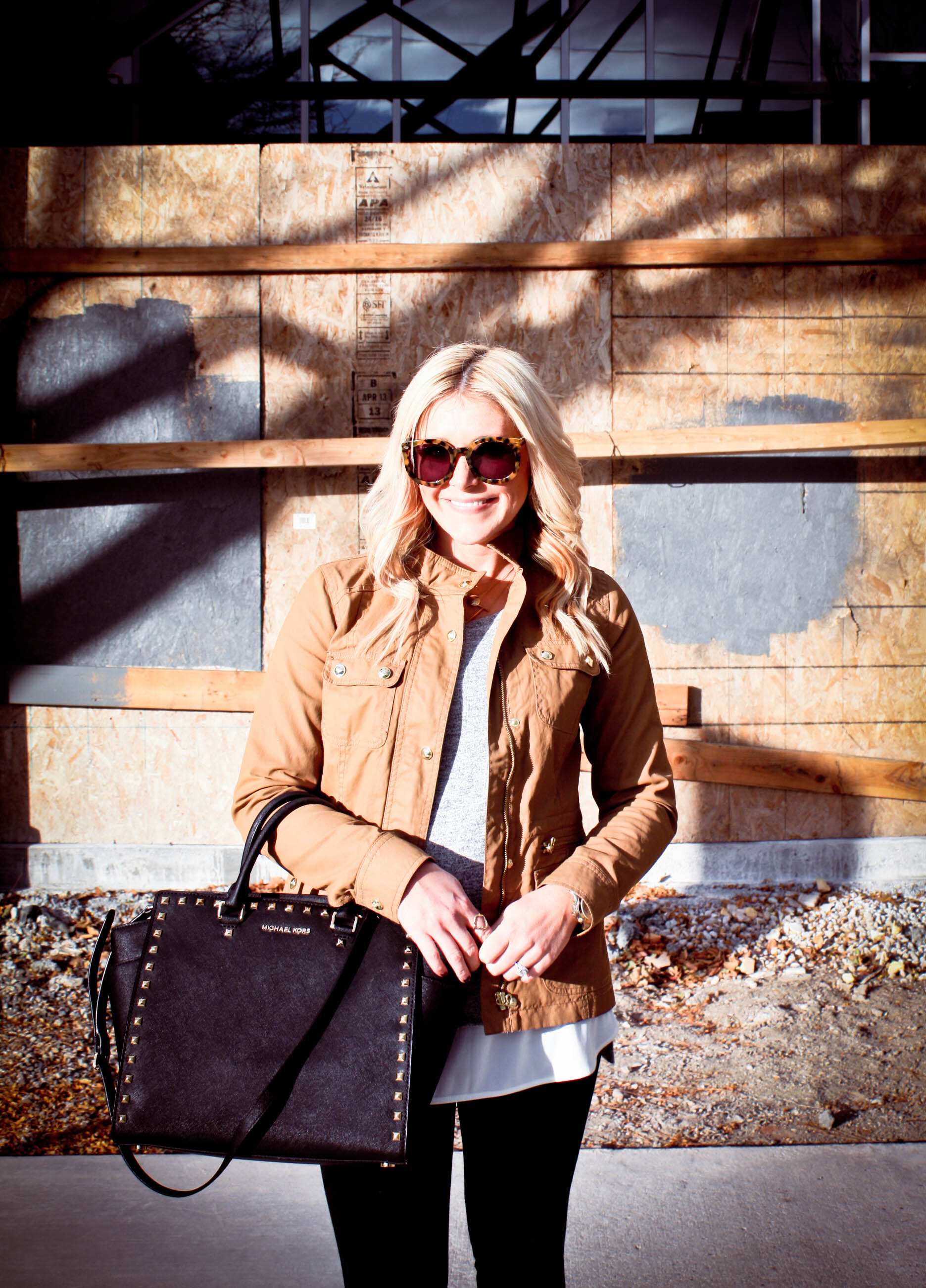Jacket: Forever21 (sold out), similar, similar, LOVE this and this | Silky Tee: Express (my FAVE!) | Skinnies: Paige | Beanie: Free People (on sale!!) | Necklace: Moose and Nigel c/o | Ring: Kendra Scott | Sunnies: Ray-ban | Bag: Tory Burch | Pumps: BCBG