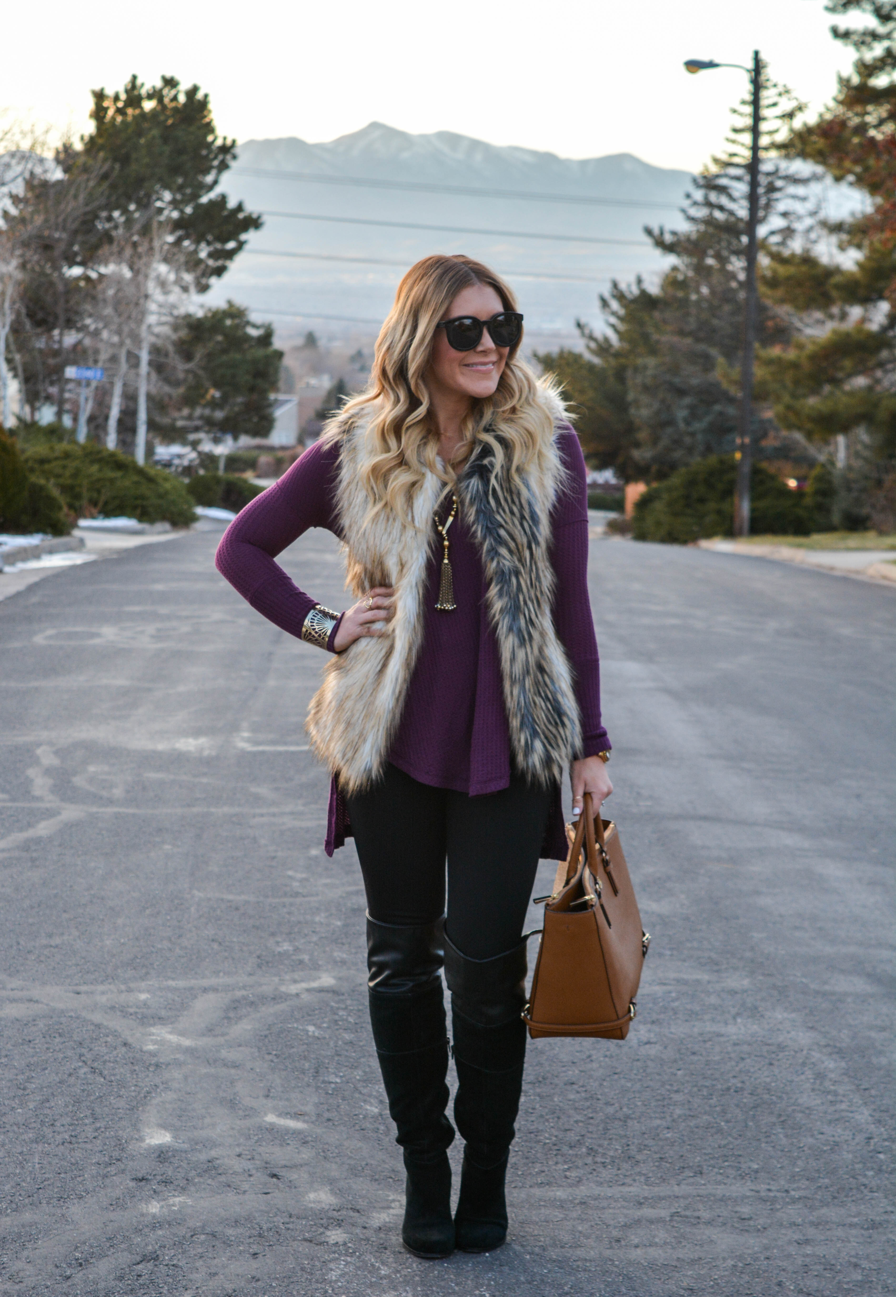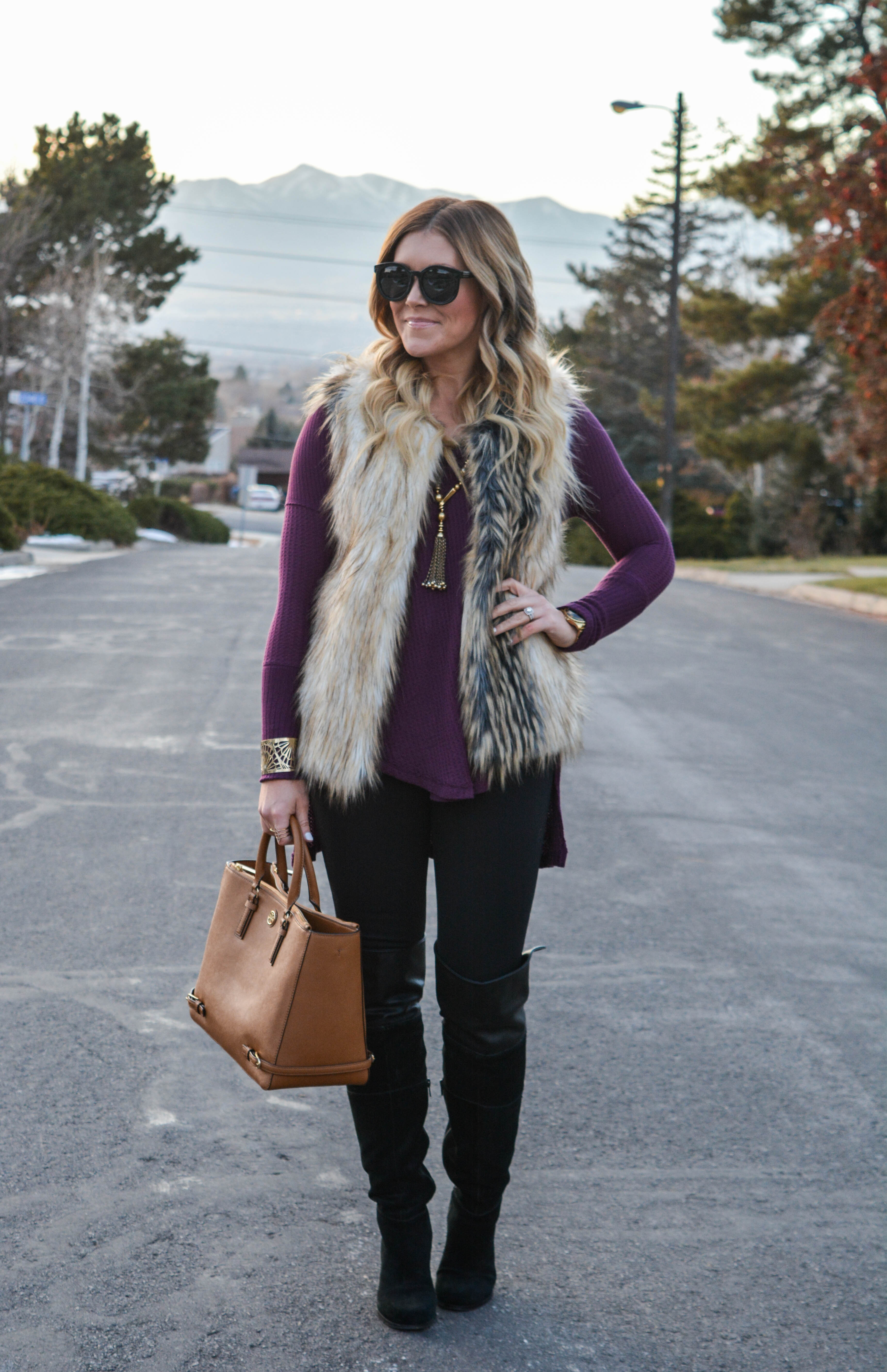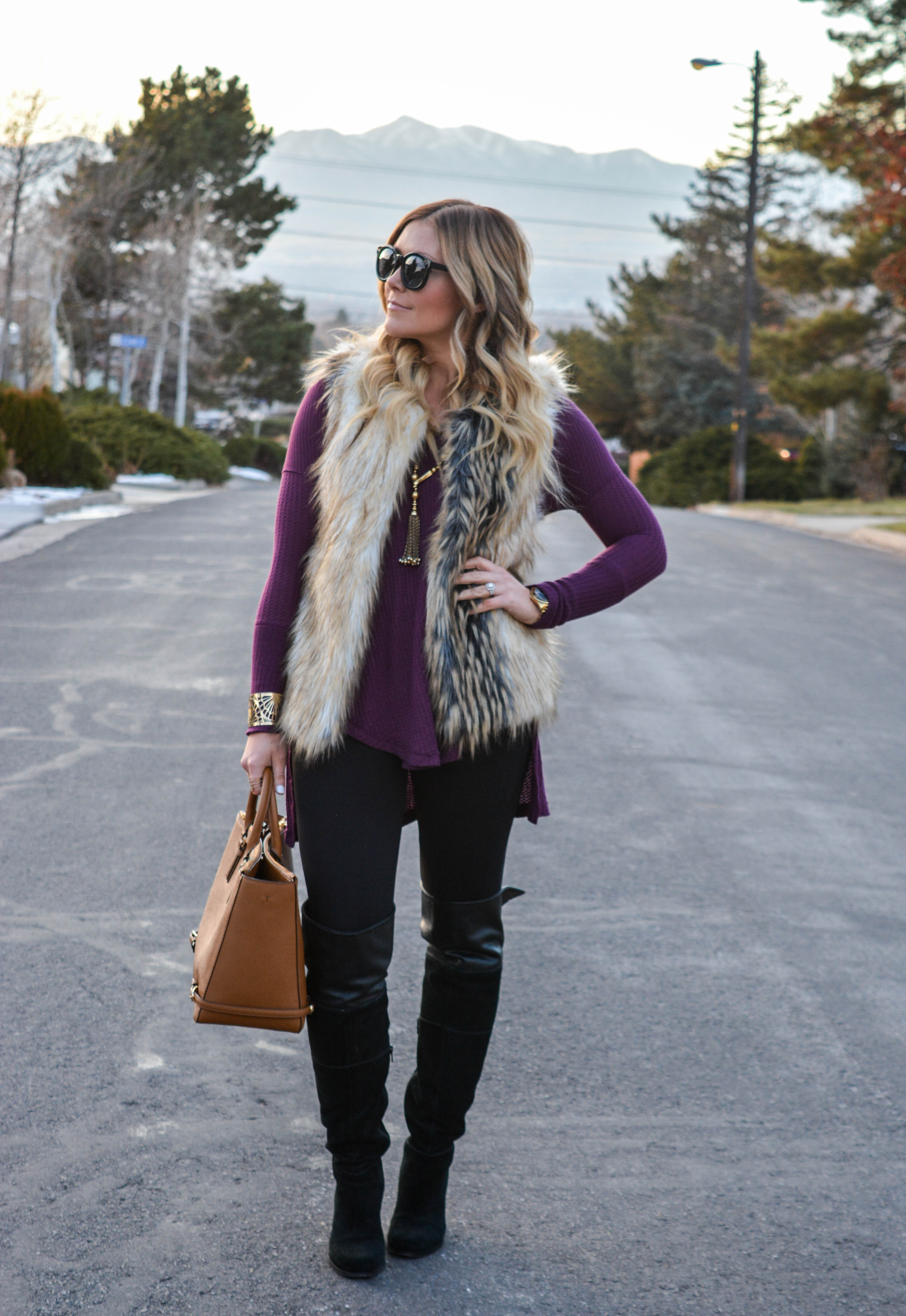 I’ve learned a lot about my own personal style since I started on the journey of writing this blog. I’ve learned that I like pants and jeans. A lot. I only like to wear dresses and skirts in the warm summer months. I hate tights. But I really like button down shirts. I love jewelry and accessories, but even though I own a lot of fun costume jewelry (and good jewelry too), I find that I tend to gravitate towards the same pieces on a daily basis. And while I probably dress up a little more than most of my friends, I would still define my style as casual. I’ve learned that glam isn’t necessarily a go-to look for me, but it is definitely one that I enjoy every now and again-especially when I feel like changing things up during the winter months. And I have found that perhaps the easiest, no-fuss way to achieve a glam look (while still maintaining a casual vibe), is pairing a faux (of course!) fur vest, a pair of over-the-knee boots, some chic gold jewelry, and a bold red lip back to a simple sweater and favorite pair of jeans. A glam look that even the most casual of us gals can easily achieve…