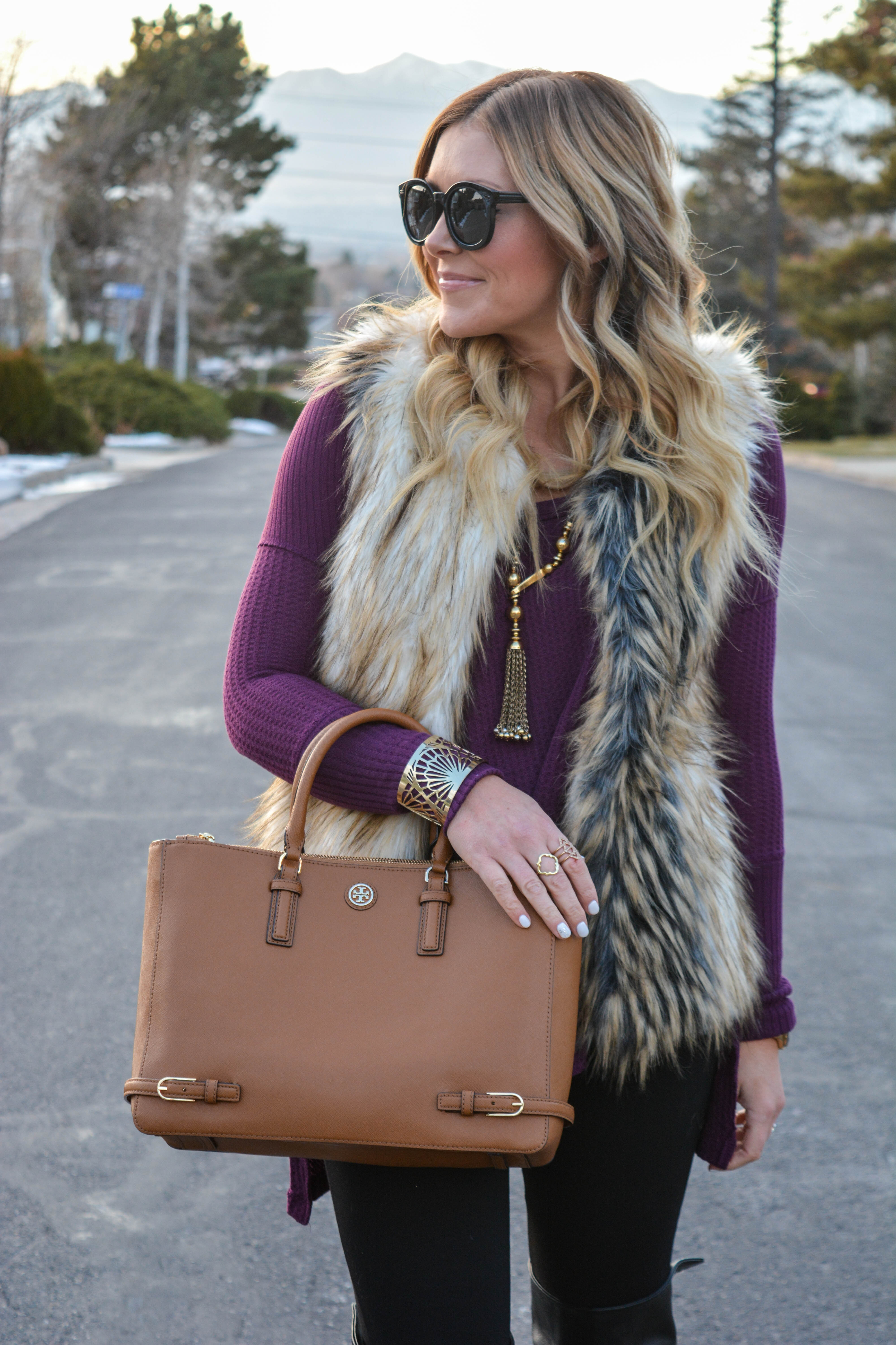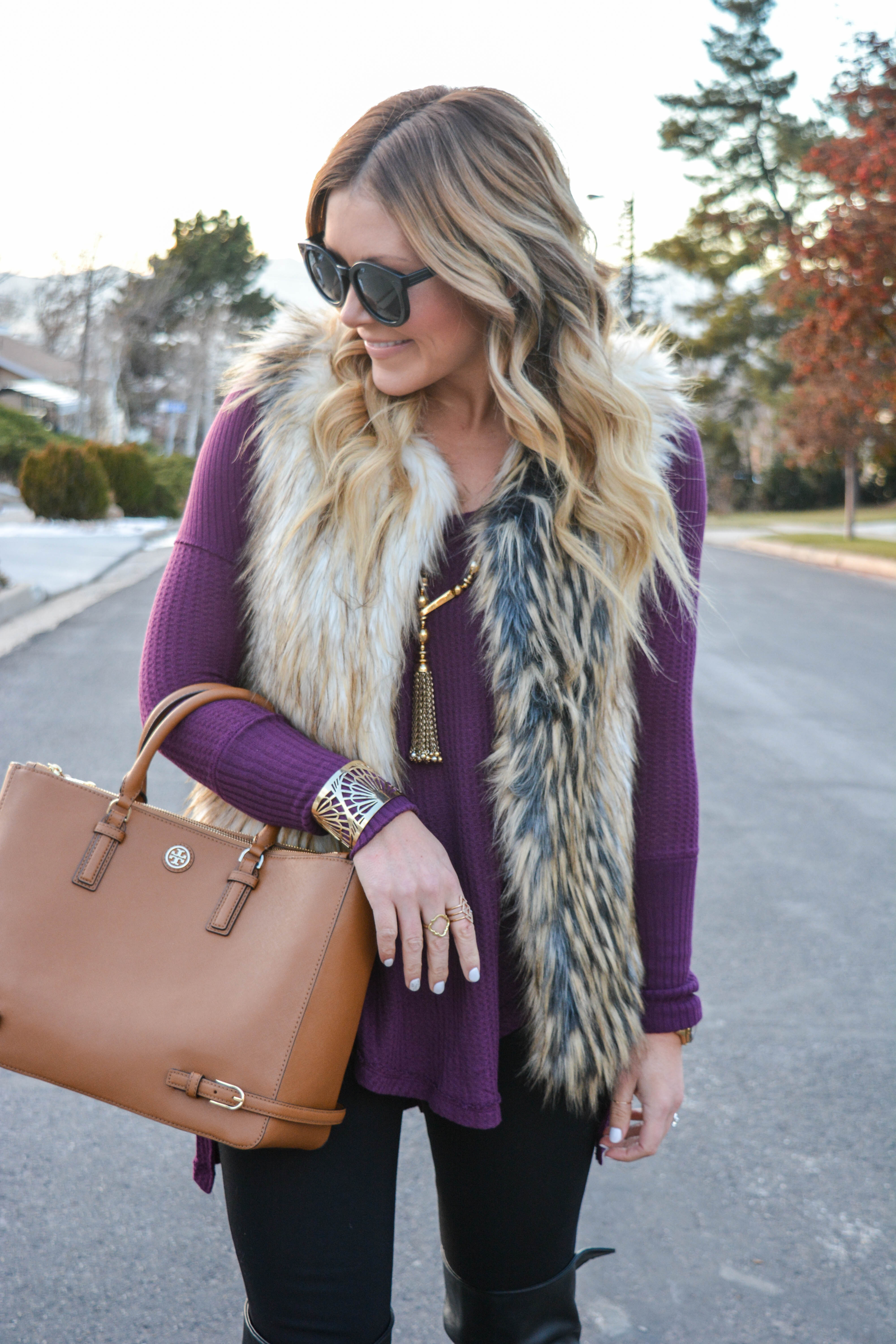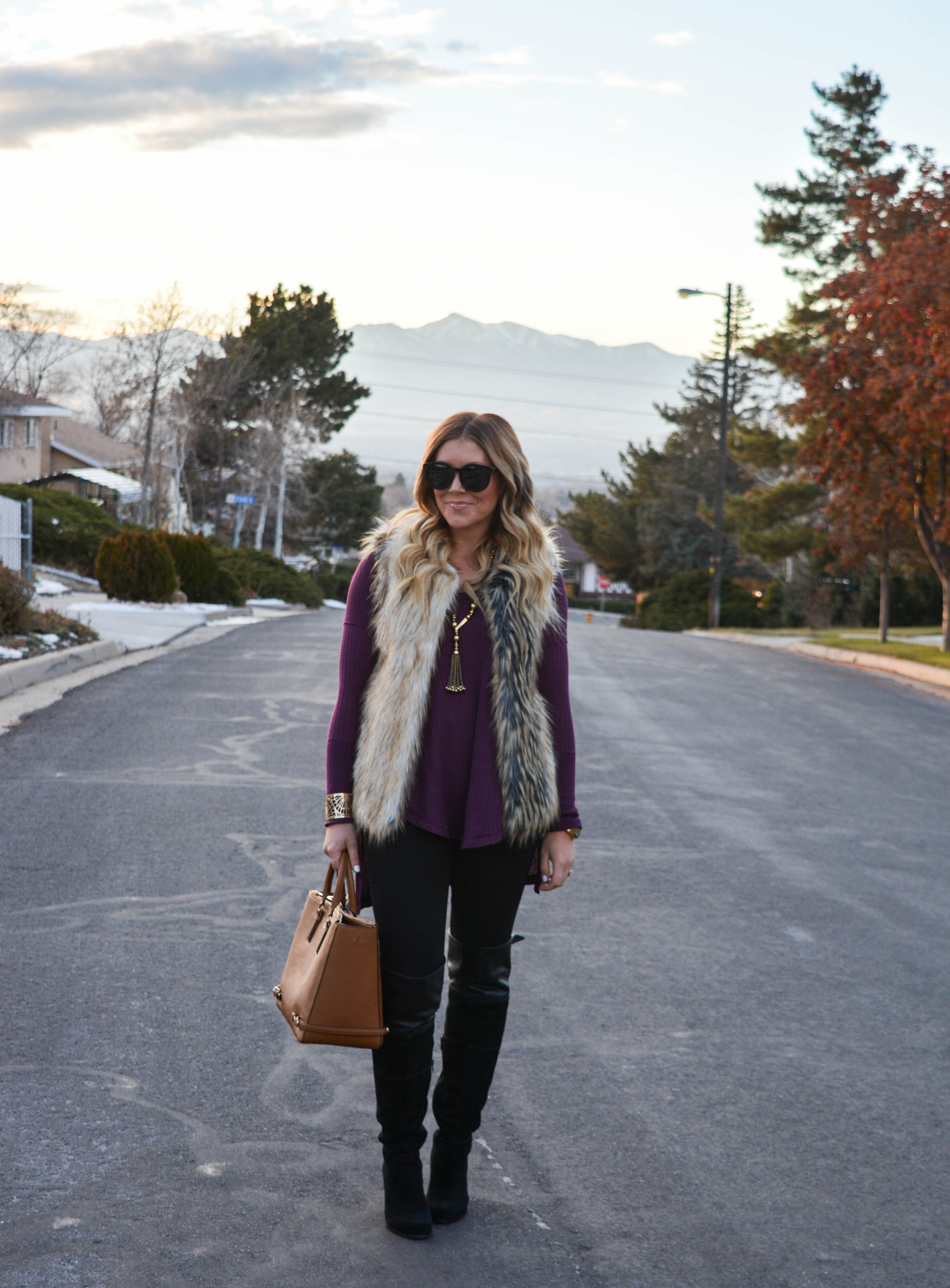 I’ve learned a lot about my own personal style since I started on the journey of writing this blog. I’ve learned that I like pants and jeans. A lot. I only like to wear dresses and skirts in the warm summer months. I hate tights. But I really like button down shirts. I love jewelry and accessories, but even though I own a lot of fun costume jewelry (and good jewelry too), I find that I tend to gravitate towards the same pieces on a daily basis. And while I probably dress up a little more than most of my friends, I would still define my style as casual. I’ve learned that glam isn’t necessarily a go-to look for me, but it is definitely one that I enjoy every now and again-especially when I feel like changing things up during the winter months. And I have found that perhaps the easiest, no-fuss way to achieve a glam look (while still maintaining a casual vibe), is pairing a faux (of course!) fur vest, a pair of over-the-knee boots, some chic gold jewelry, and a bold red lip back to a simple sweater and favorite pair of jeans. A glam look that even the most casual of us gals can easily achieve…