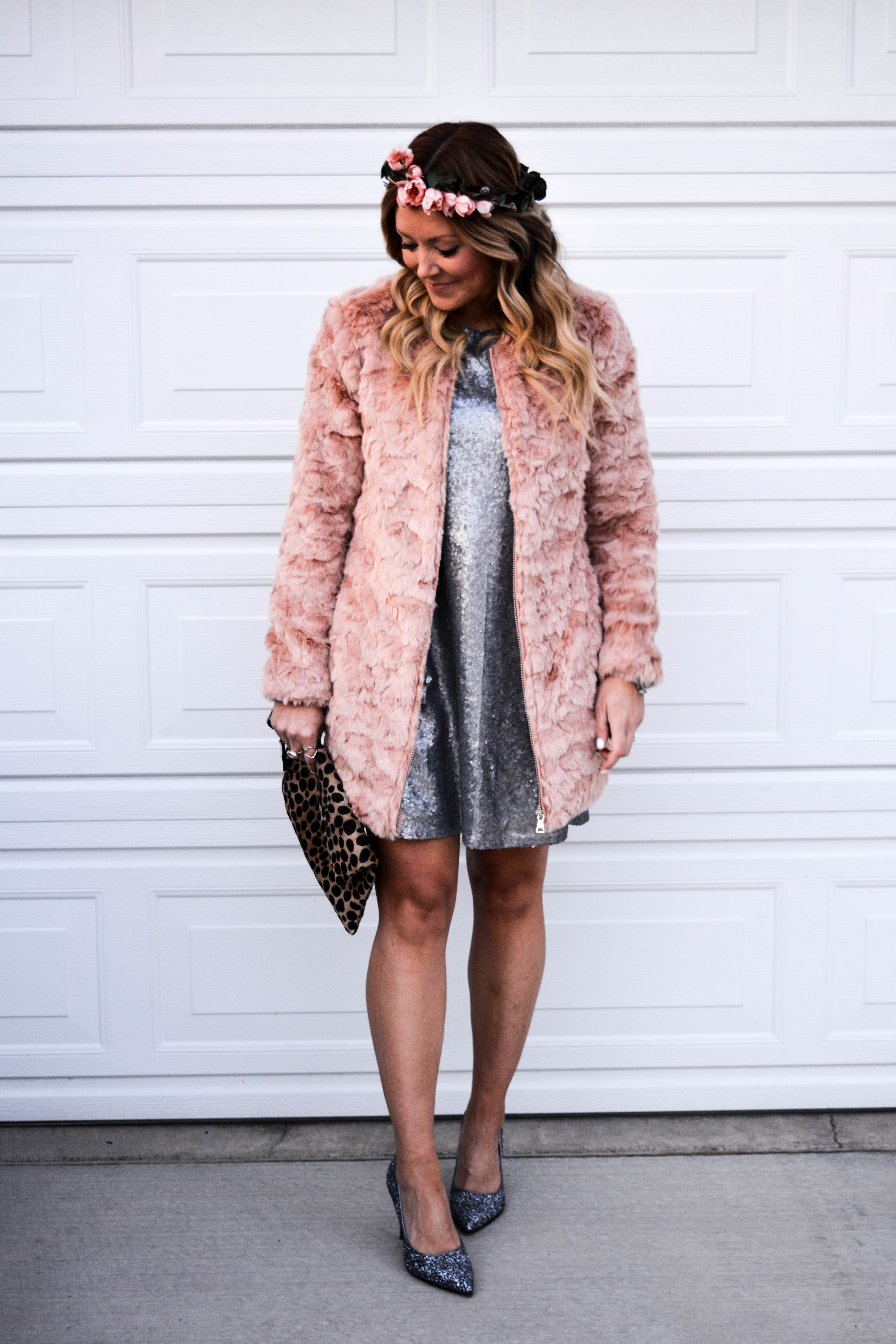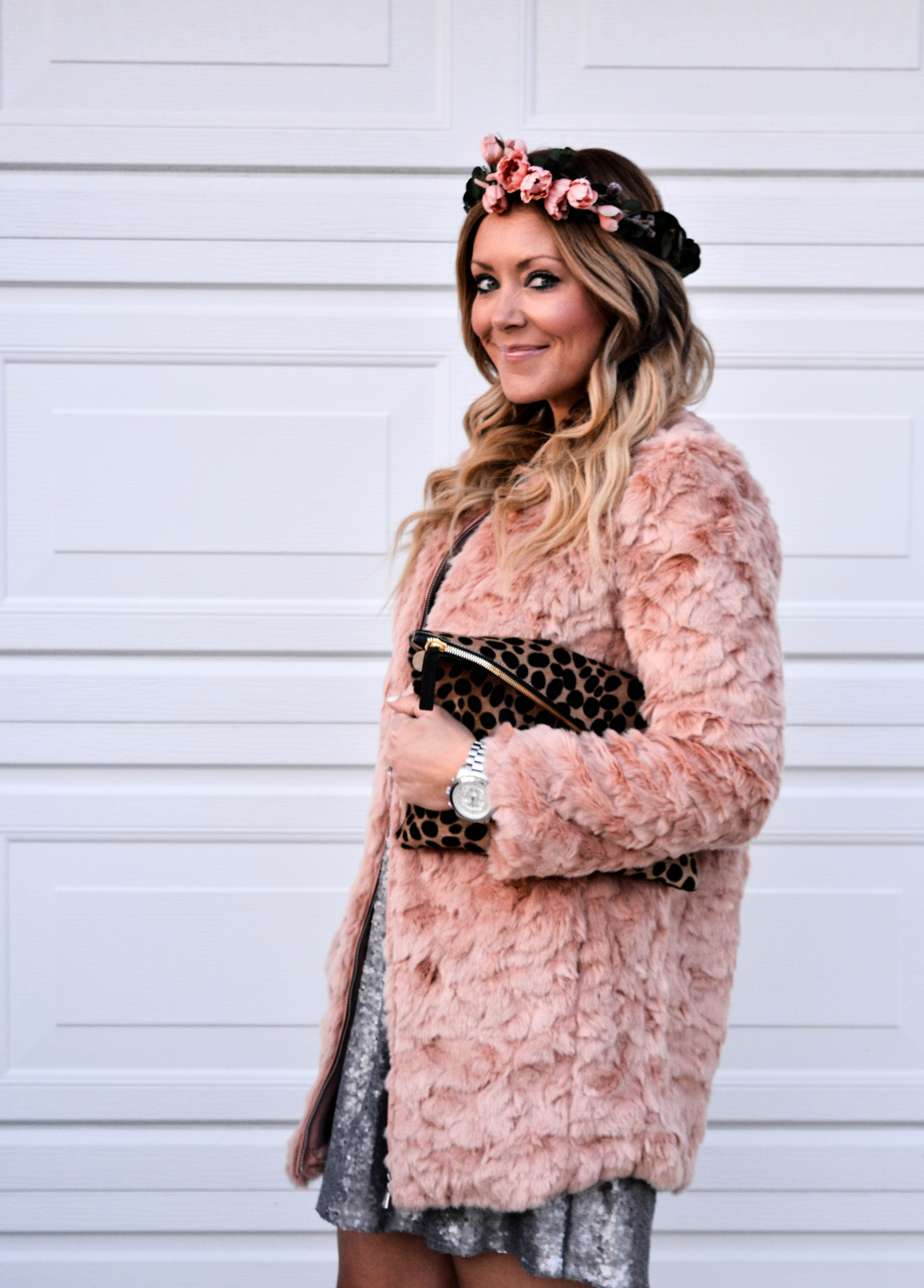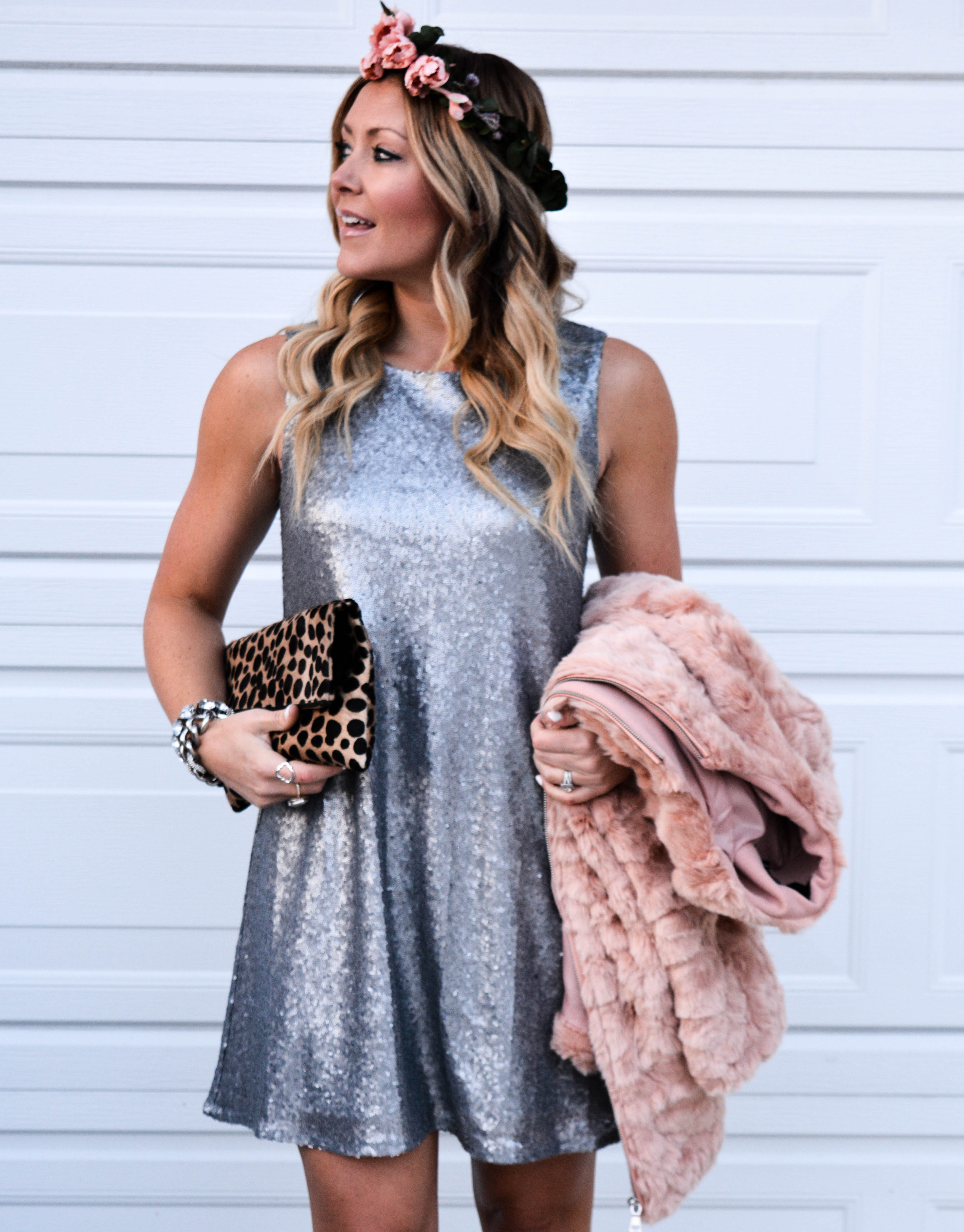 Dress: Fira Boutique c/o (under $80!) | Jacket: Forever21 (under $40-seriously, this jacket is super cozy and looks SO expensive! Don’t miss out on this one!) | Floral Crown: Miss Stevi Marie | Bracelets: JCrew, Juicy Couture(old), similar | Leopard Clutch: Clare Vivier | Glitter Pumps: Nine West (old), obsessed with these (take 25% off with code: FRIEND at checkout!)